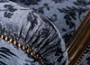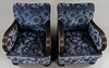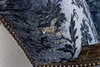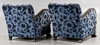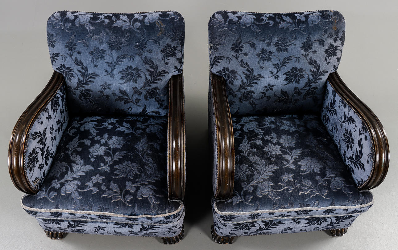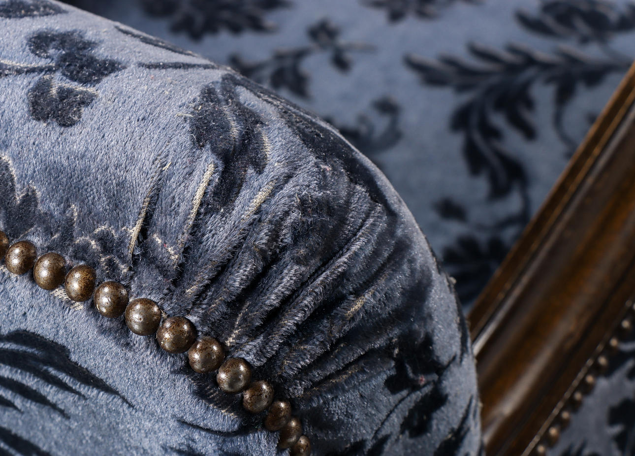 Trädetaljer i bonad björk, blå mönstrad textilklädsel.