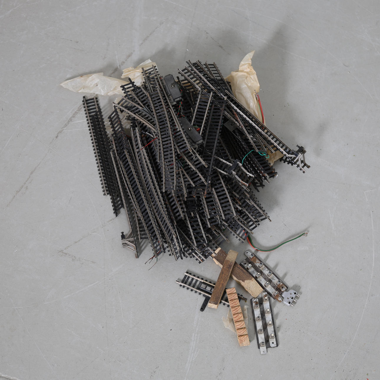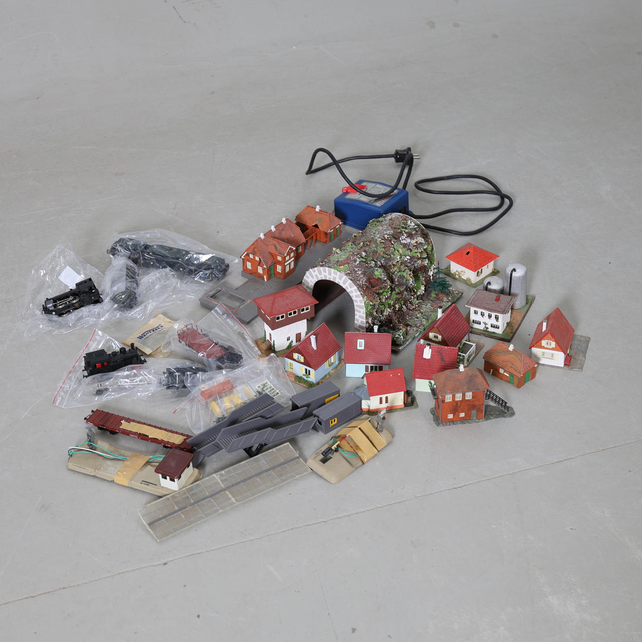Två kartonger. Lok med vagnar samt räls, transformator och landskapdelar.