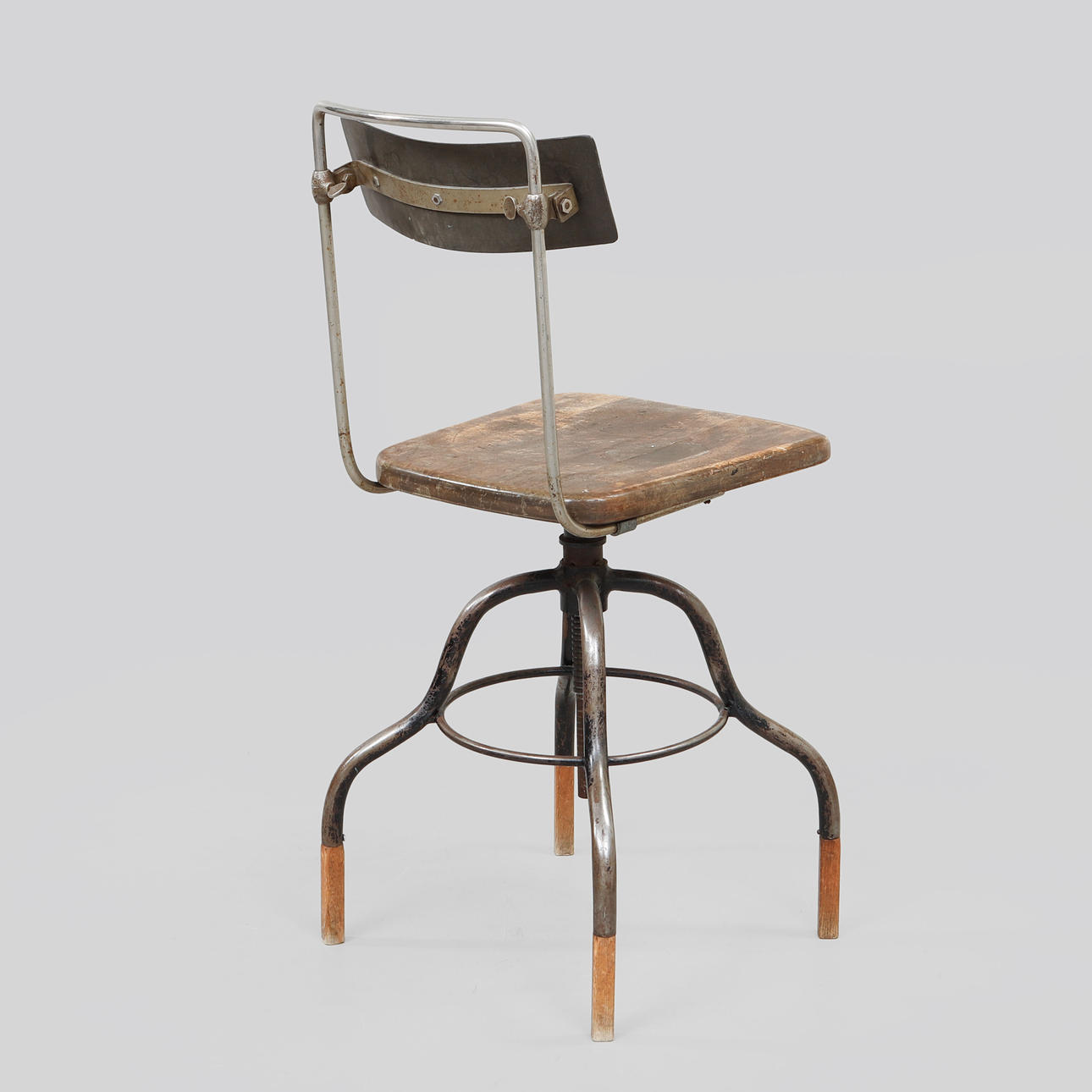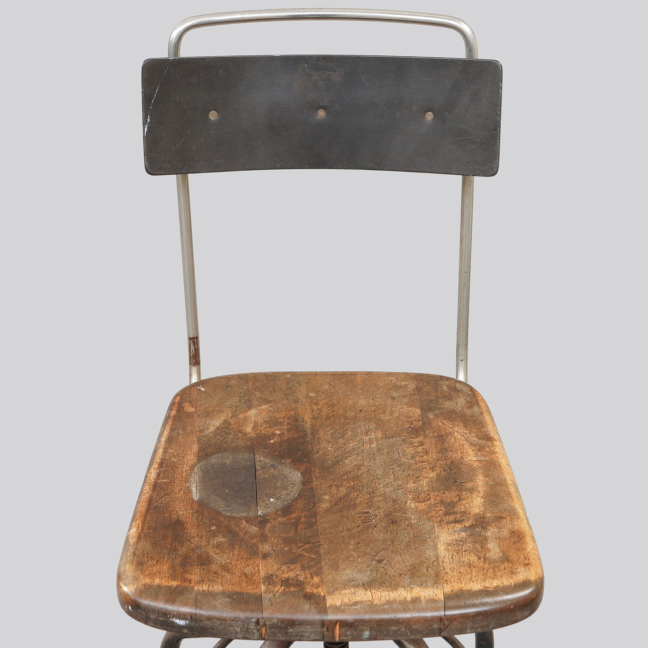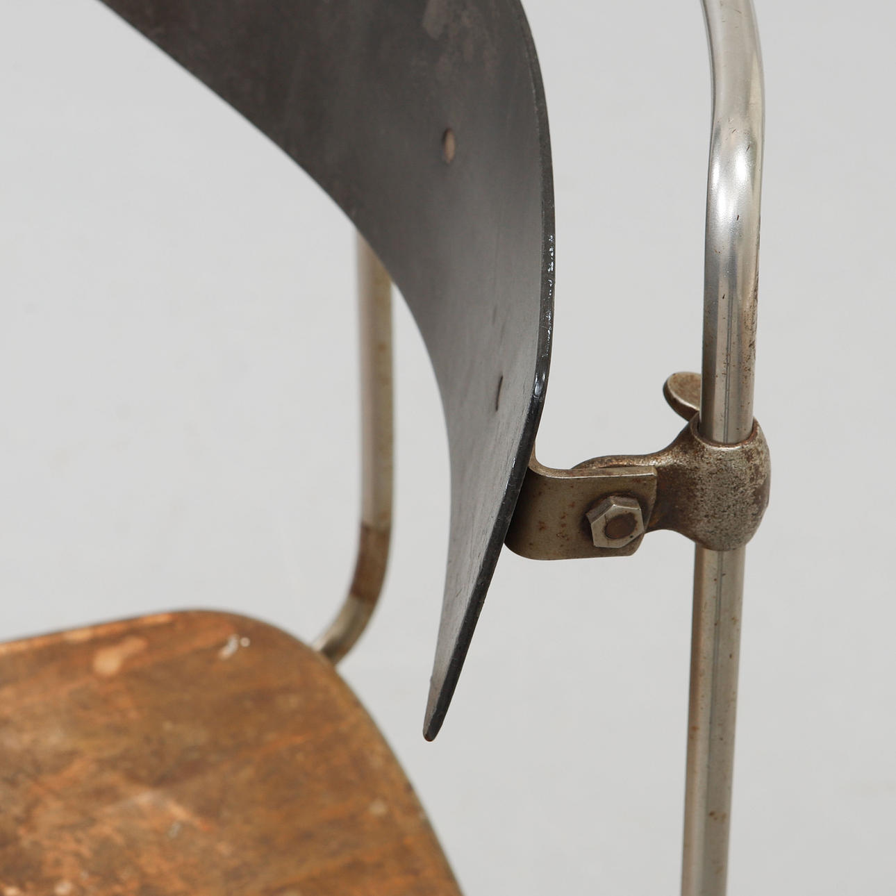 Trä och metall. Höj- och sänkbar samt ställbar ryggbricka. Bredd ca 38 cm, sitsshöjd vid katalogisering ca 53 cm, rygghöjd ca katalogisering ca 89 cm.