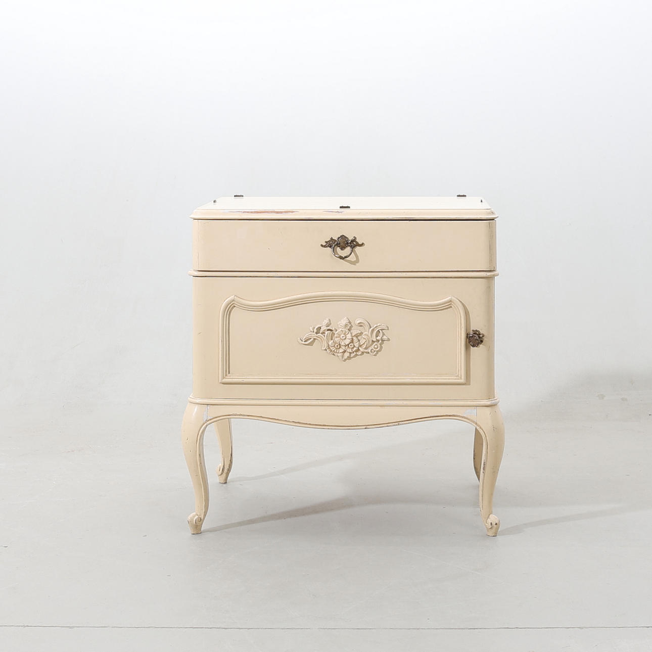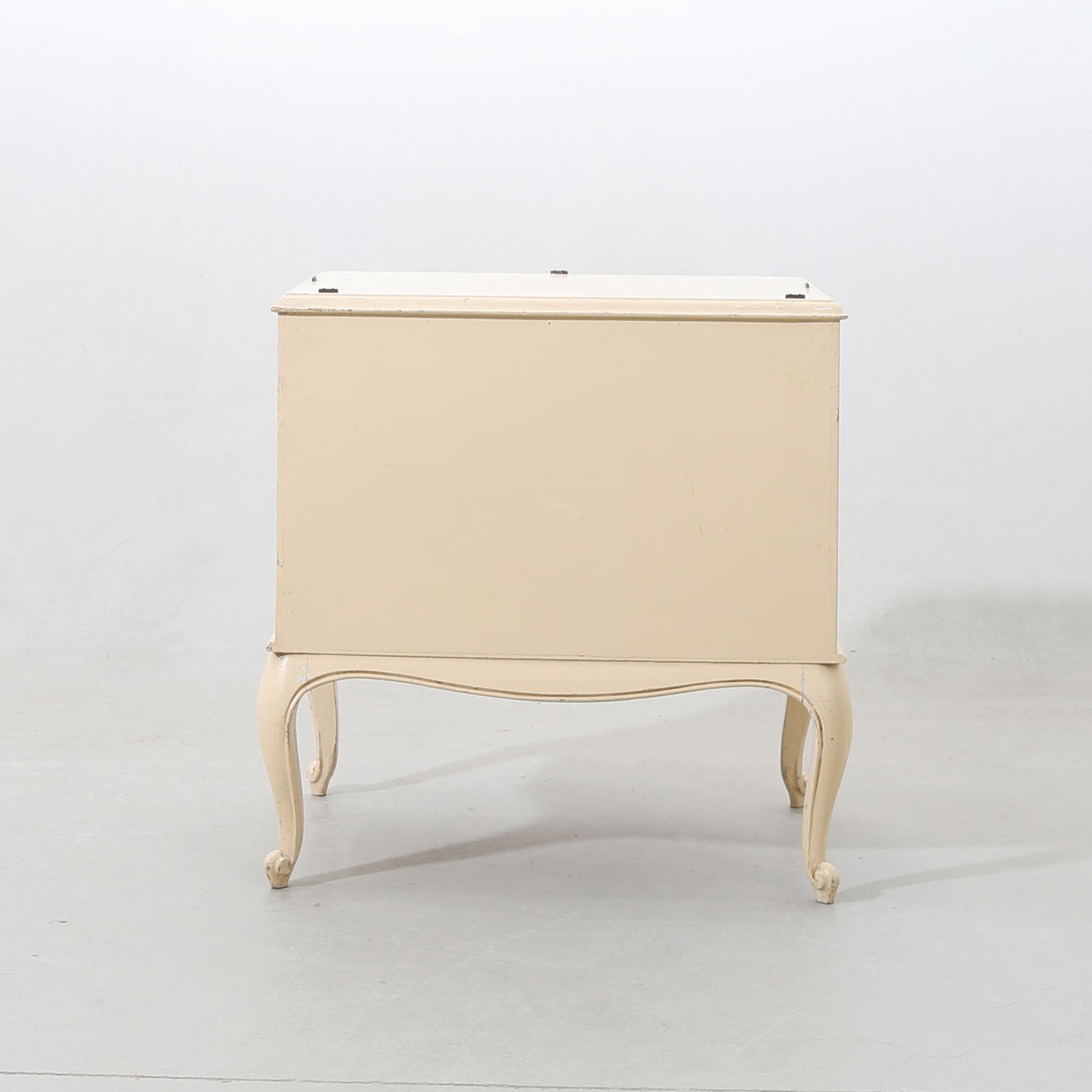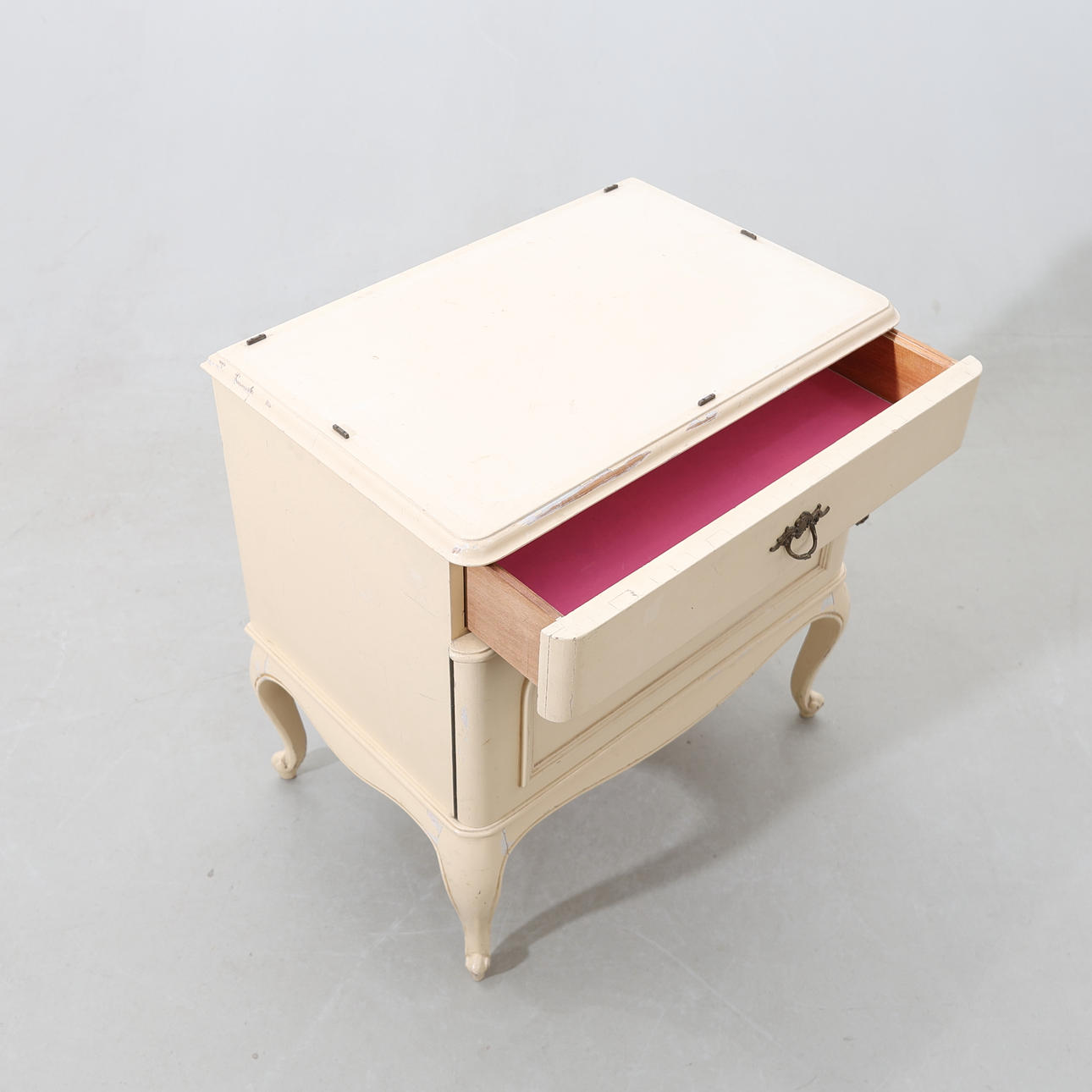 Bruksslitage. Repor och fläckar. Färgbortfall. Glasskiva saknas. Belag med slag.