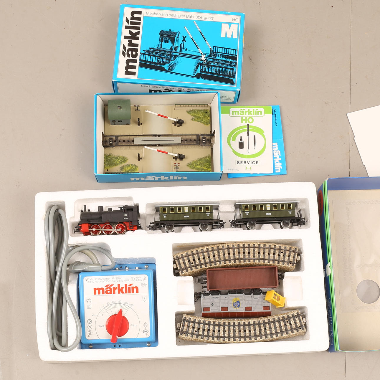 Lok, vagnar, räls, transformator m m.