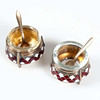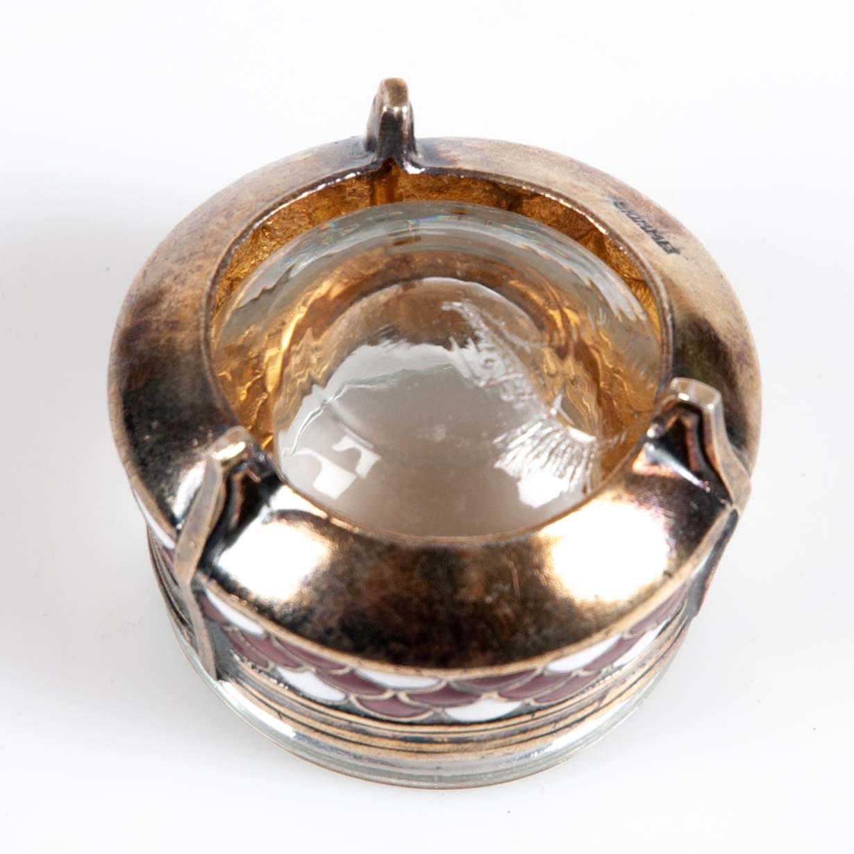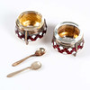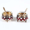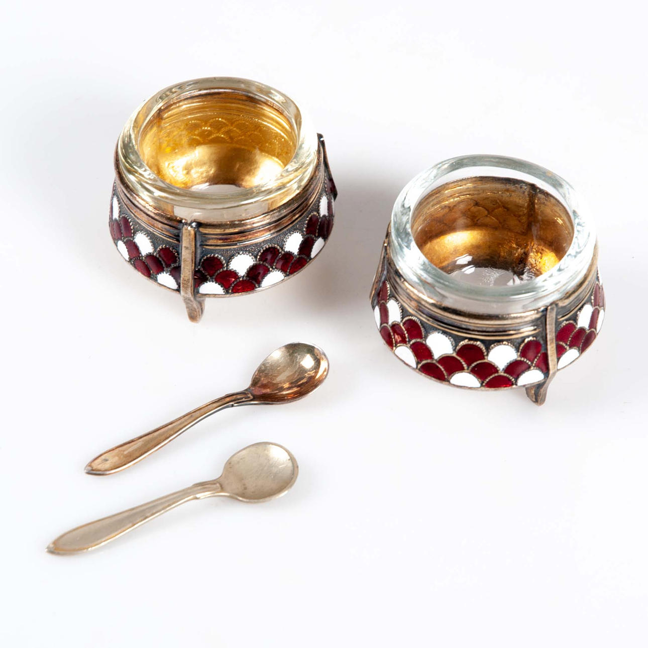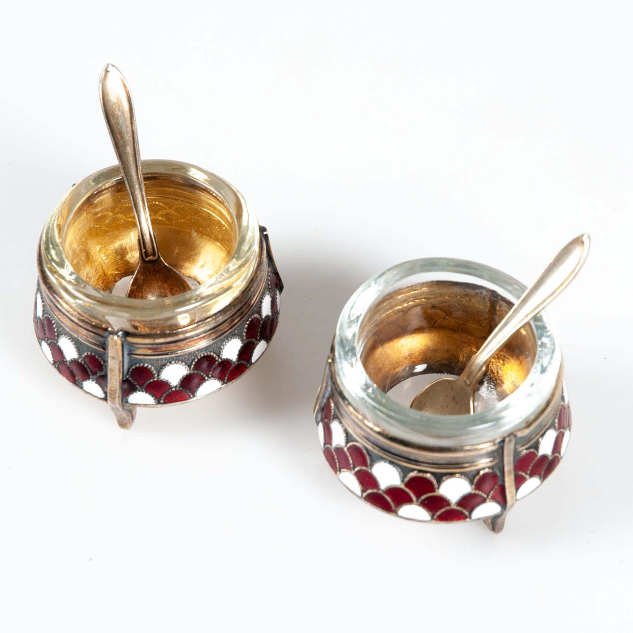 Dekorerade i röd och vit emalj. Invändiga glasinsatser.