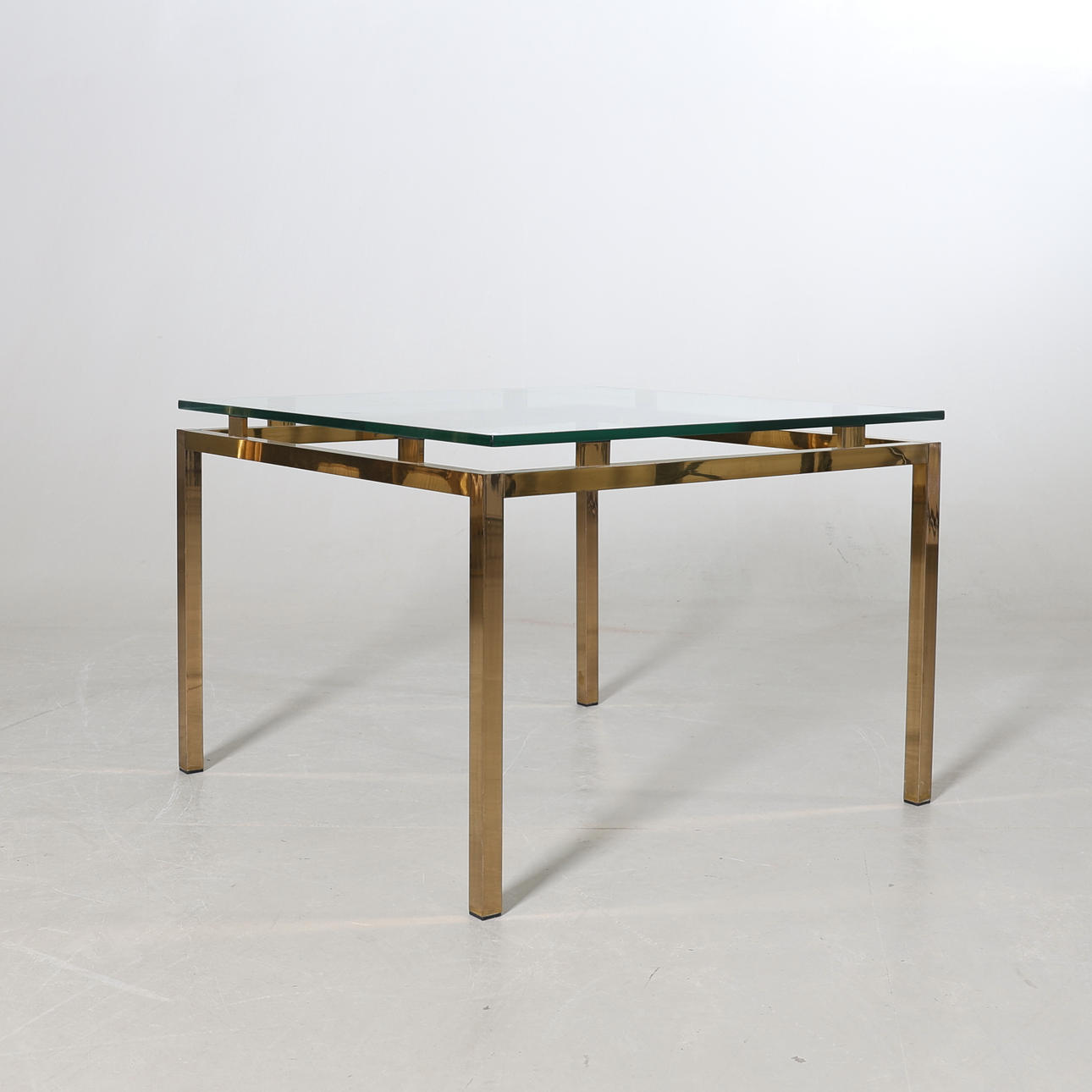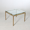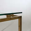 Soffbord med stomme i gulmetall, toppskiva i glas
