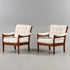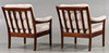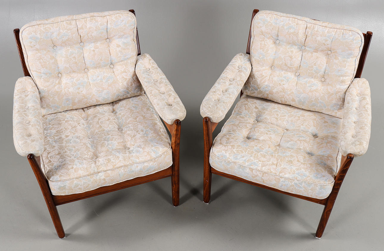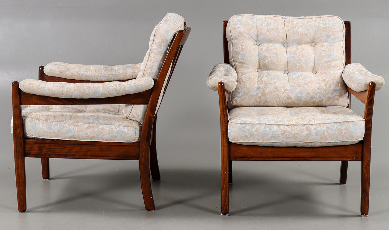 Mörkbetsade och lackade stommar, mönstrade dynor med ljus textilklädsel.
