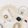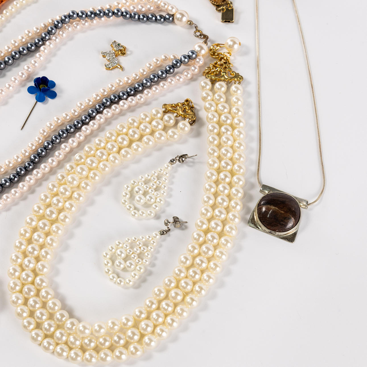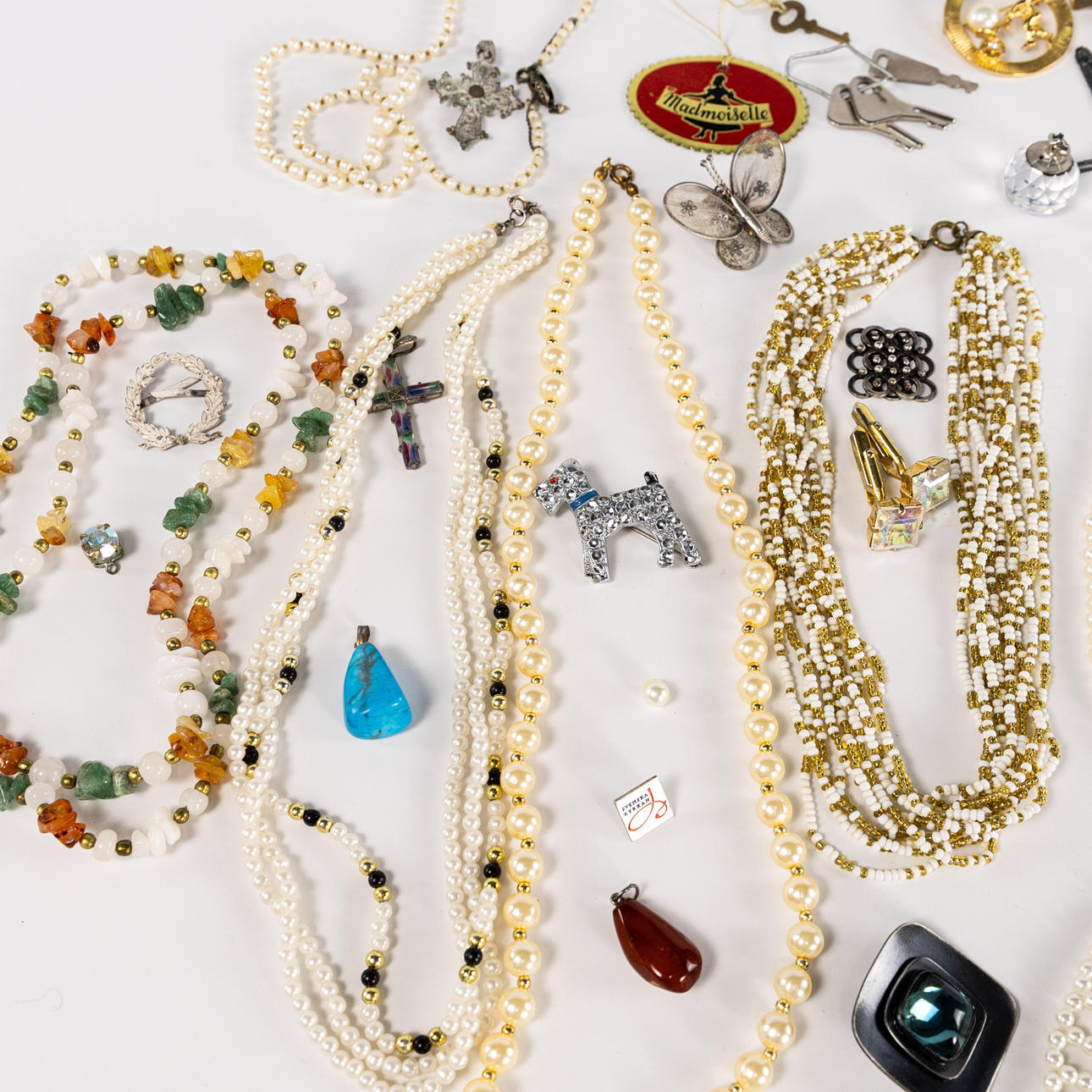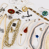 Smyckesskrin fyllt med smycken och bijouterier. Skrinets mått 26 x 16 x 6,5 cm.