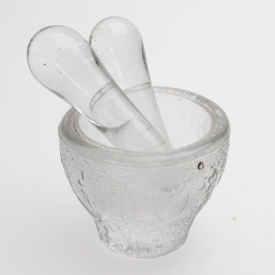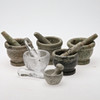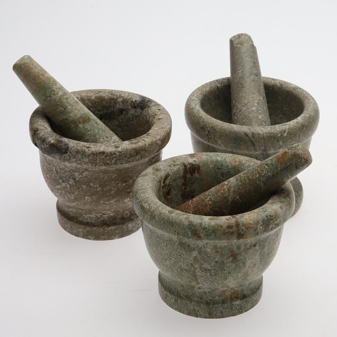 Bruksskick. Två mortlar med nagg på kanten, en stöt som är av och lagad.