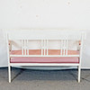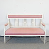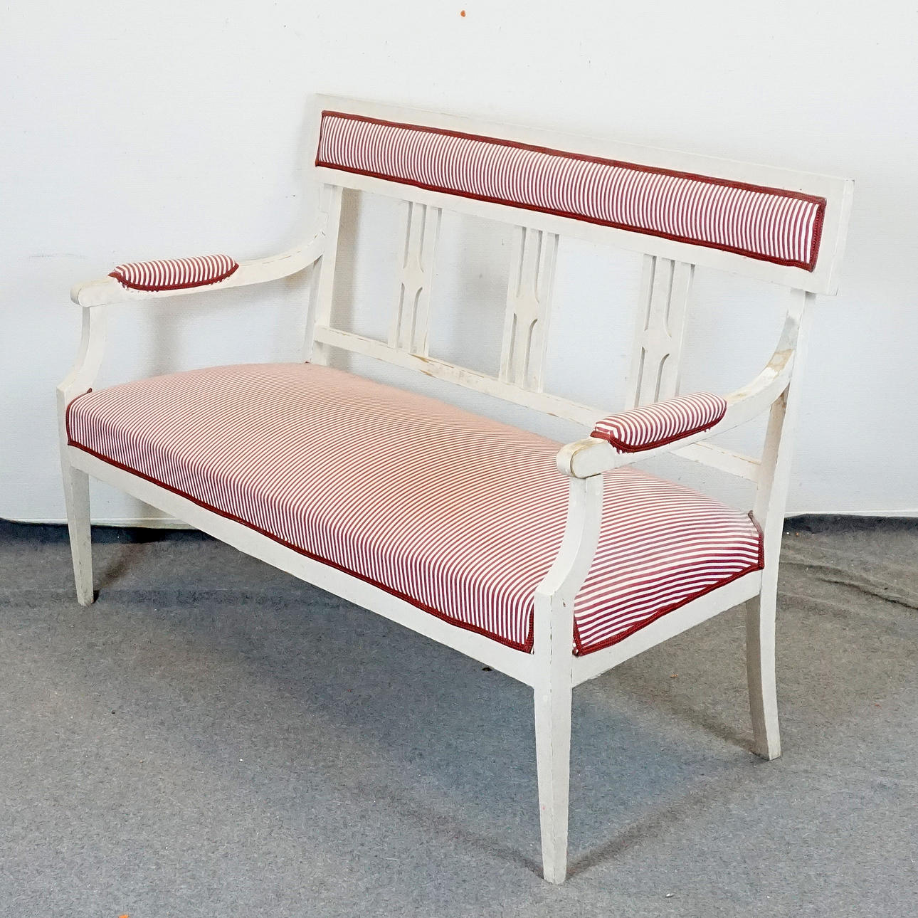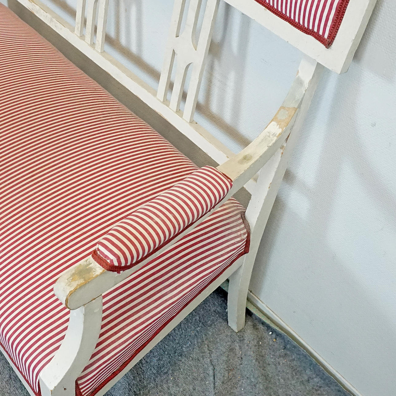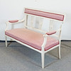 Vitmålat trä, rygg med genombruten dekor. Fast stoppad klädd i rödmönstrad textil.