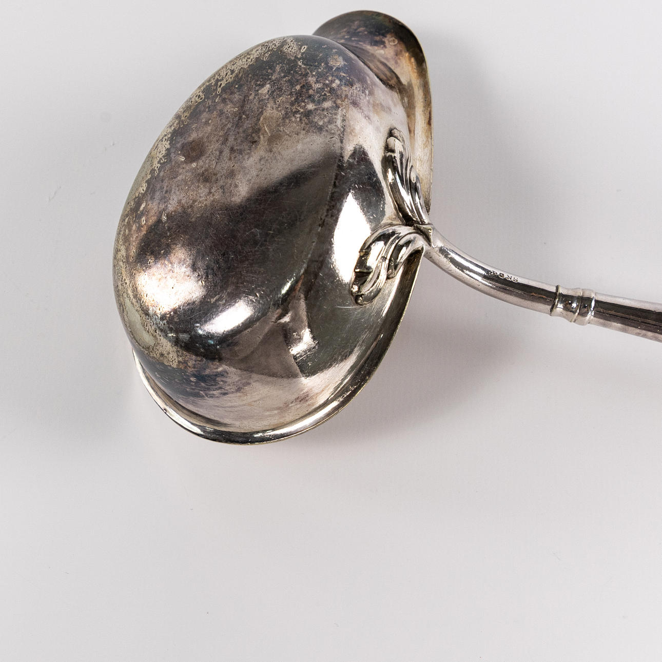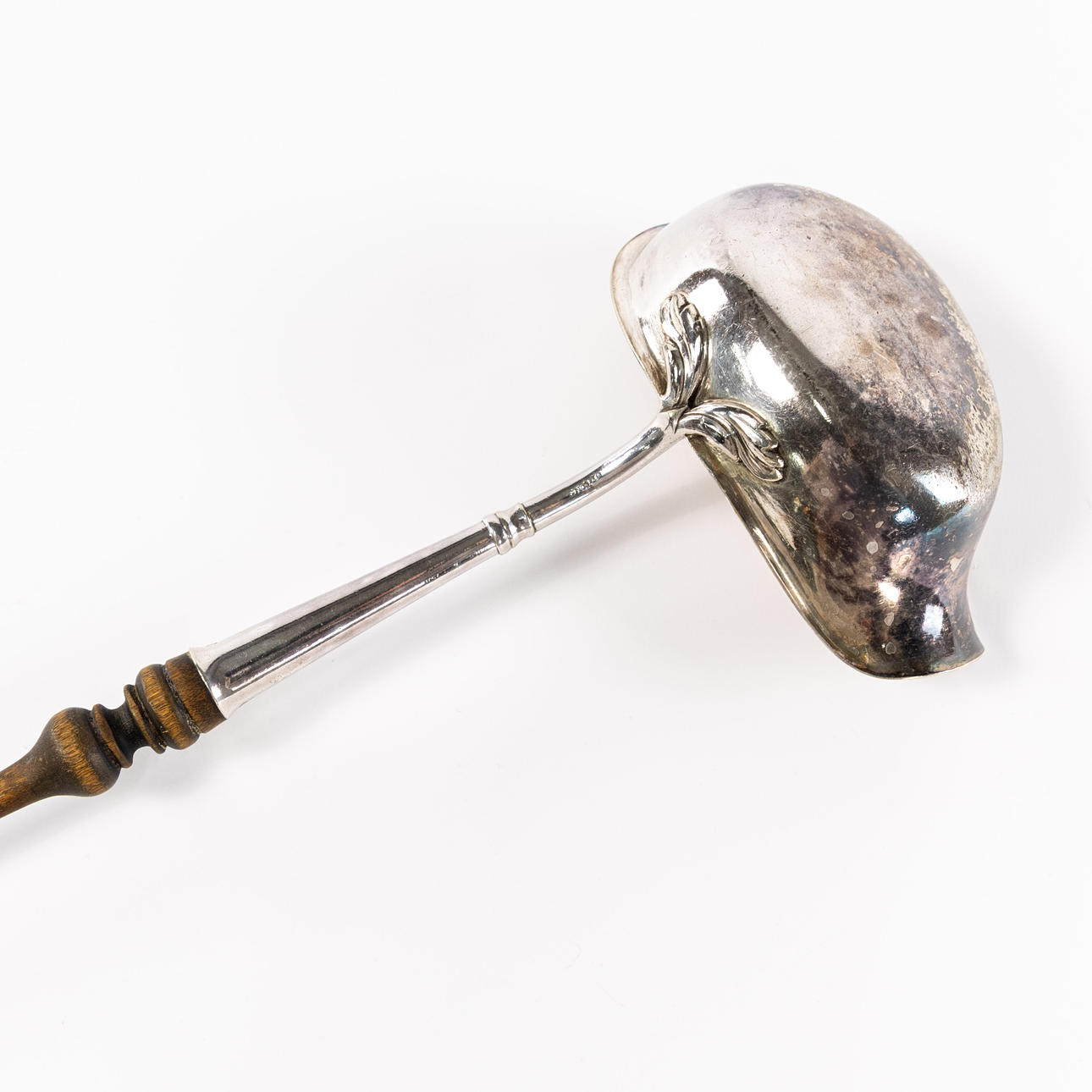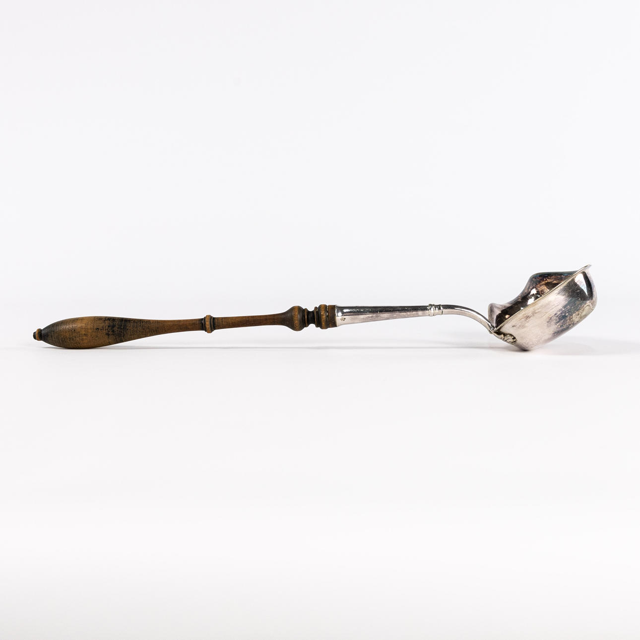 Soppslev, nysilver med grepp av trä, 1900-tal, längd 33 cm.