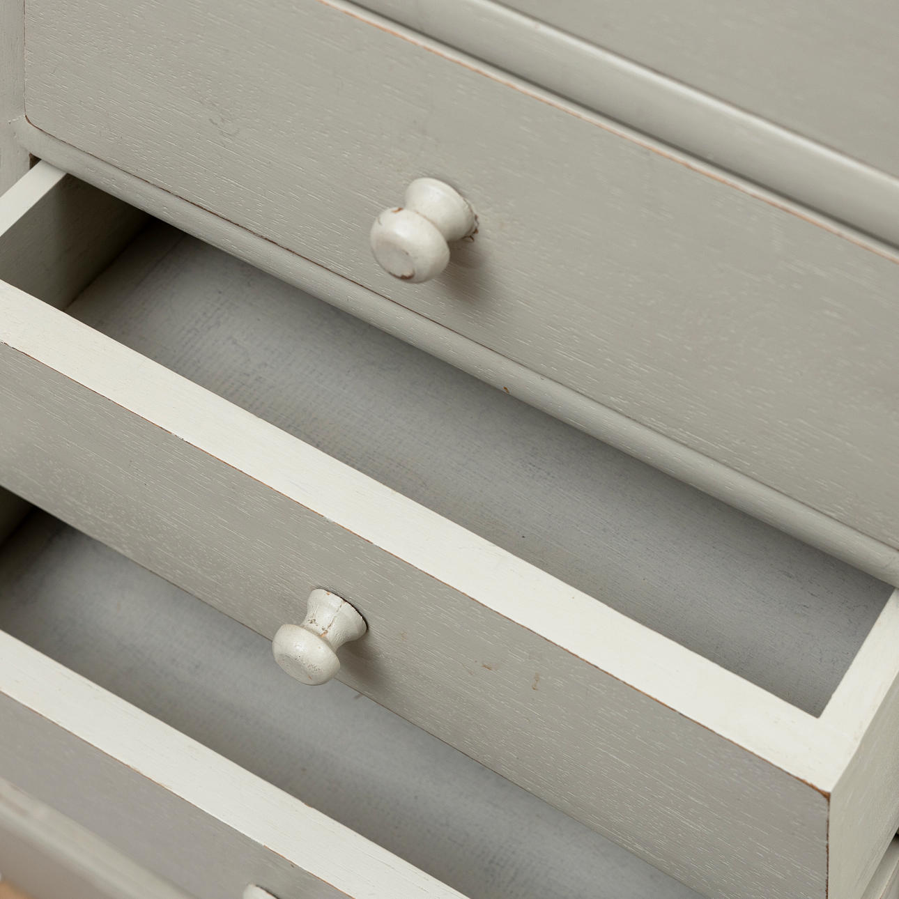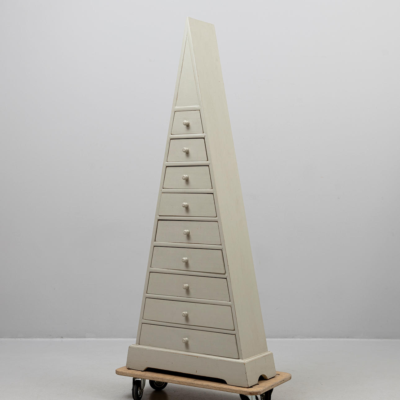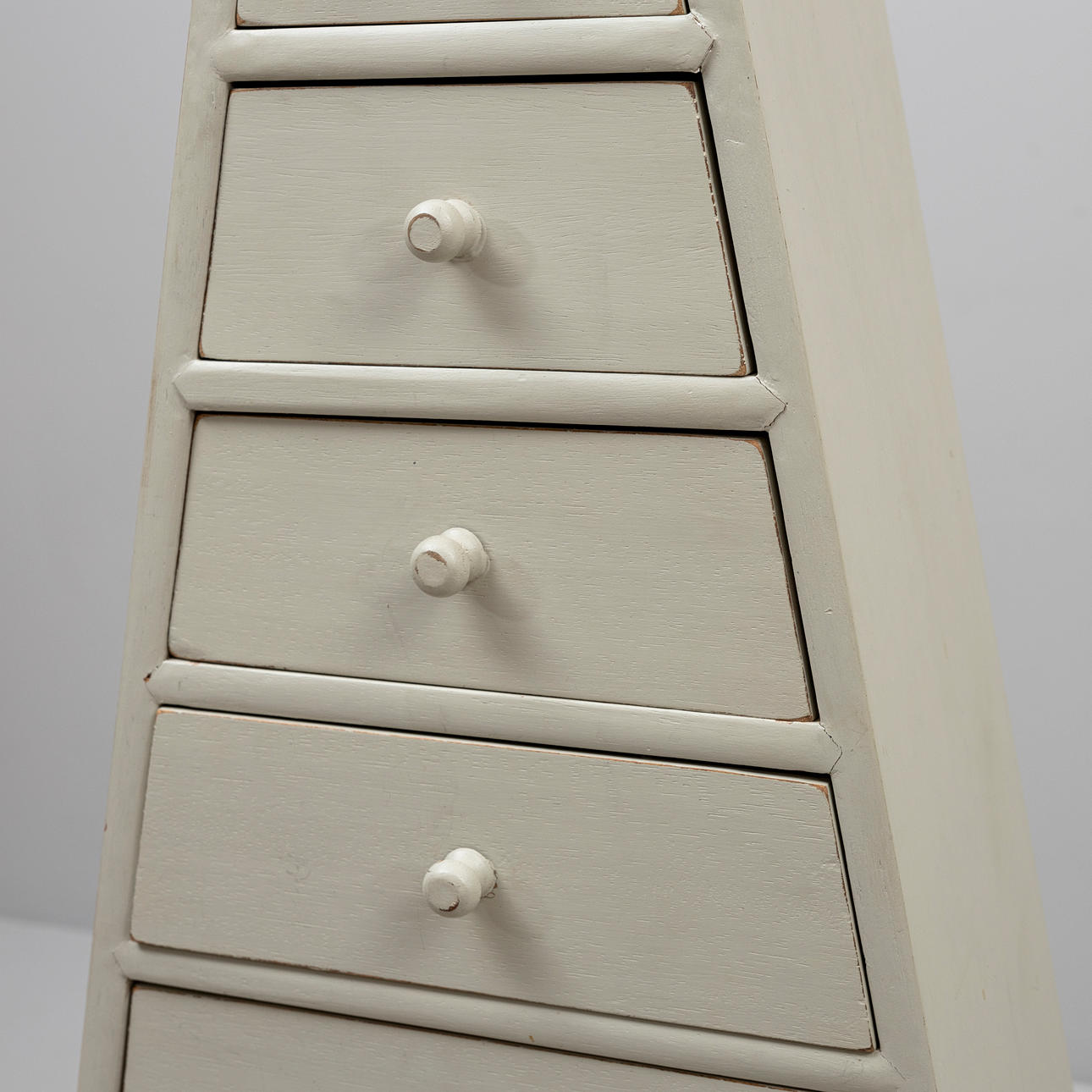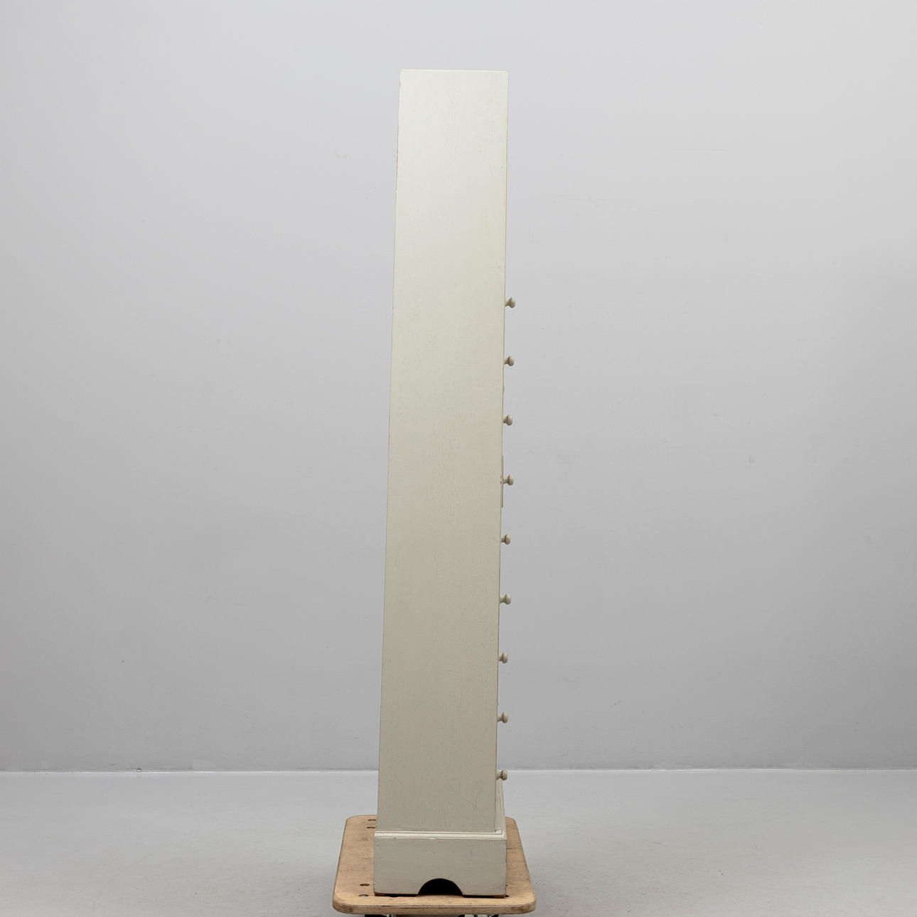 9 lådor. Bas med bredd 70, djup 26 cm. Höjd ca 169,5 cm. Omärkt.