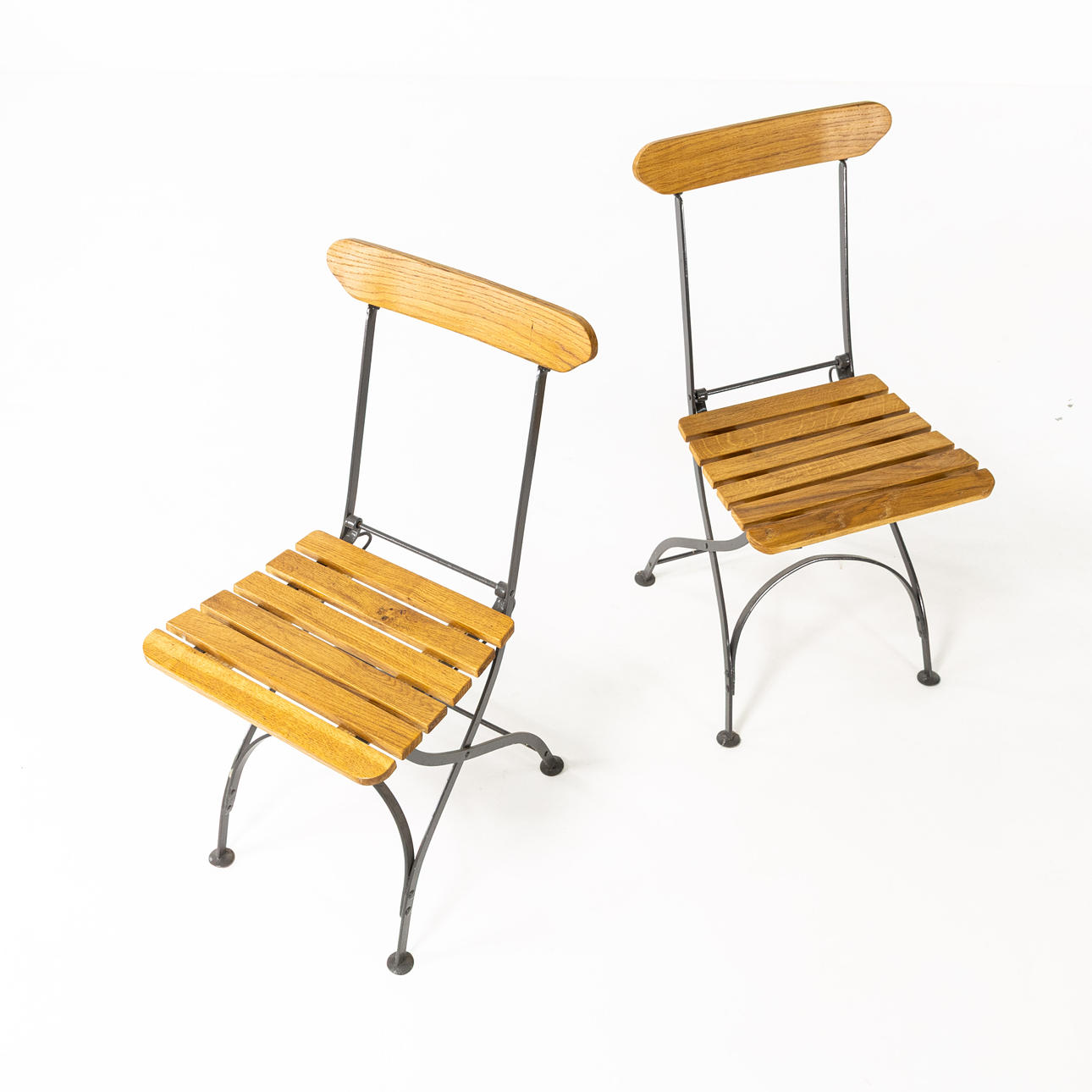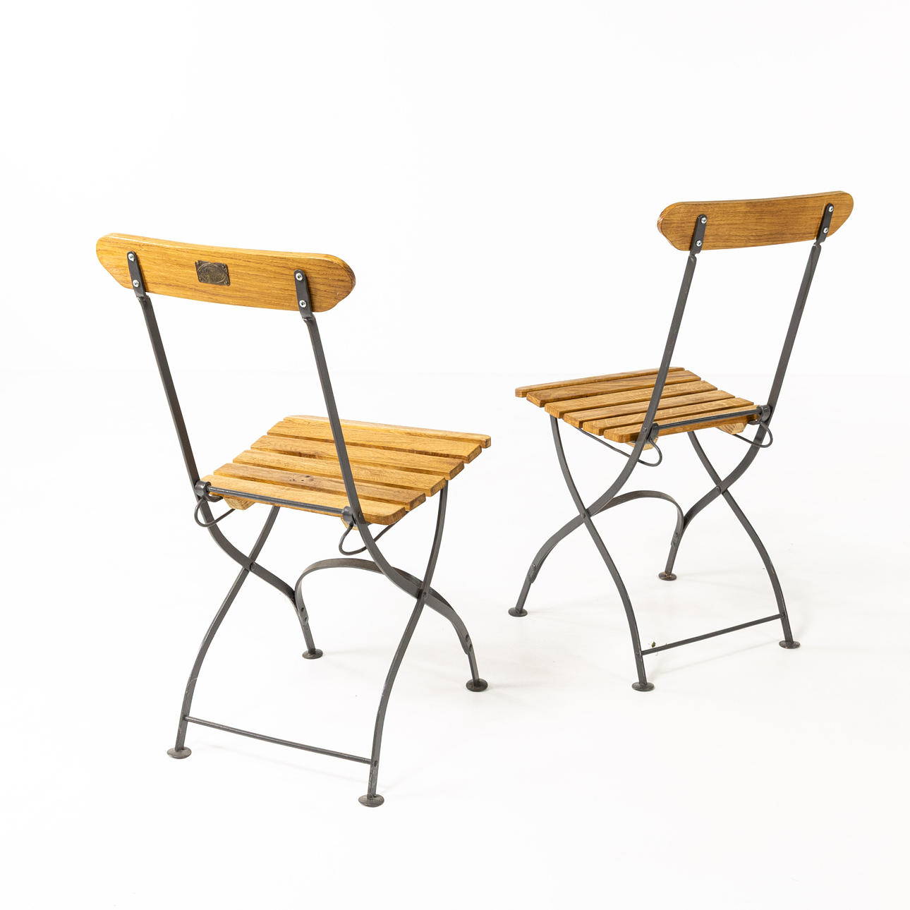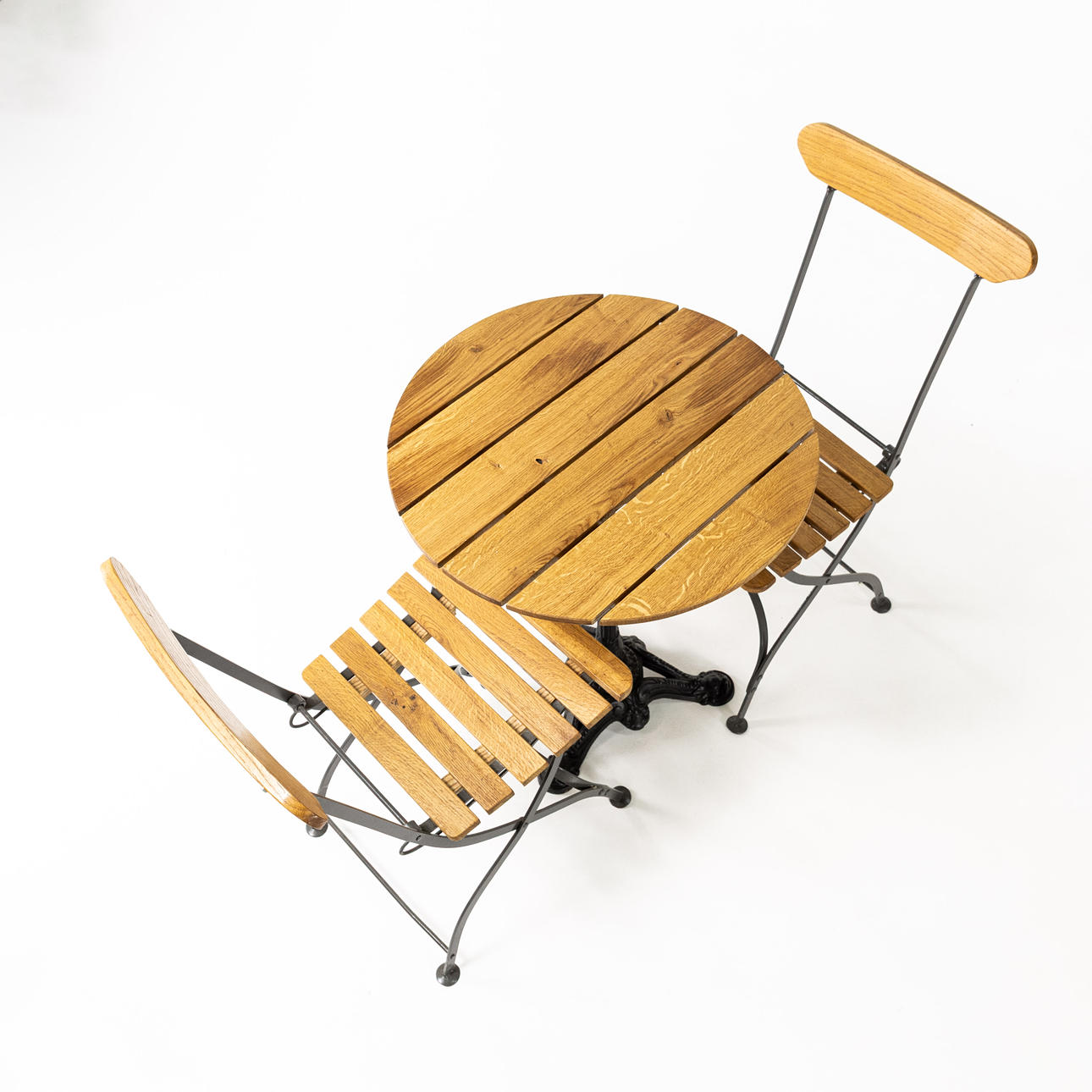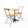 Cafégrupp, 3 delar, stomme i lackerad metall, skiva samt rygg och sits i lackerad ek, bl. a. två bryggeristolar brickmärkta Wedevågs Bruk