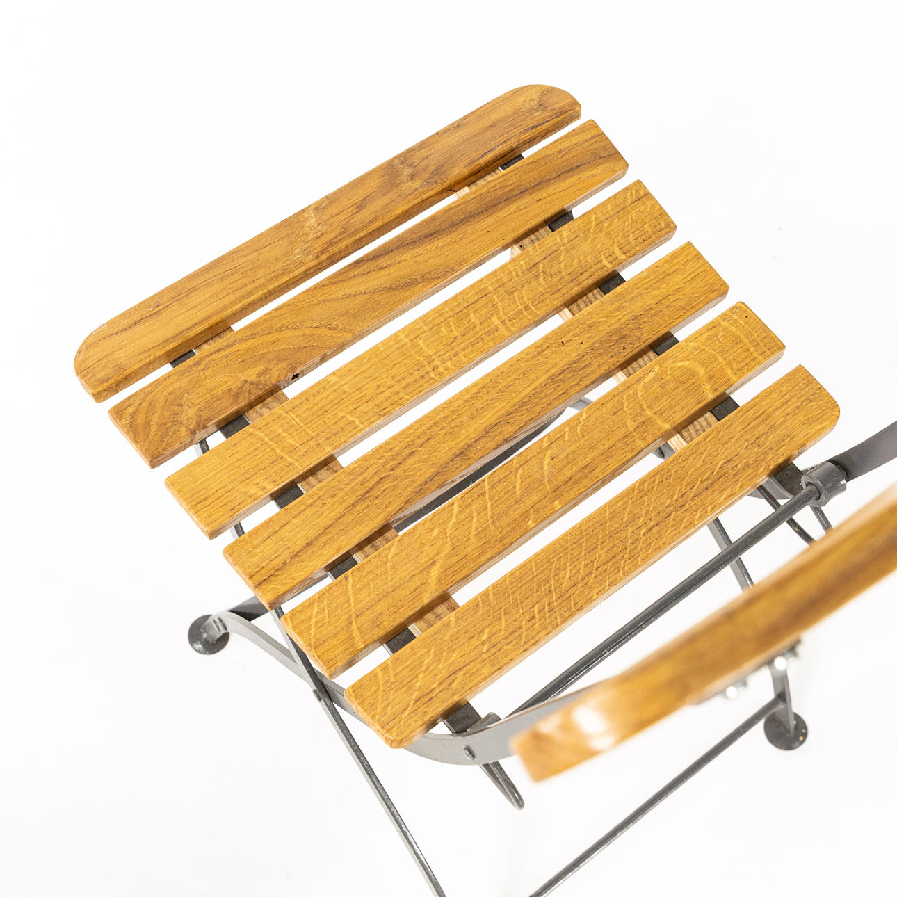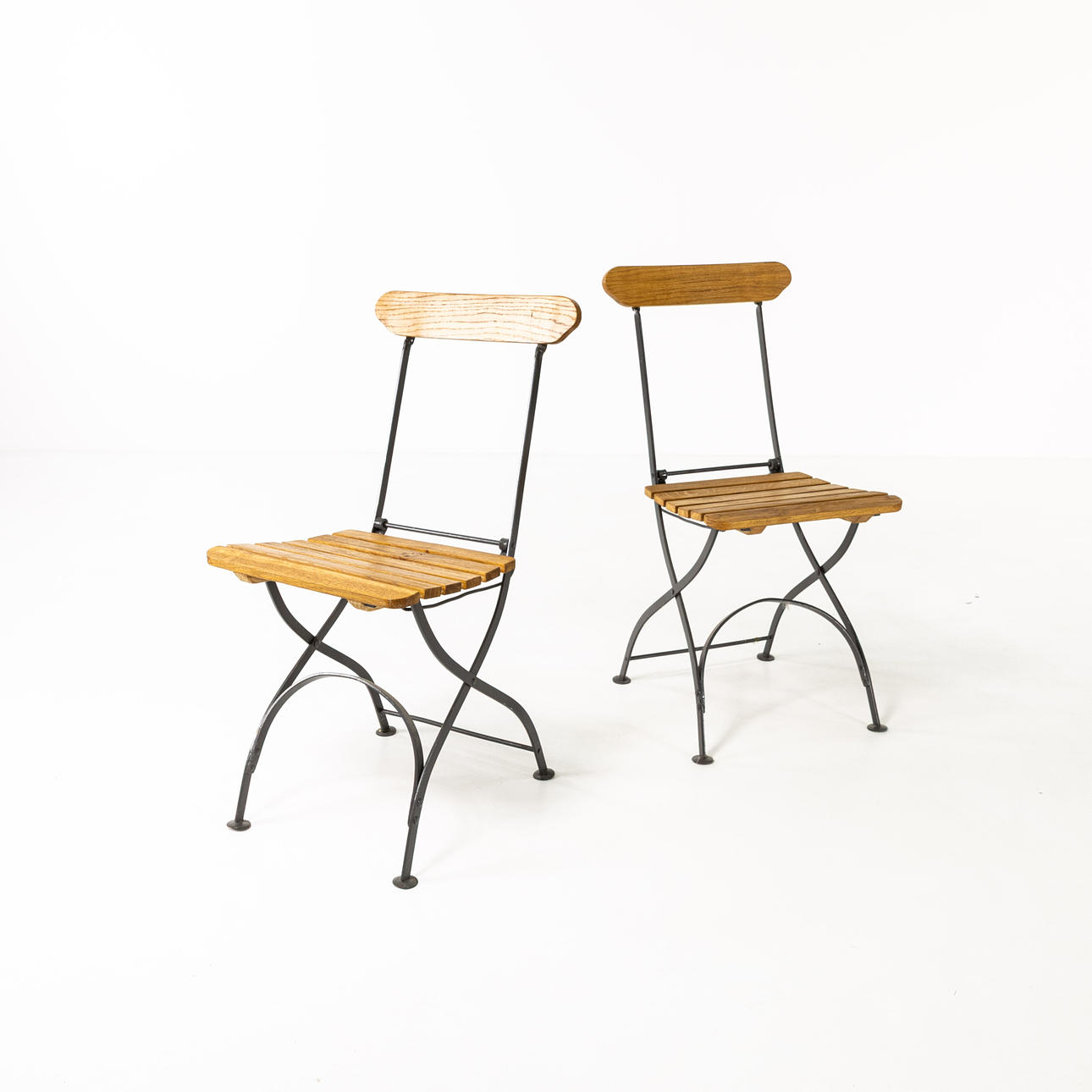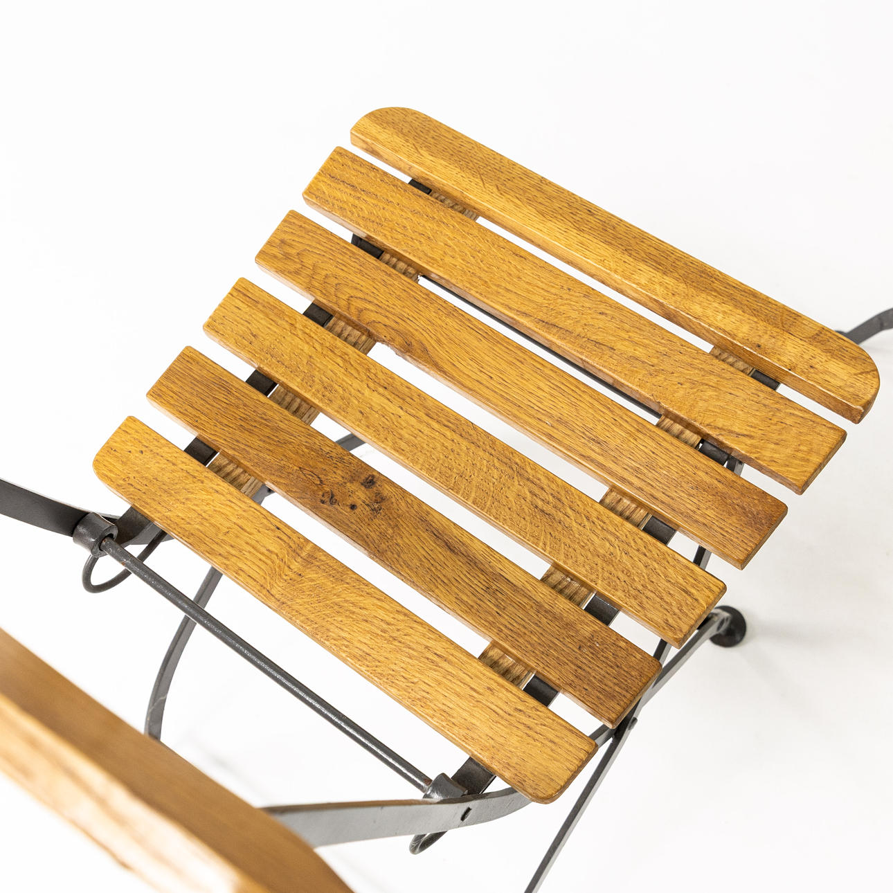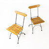 Cafégrupp, 3 delar, stomme i lackerad metall, skiva samt rygg och sits i lackerad ek, bl. a. två bryggeristolar brickmärkta Wedevågs Bruk