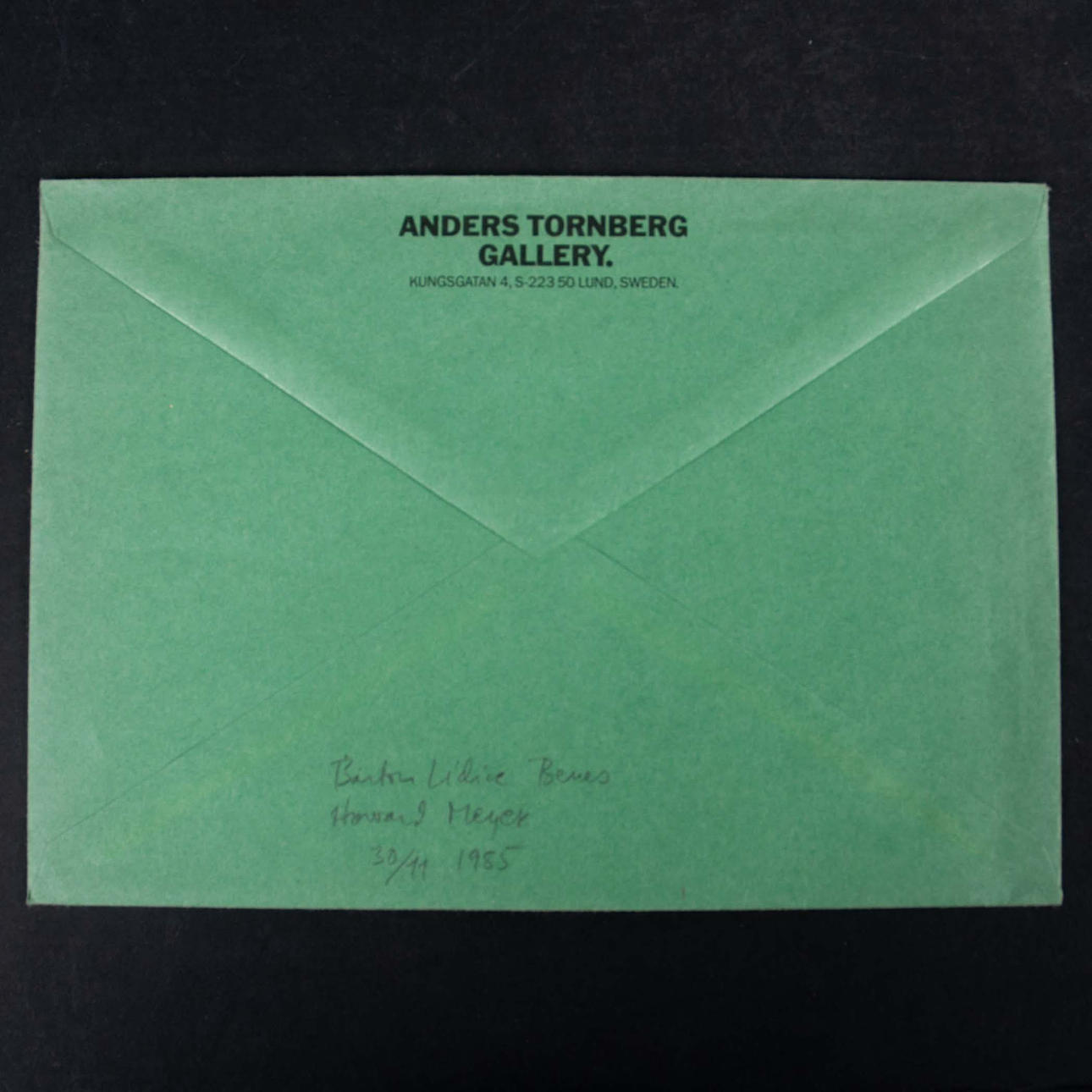 Barton Lidice Benes (1942-2012, USA), objekt "Requiem", betitlad på framsidan, utvikbar med monterade bilder, 3 av bilderna (fjärilarna) är tänkta att vingarna ska böjas upp, detta ex. är orört, bildyta 21 x 15 cm + Howard Meyer, objekt "Containers" med tryckt text om utställningen (30/11-22/12 1985), objekt i textil (mått 7 x 10 cm), monterat på hård pappskiva, de båda objekten skickades ut i samma kuvert, sannolikt ställde de ut sina verk samtidigt, orignalkuvert, baksida med blyertsnoteringar, namnen och 30/11 1985.