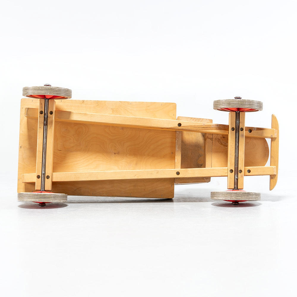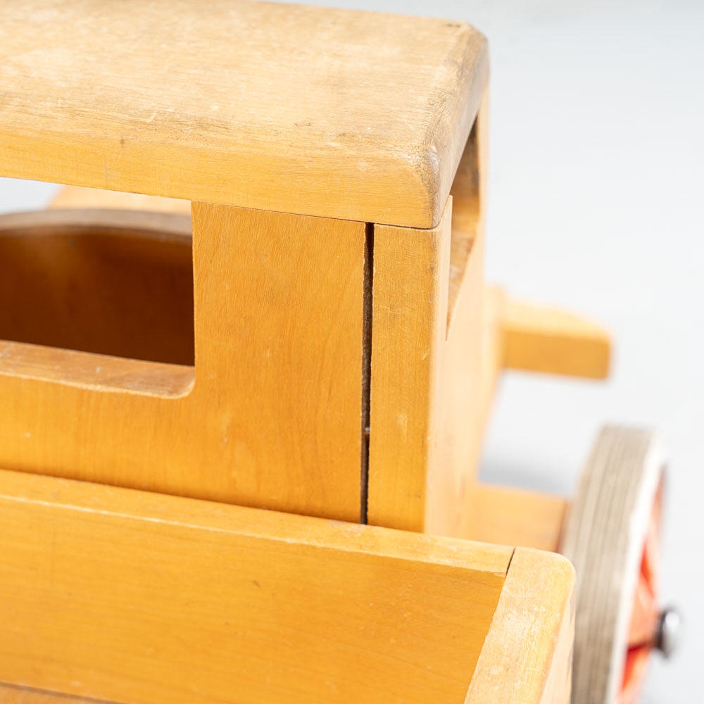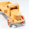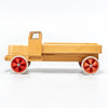 Större modell av lastbil i trä med flak och hytt. Utförd i massiv trä med sinkade hörn och hjul i plast/gummi. Troligen nordisk tillverkning,