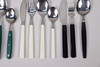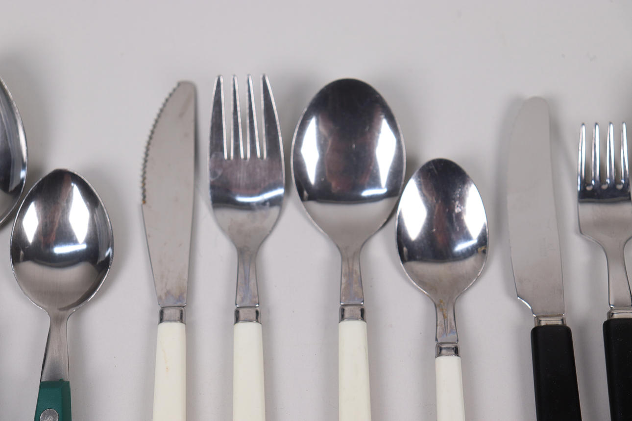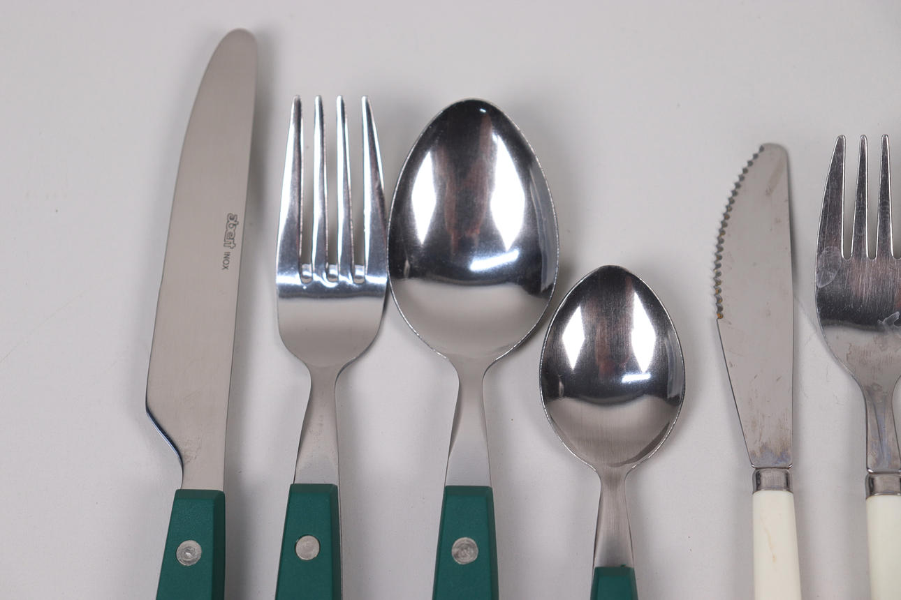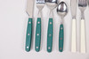 Gröna bestick, 6 gafflar, 6 knivar, 6 skedar, 6 teskedar.