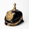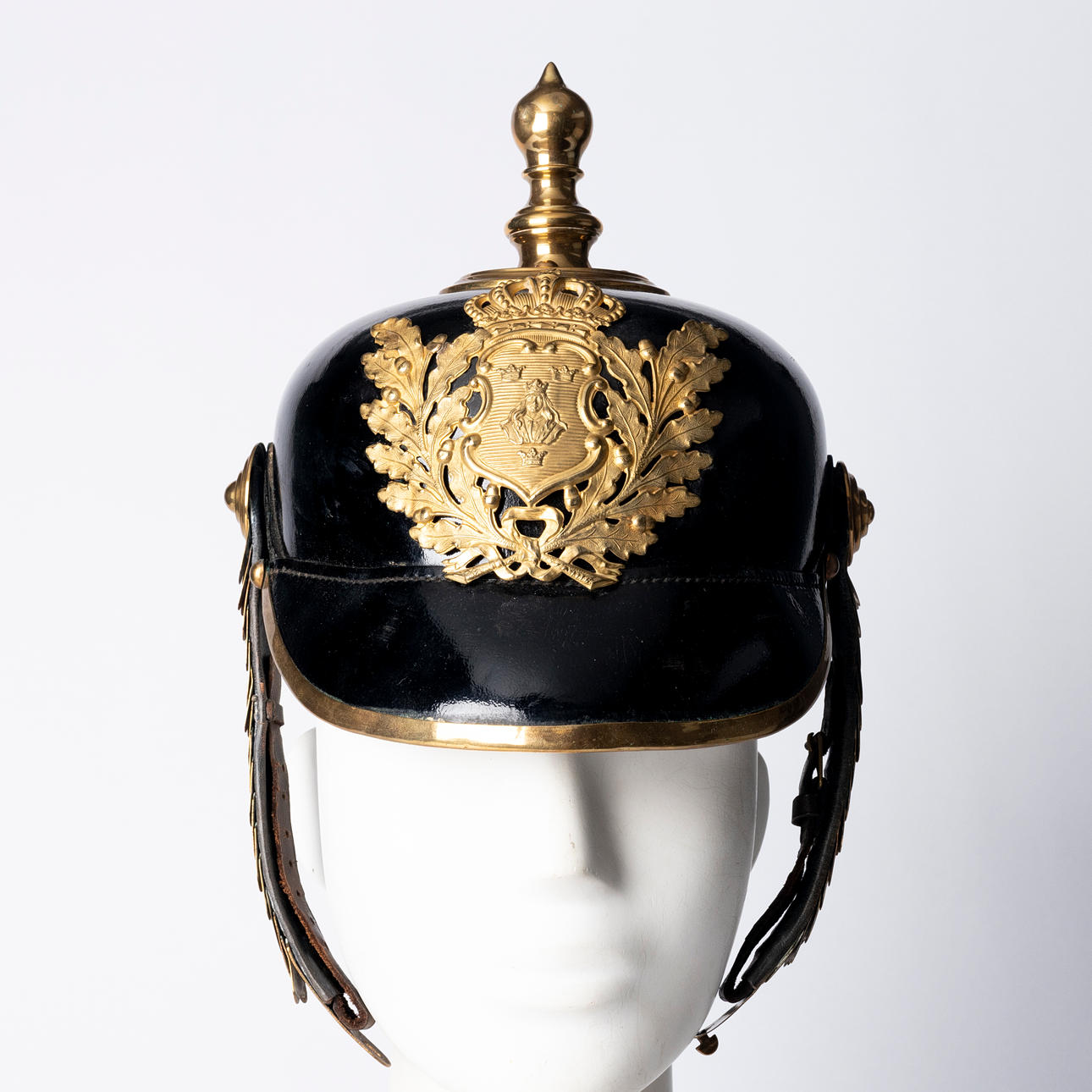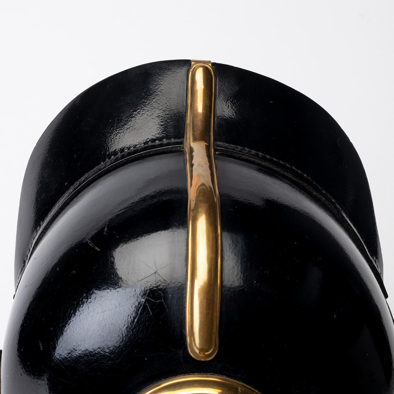 Emblem ej centrerat på hjälm. Bruks- och åldersrelaterat slitage. Bucklor.