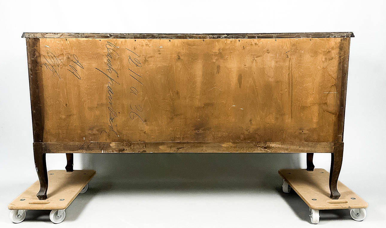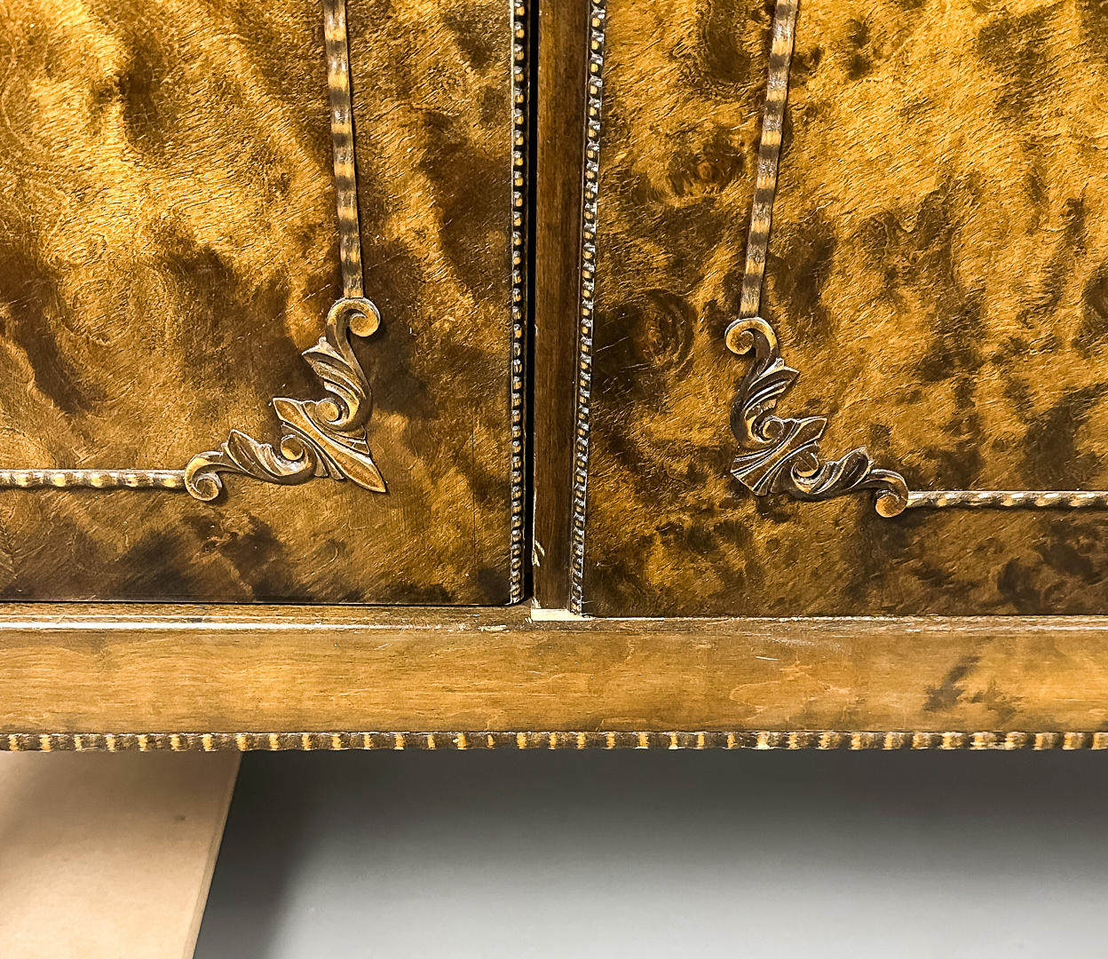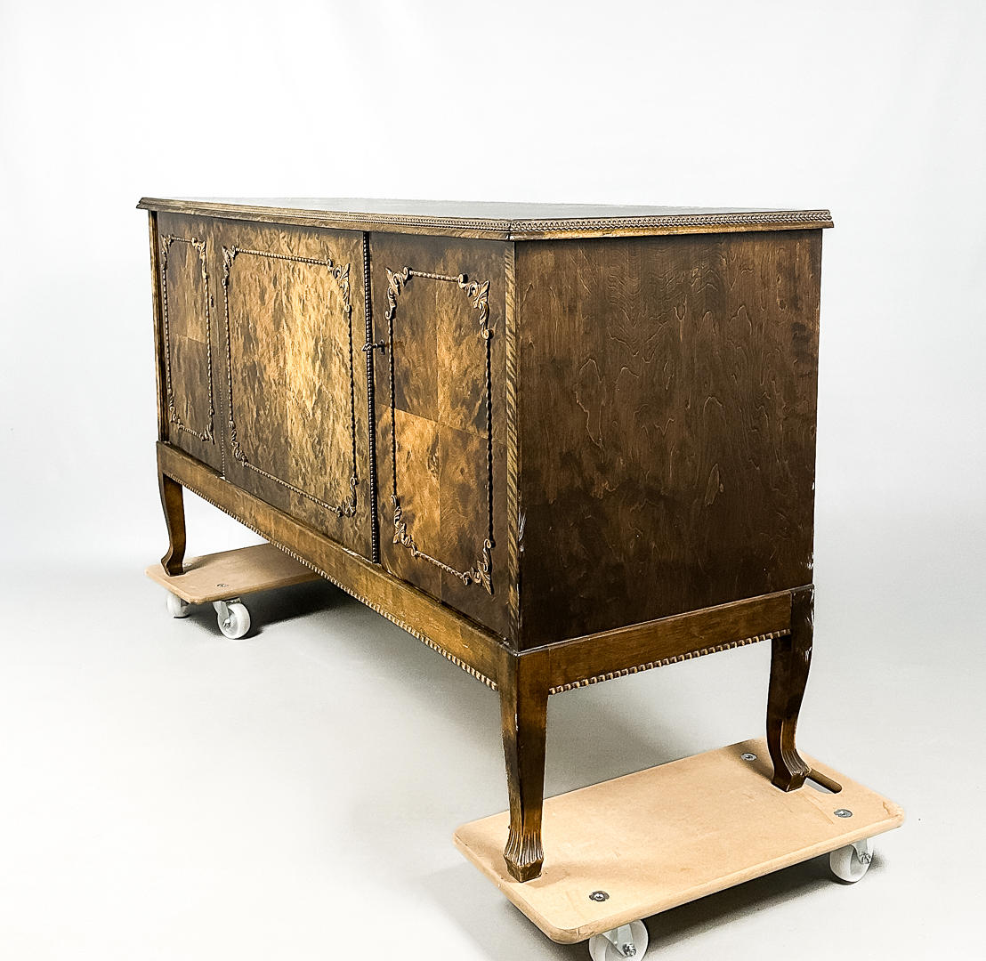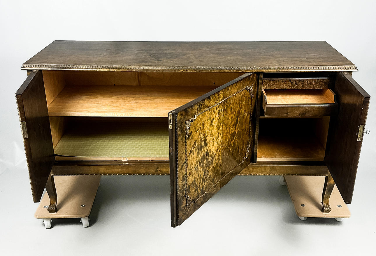 Sideboard med tre dörrar med bakomliggande hyllplan samt två lådor. Bredd 154 cm, djup 51 cm, höjd 83 cm.