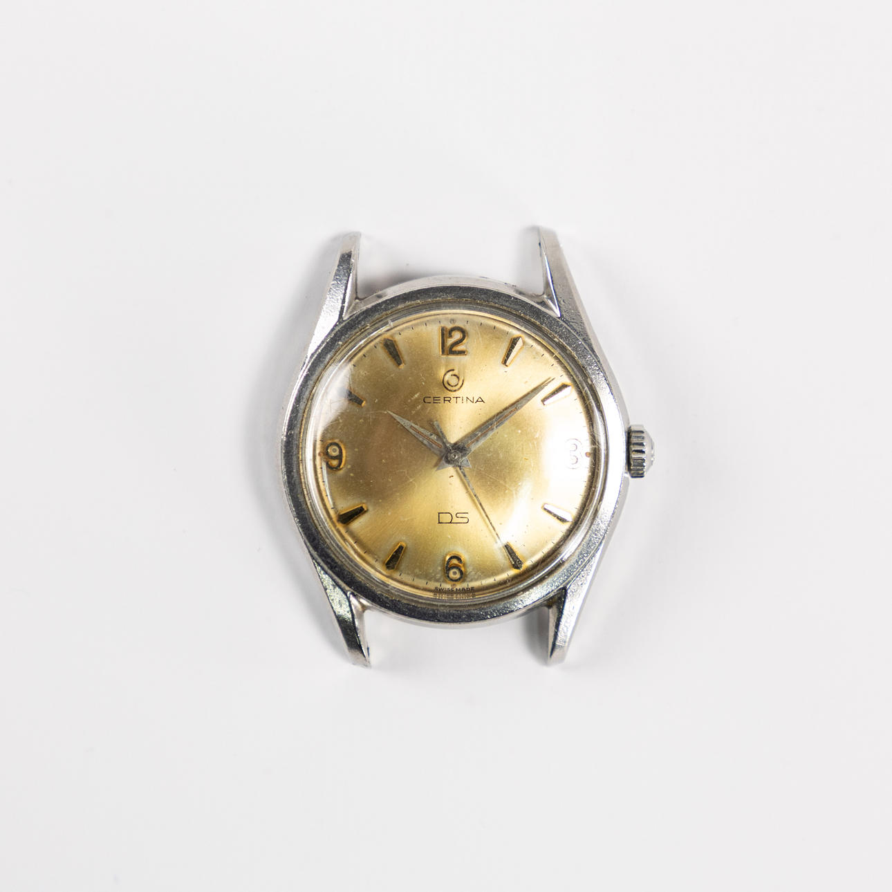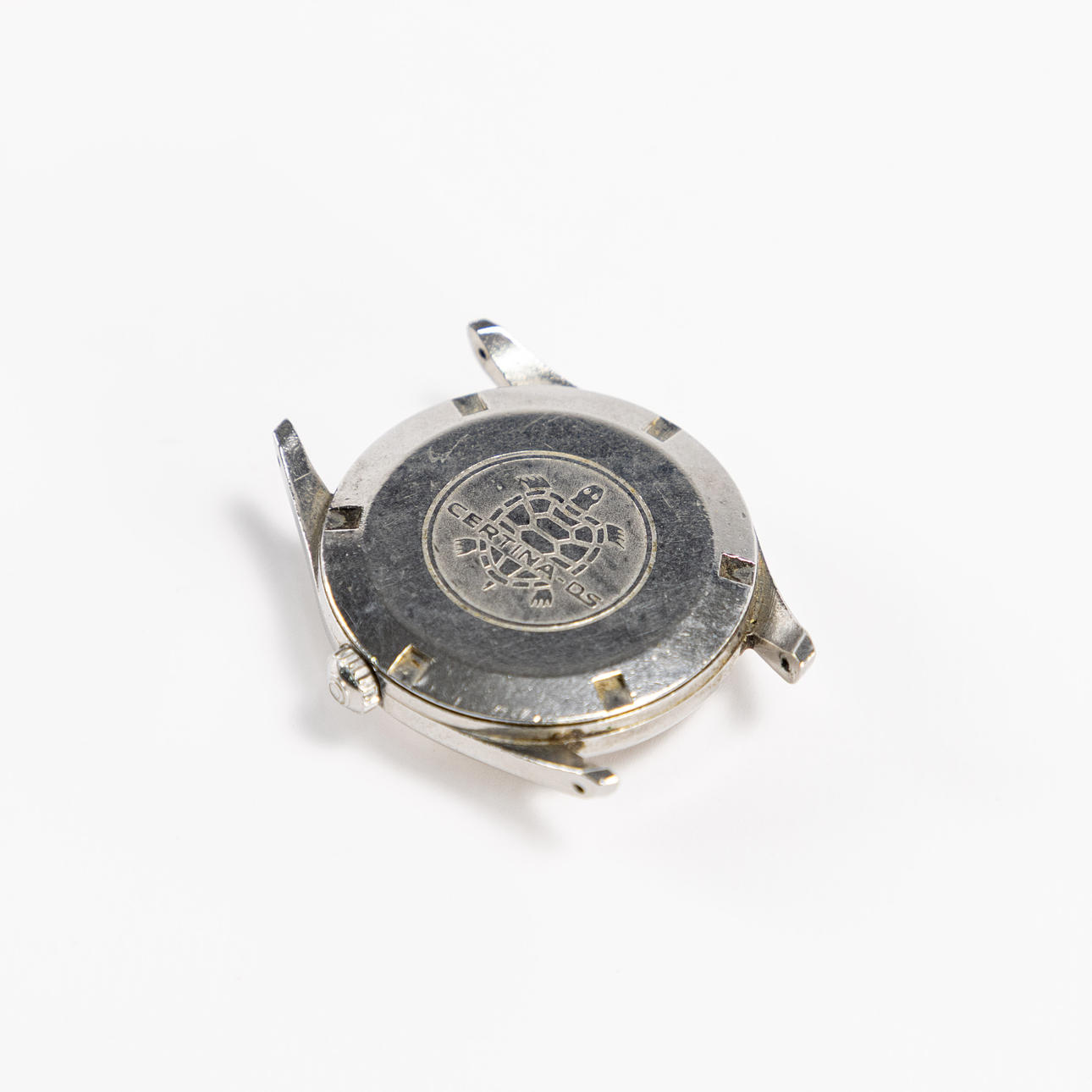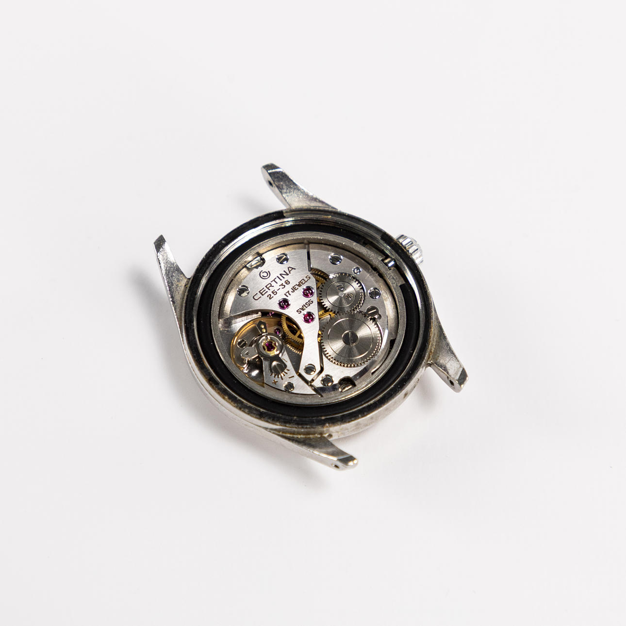 Herrarmbandsur i rostfritt stål, diameter 36 mm exkl. krona, skruvad boett, plexiglas, korrekt krona, manuellt urverk; Certina 25-36, ca 1960-tal.