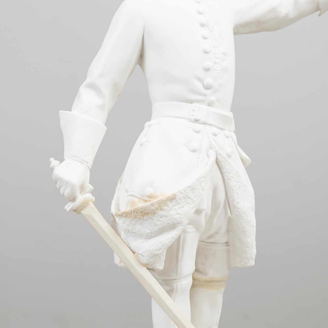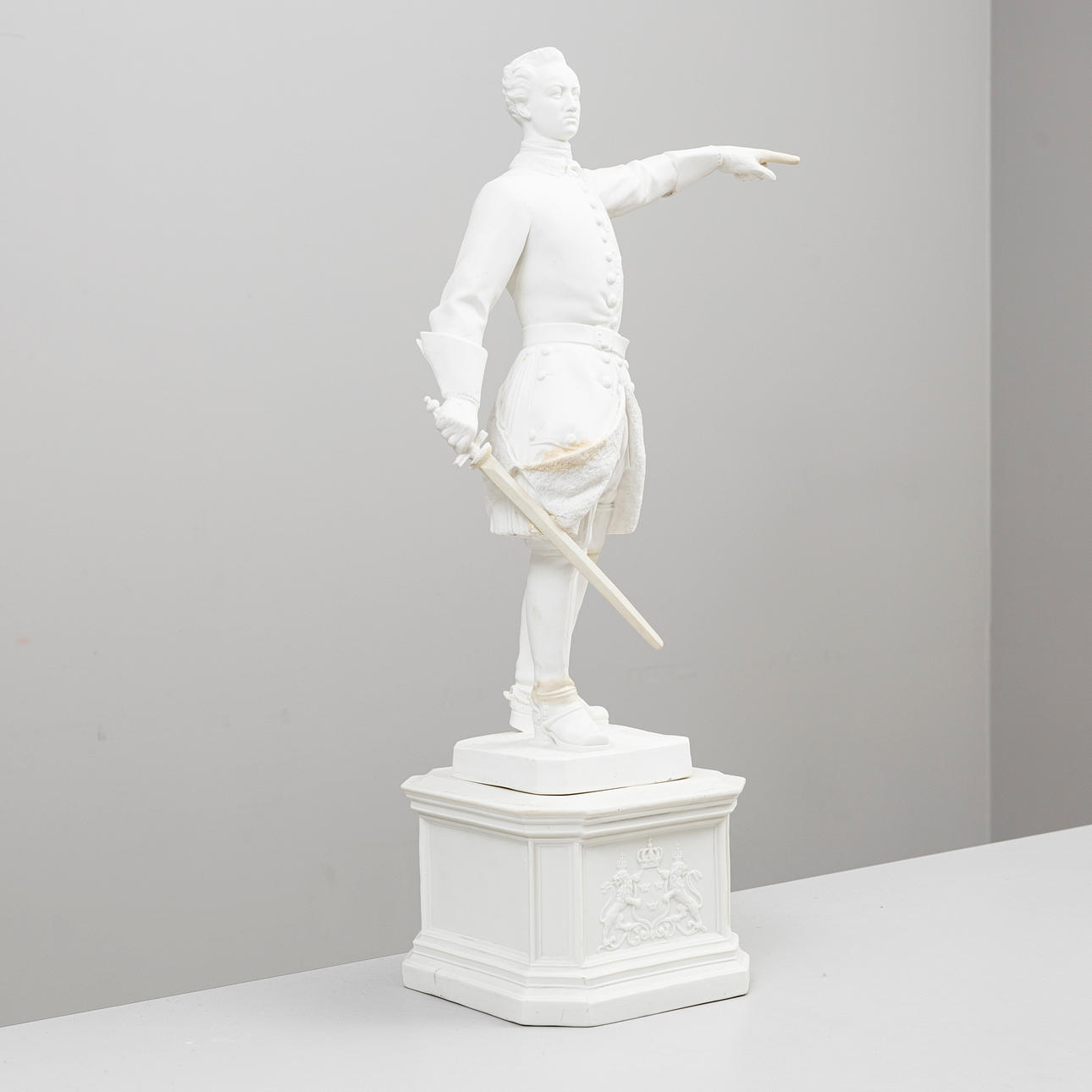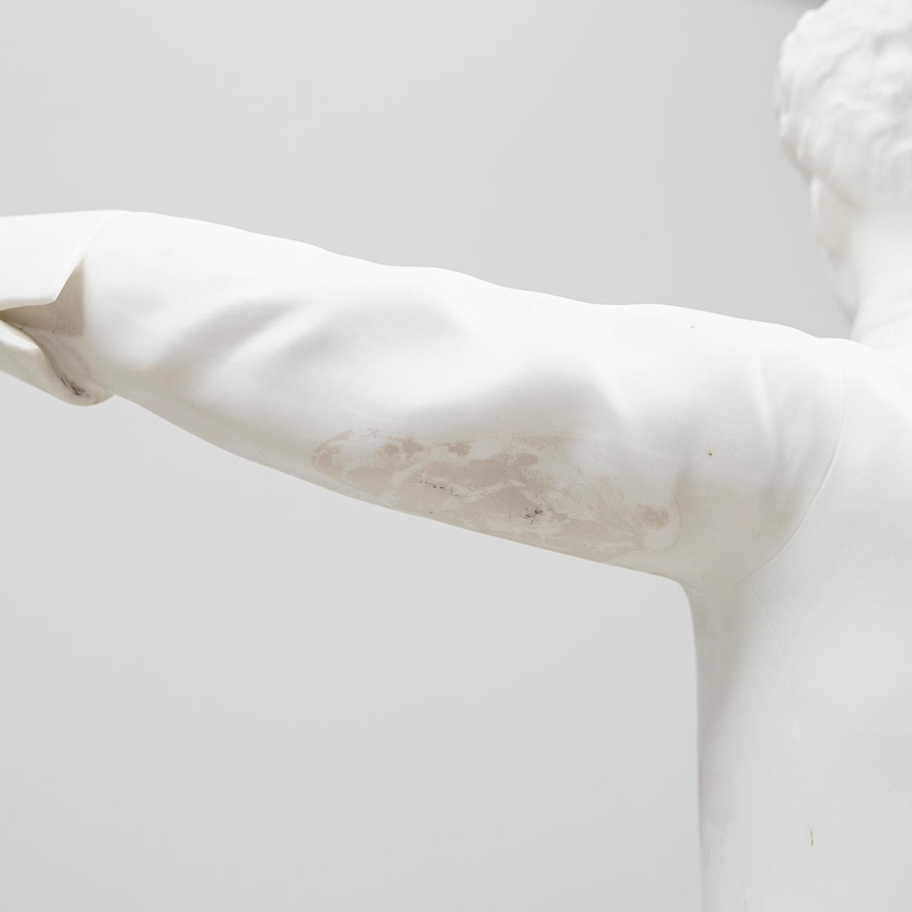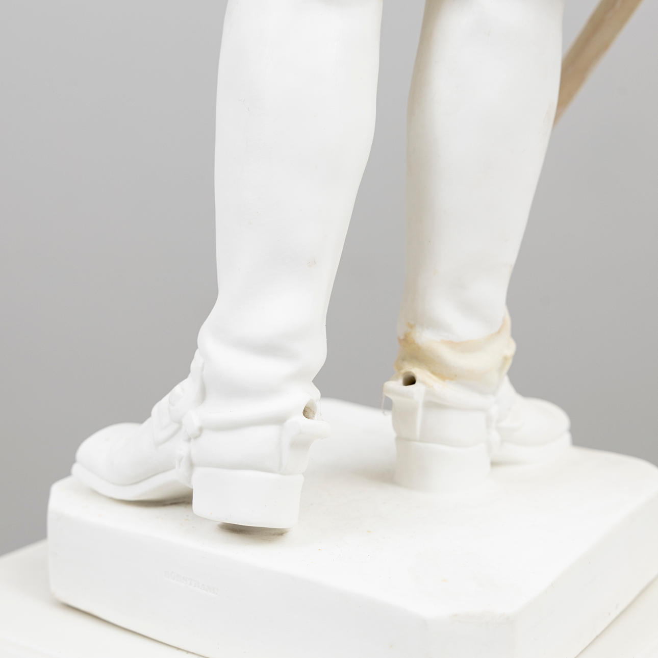 Lagningar, retuscher, sporrar saknas. Märken. Sockel med nagg och sprickor.