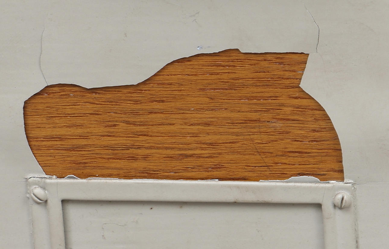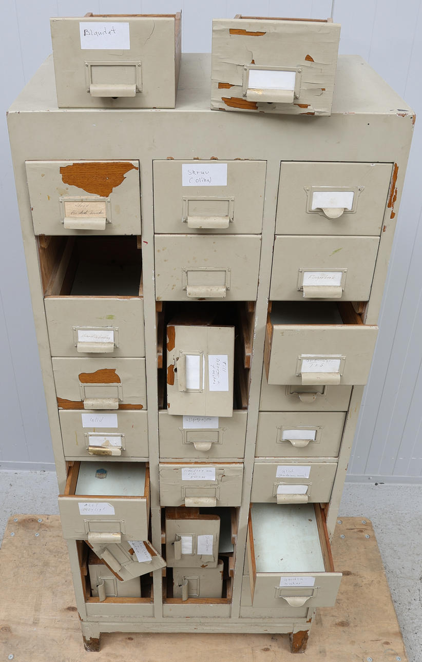 Bruksslitage. Ytsmuts. Flagnad färg, sprickor, skav, märken, hål, tejprester. Vissa lådor sitter hårt, vissa lådor går att dra ut, andra går inte att sätta in. Två lådor saknas (totalt 25 lådor finns). Senare bemålat.