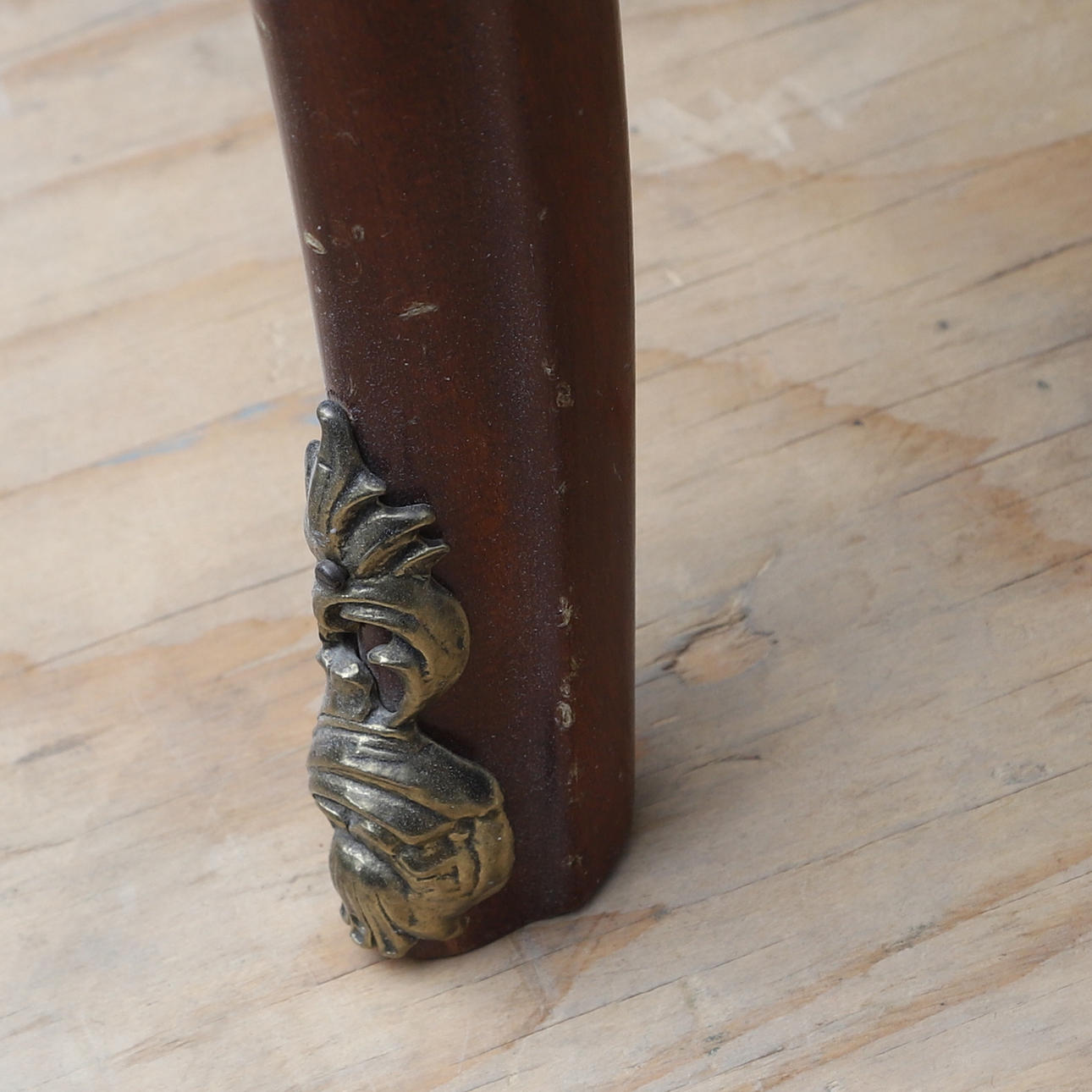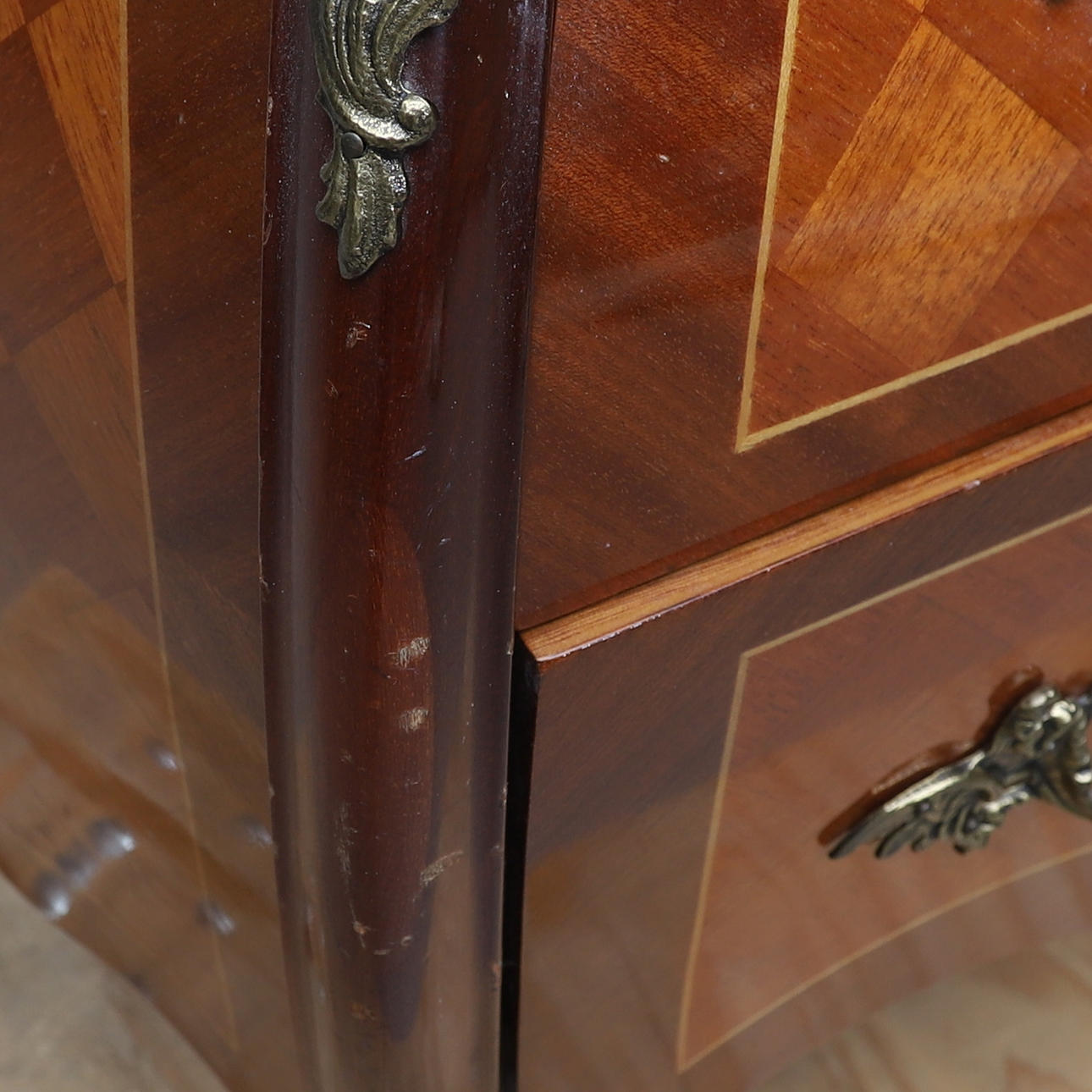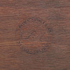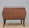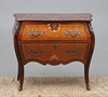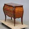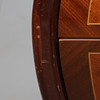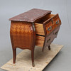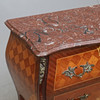 Fanerad med olika träslag. Stenskiva. Längd ca 82, bredd 39, höjd 71 cm.