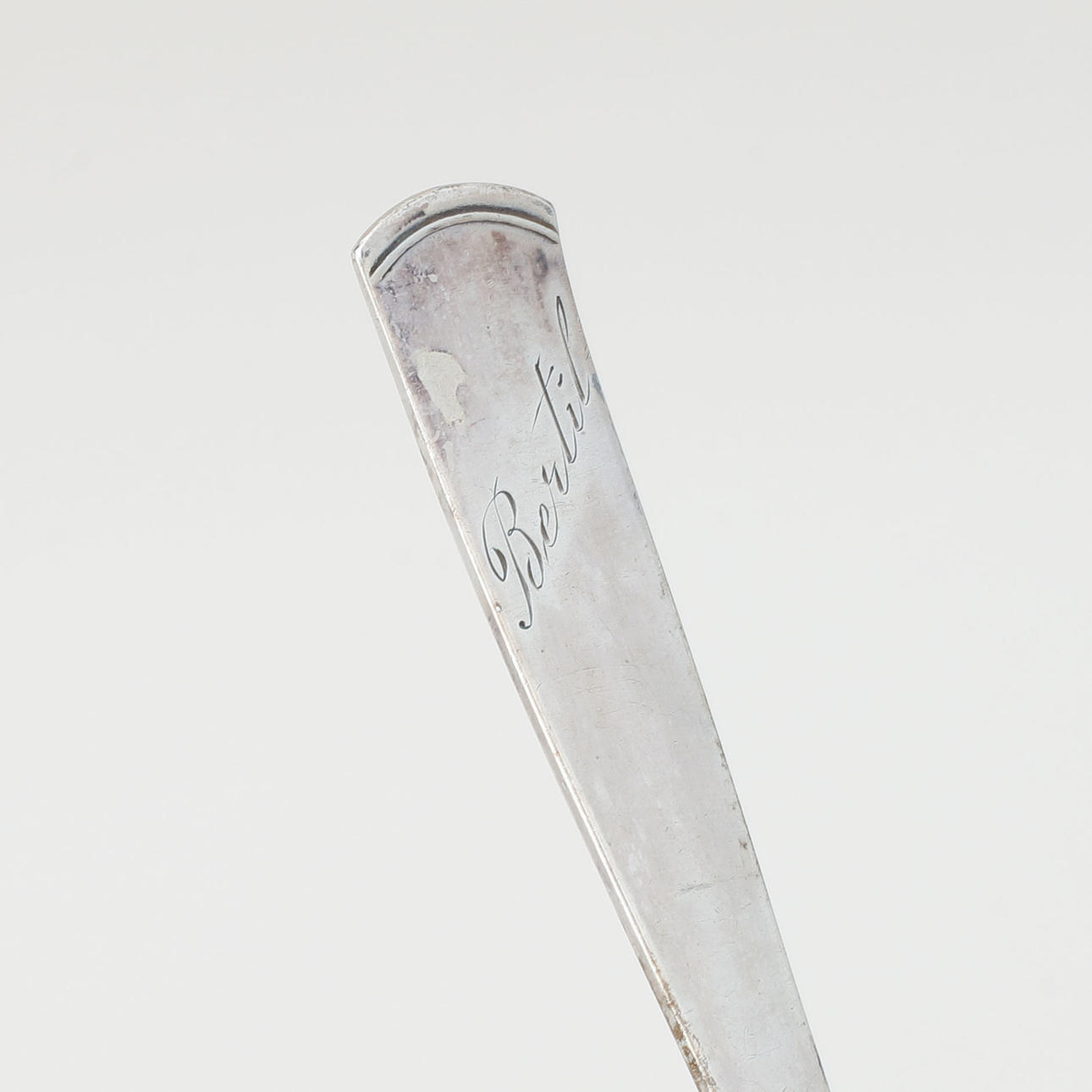 Bruks- och åldersrelaterat slitage, med namngravyr, knivblad av rostfritt stål.