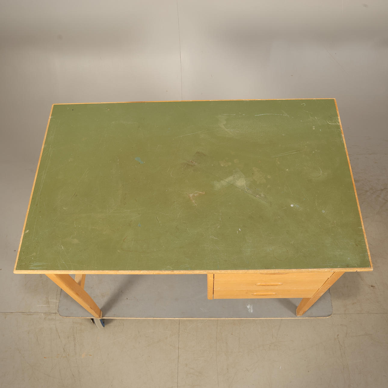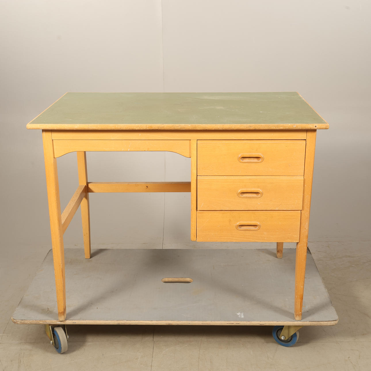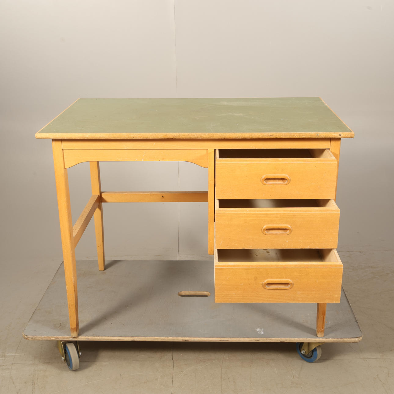Skivan klädd i grönt plastlaminat, 3 lådor. Höjd 73cm Bredd 95cm Djup 57cm.