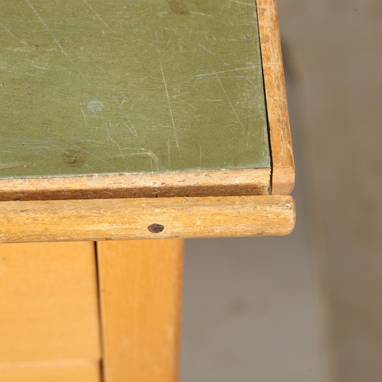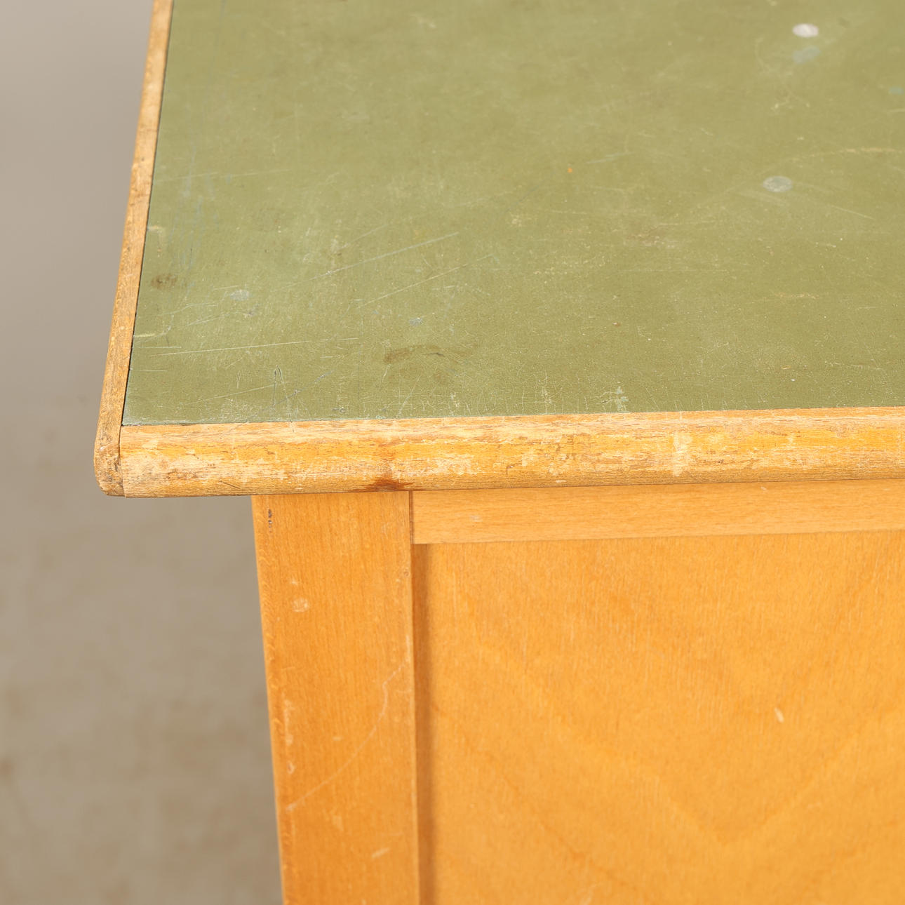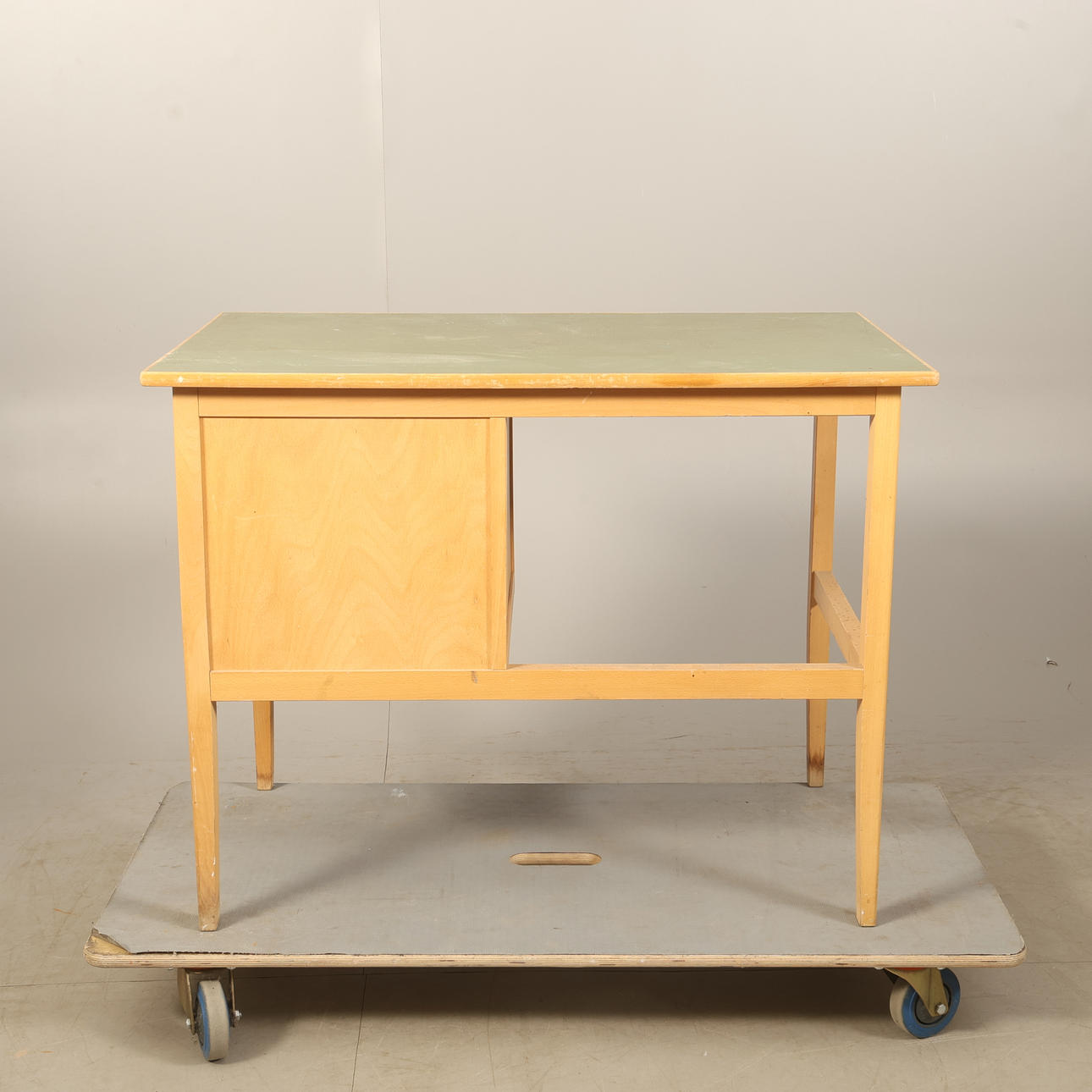 Skivan klädd i grönt plastlaminat, 3 lådor. Höjd 73cm Bredd 95cm Djup 57cm.