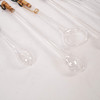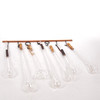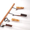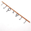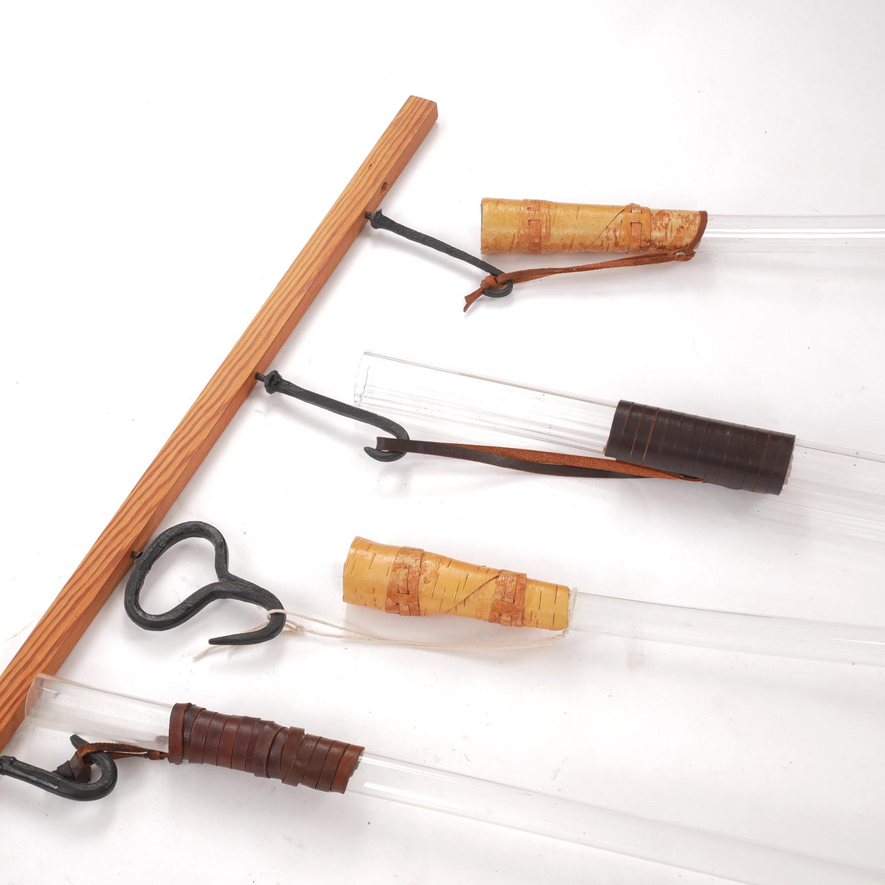 Trästav med 7 handsmidda krokar för upphängning av luffarkupor i glas med lindade handtag.