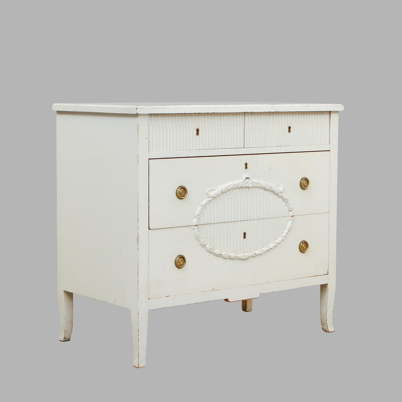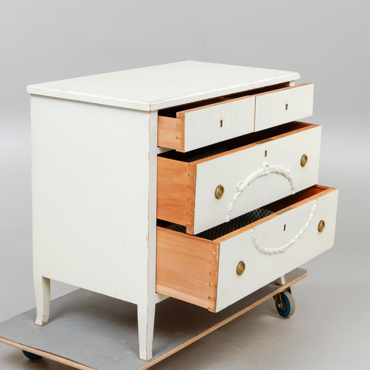 4 lådor, längd 90 cm, bredd 80 cm, höjd 82 cm.