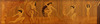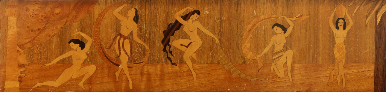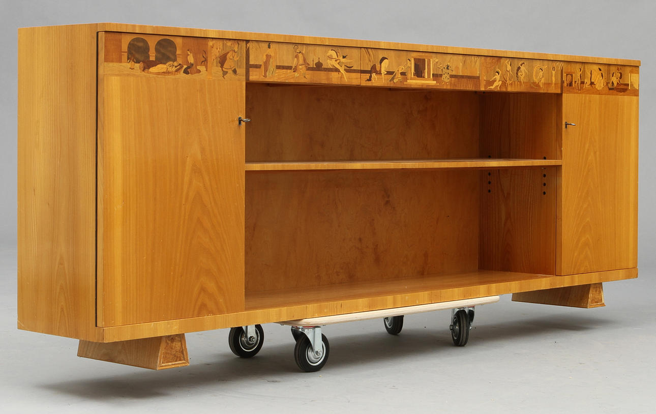Intarsiadekor av figurscener. Längd 203, bredd 31, höjd 74 cm. Tre lådor samt 2 dörrar.
