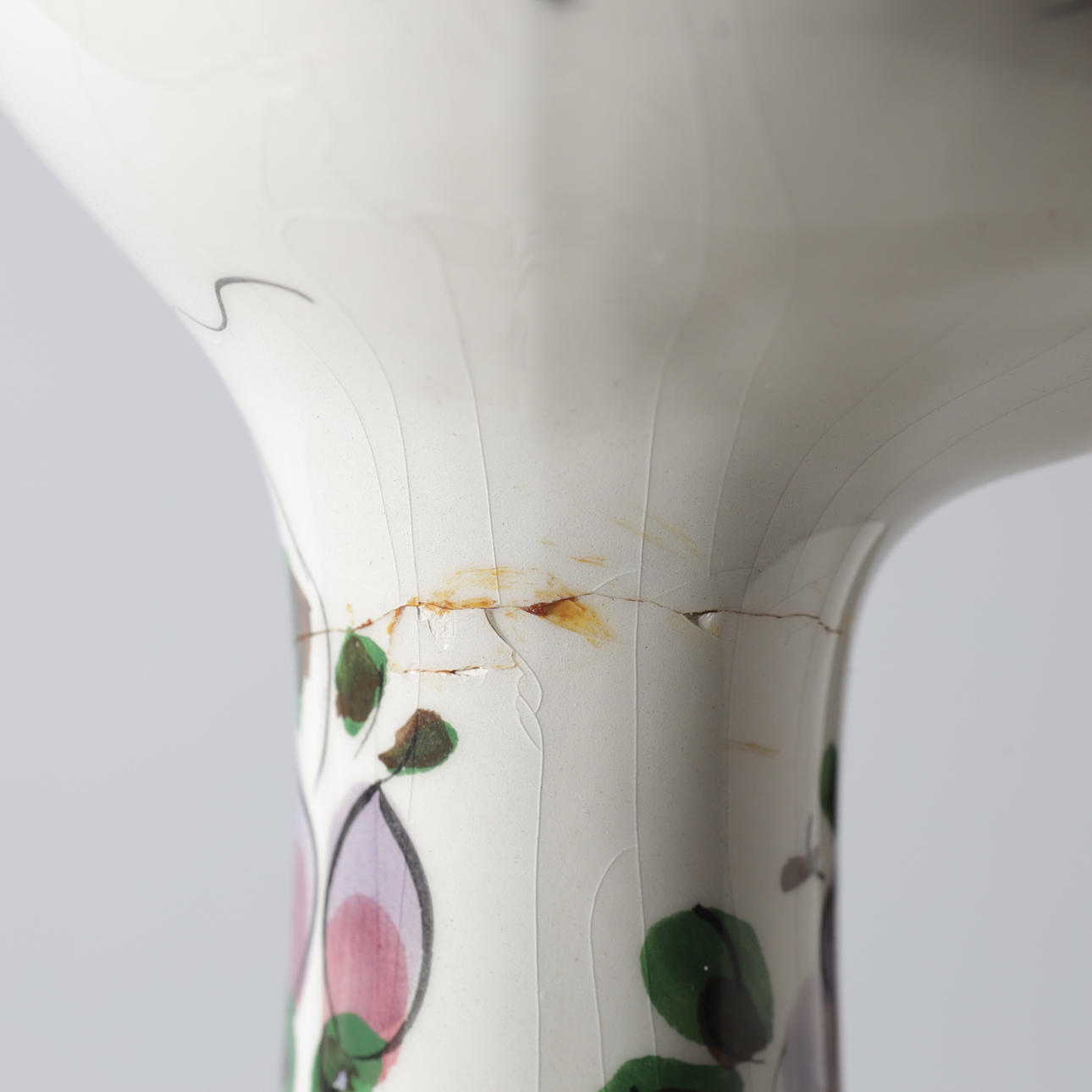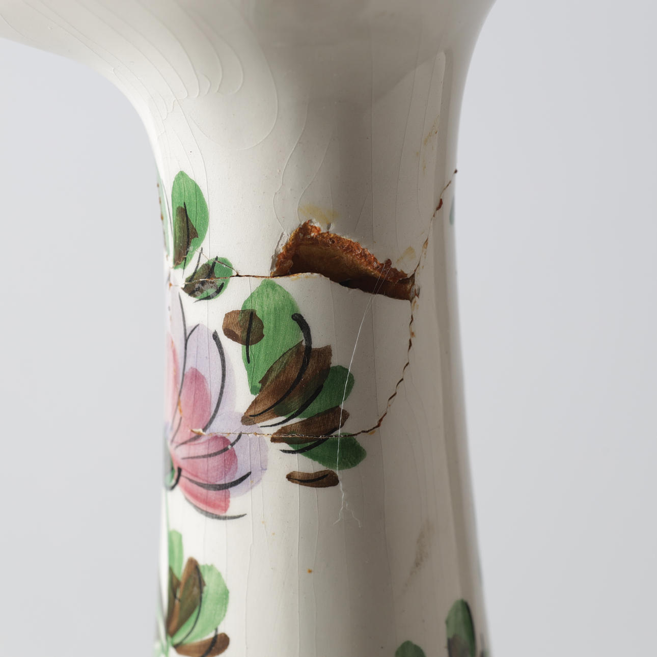 Slitage. Avslagen hals med lagning. Repor och fläckar.