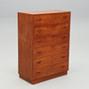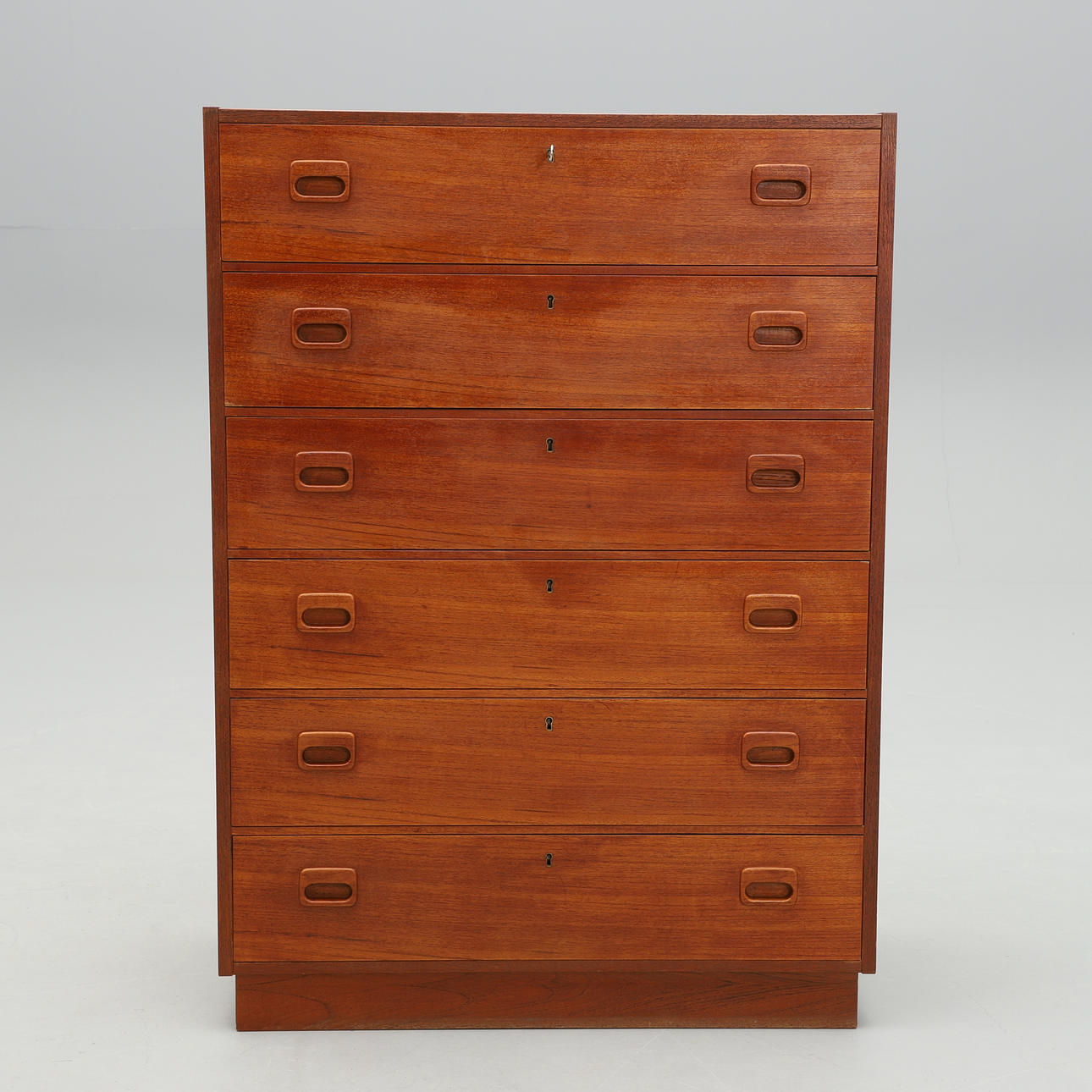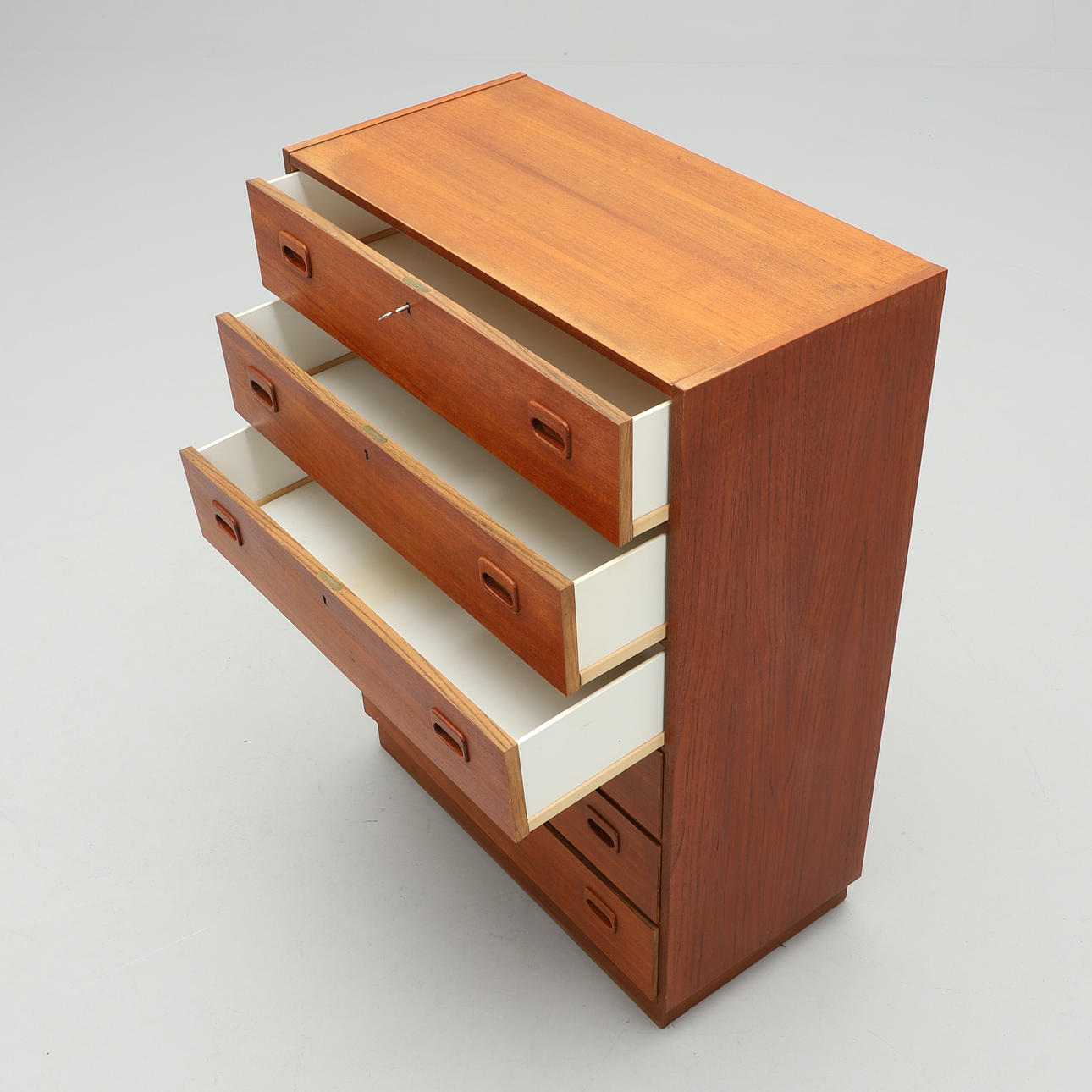 Fanerad med teak. Sex utdragslådor. Bredd 75,5, djup 38, höjd ca 105 cm.