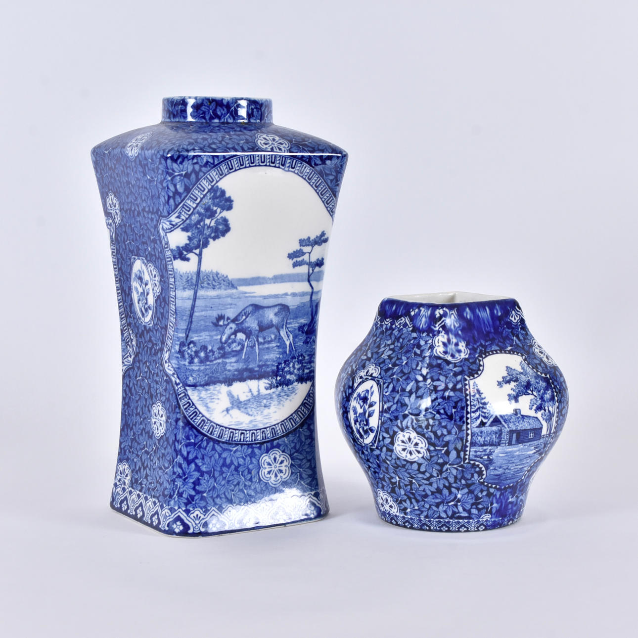 dekor av blommor samt av landskap, hus och älg i utsparade reserver,