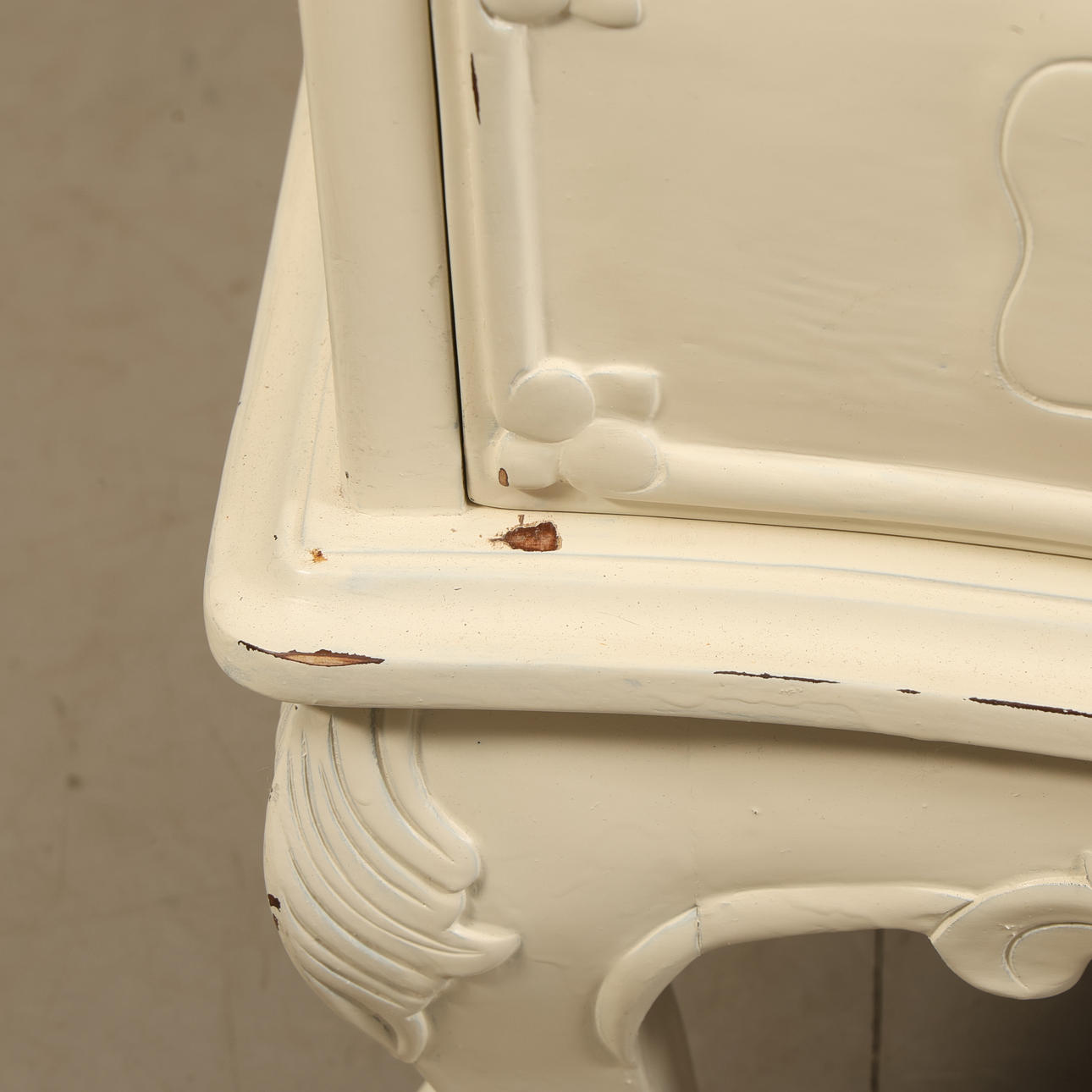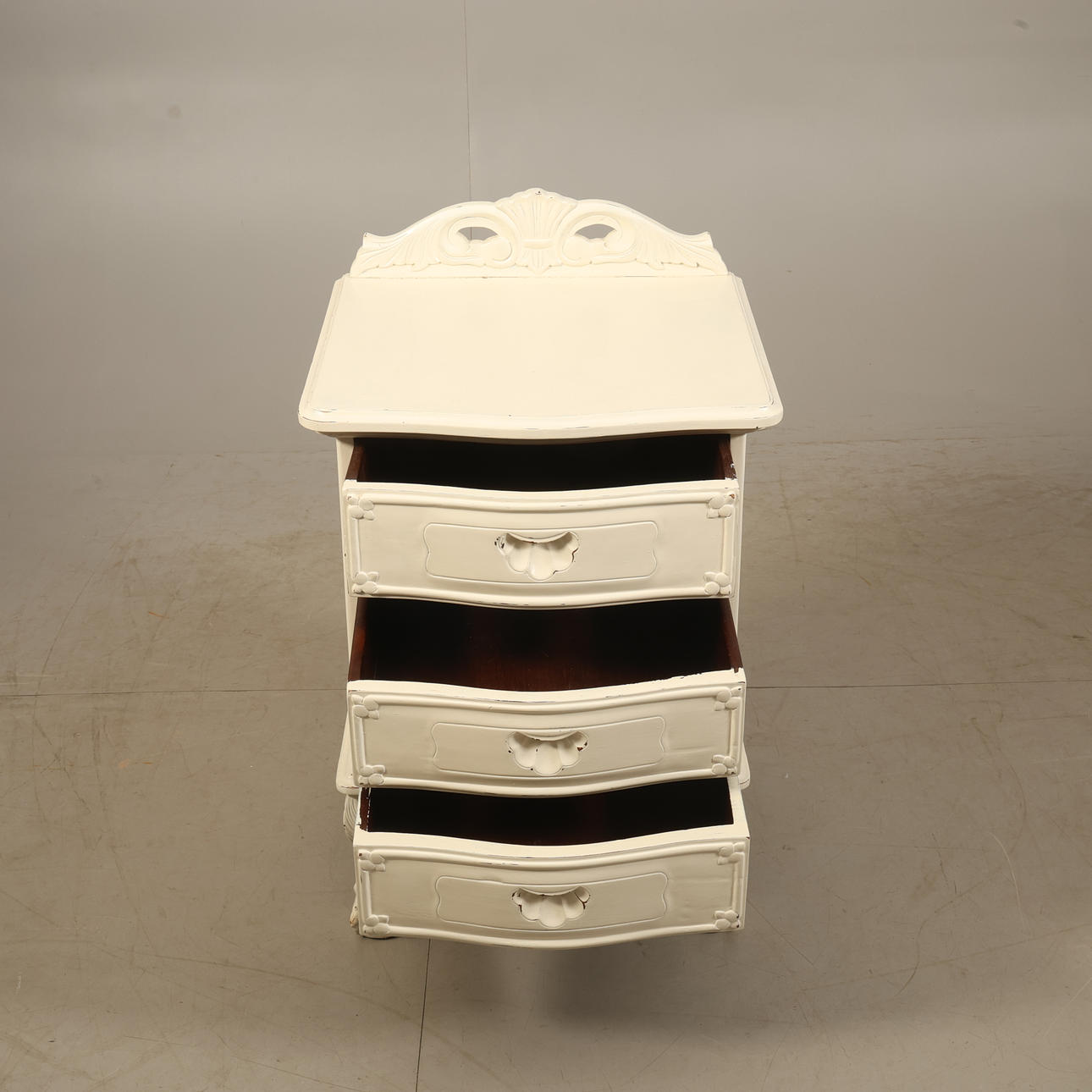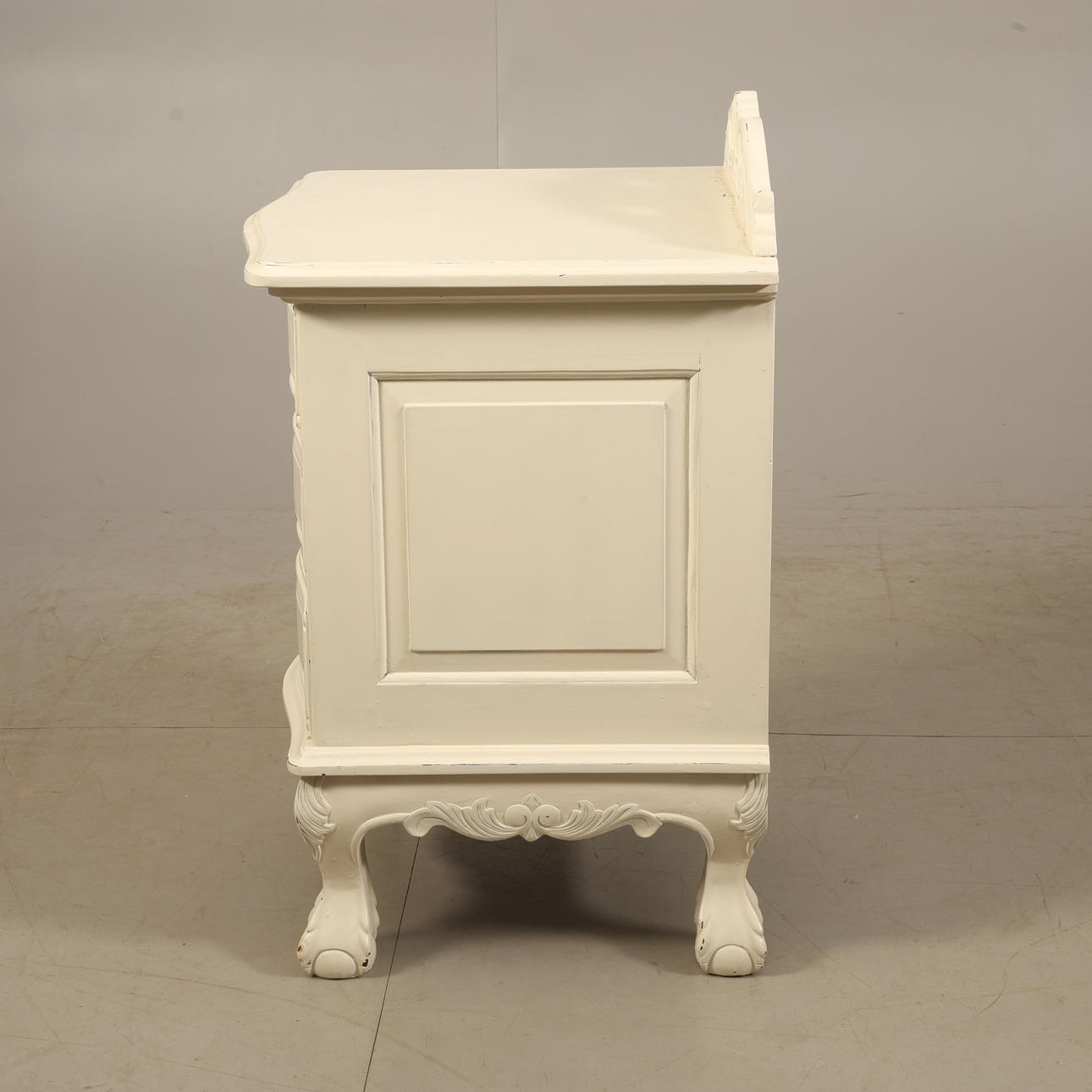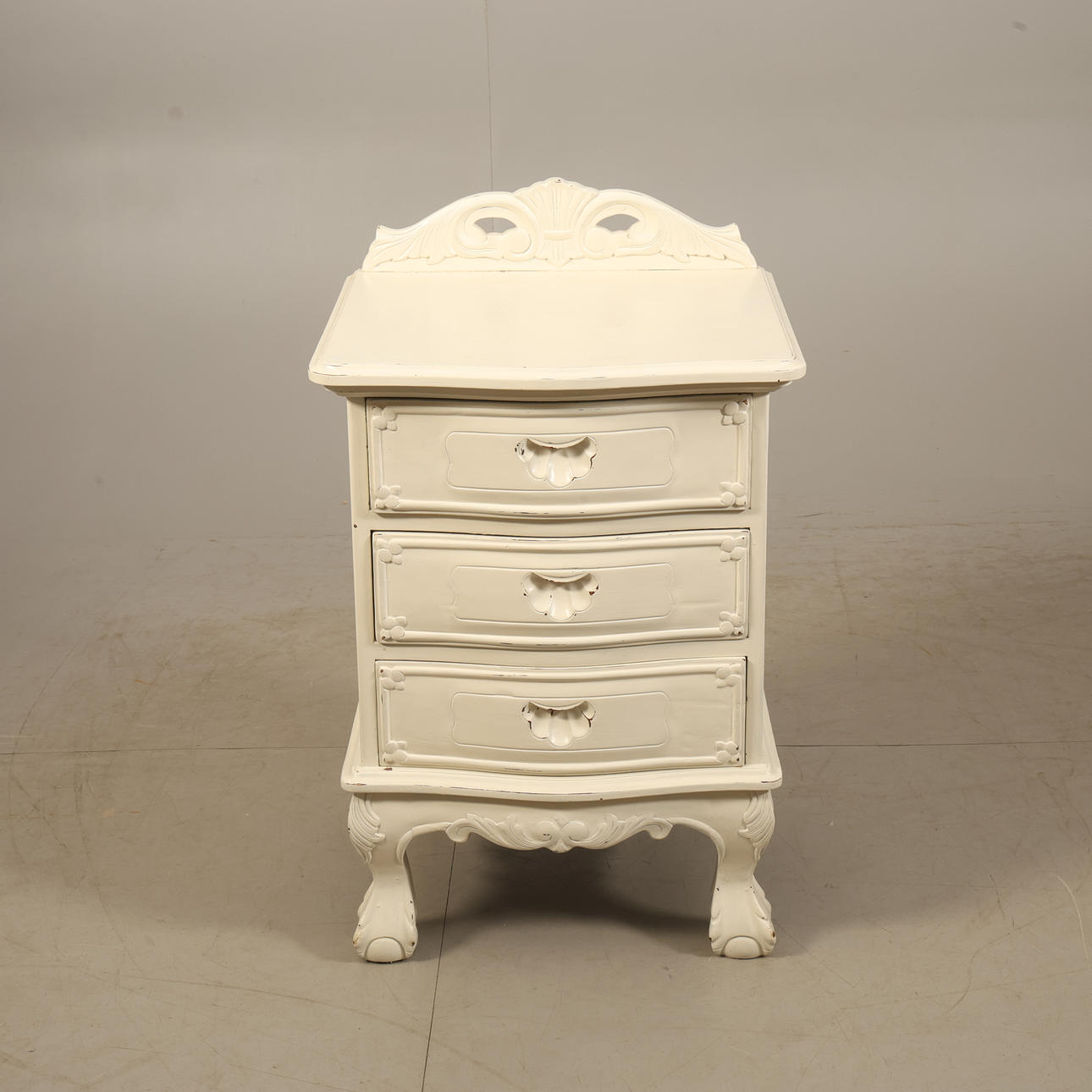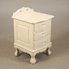 Svängda former på claw-on-ball fötter, tre lådor i front. Längd ca 49, bredd 45 resp. 46,5, höjd 76 resp 77 cm.