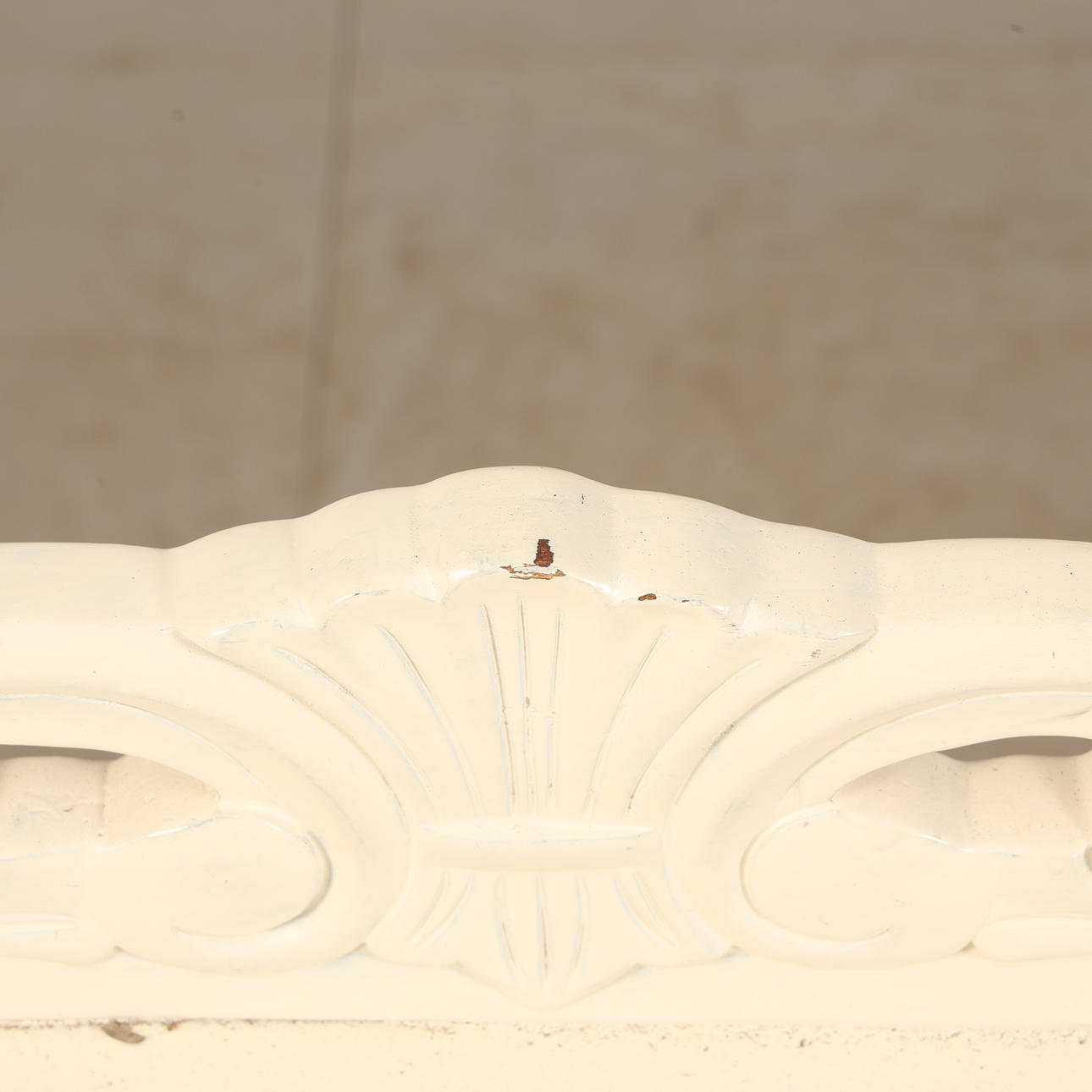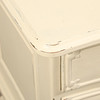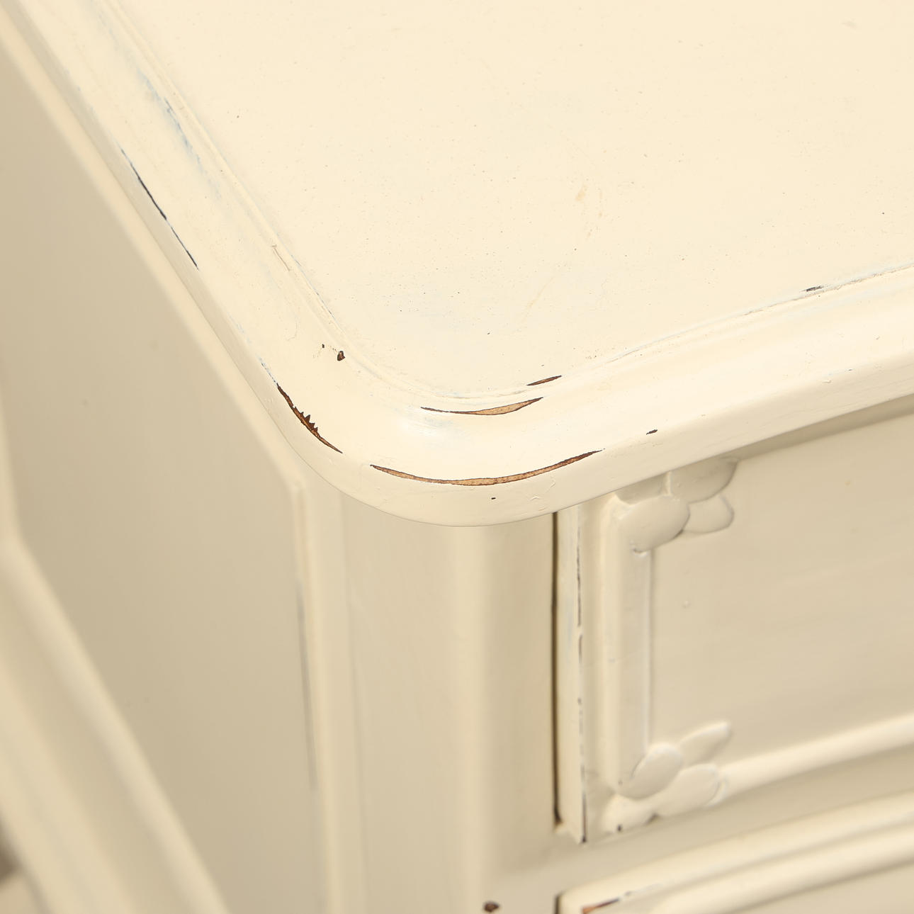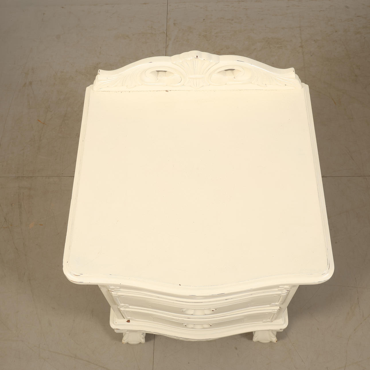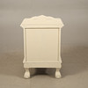 Svängda former på claw-on-ball fötter, tre lådor i front. Längd ca 49, bredd 45 resp. 46,5, höjd 76 resp 77 cm.