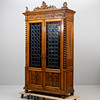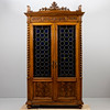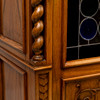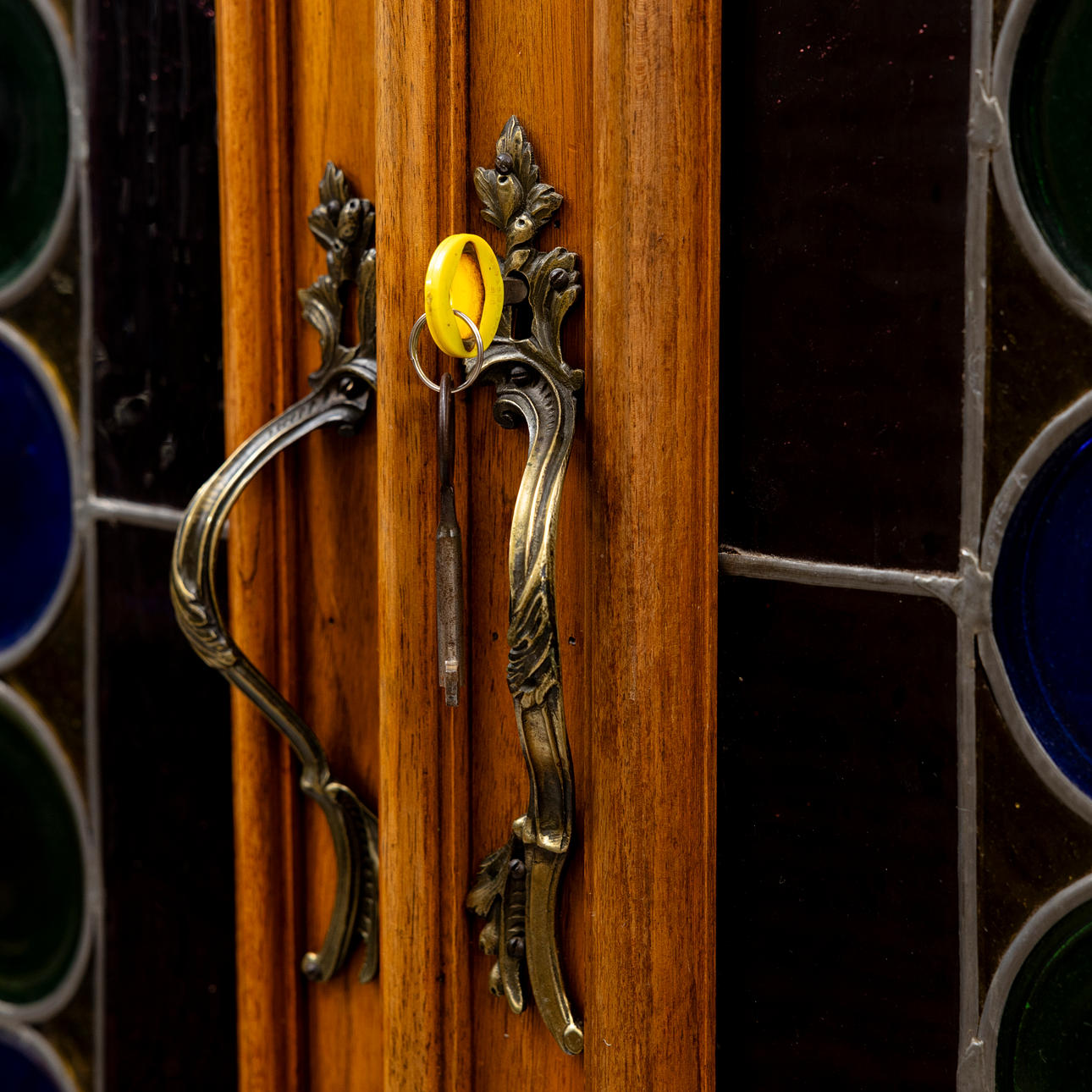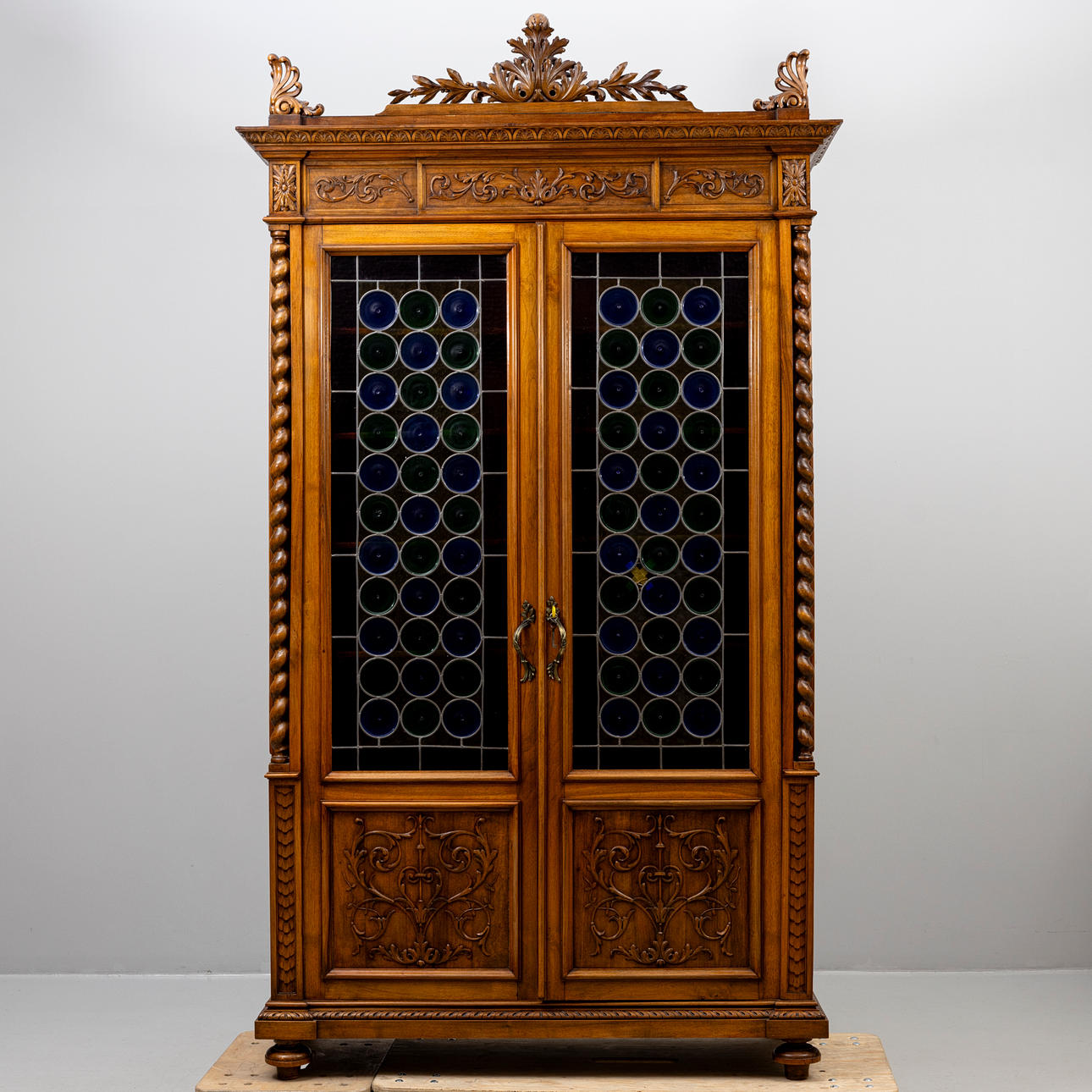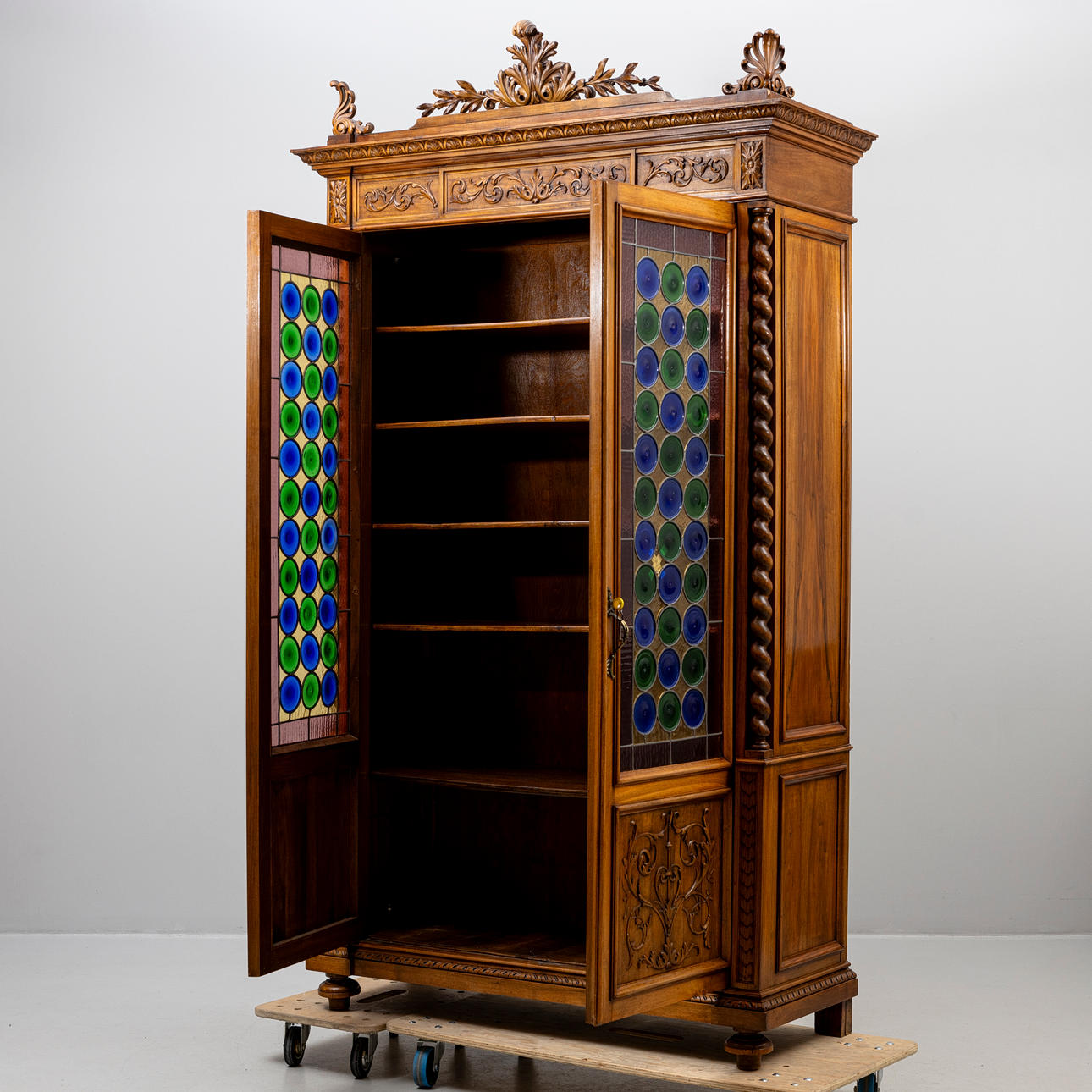 Pardörrar med flerfärgat glas, skuren dekor, hyllplan. Total höjd ca 245, längd 130, bredd 50 cm.