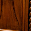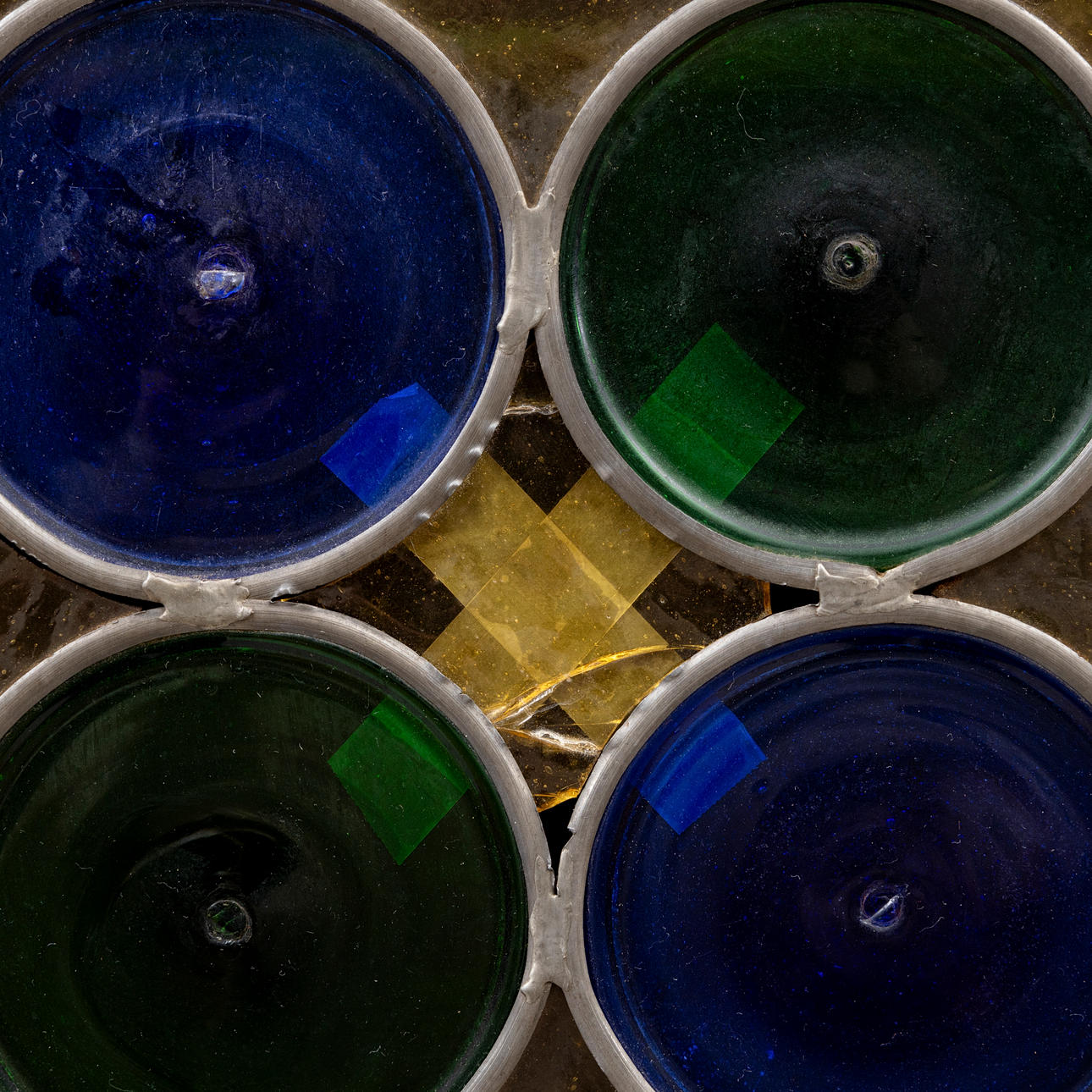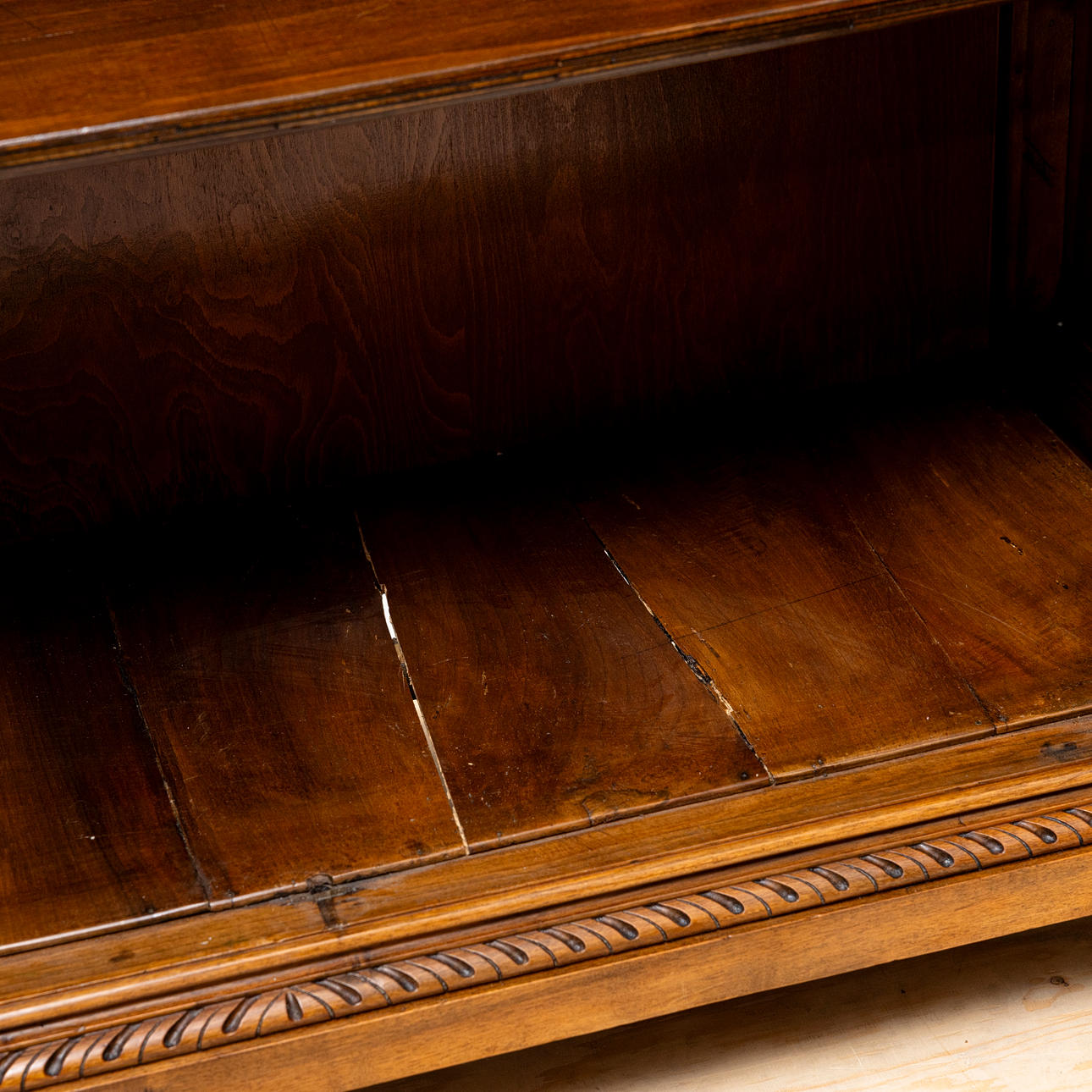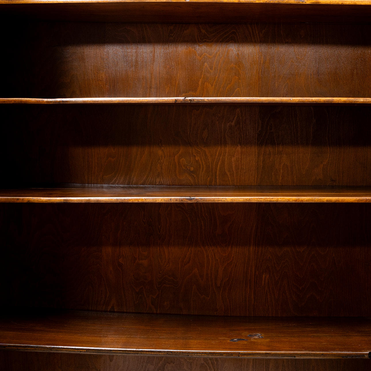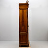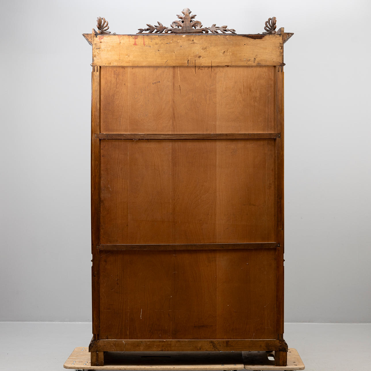 Pardörrar med flerfärgat glas, skuren dekor, hyllplan. Total höjd ca 245, längd 130, bredd 50 cm.