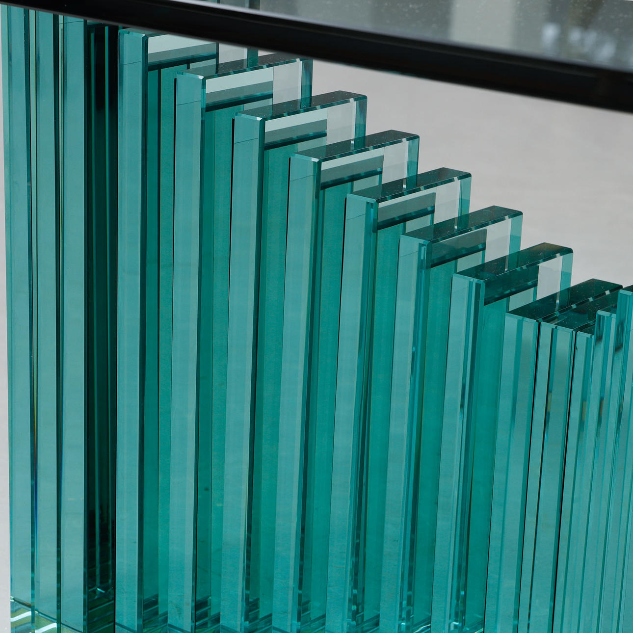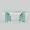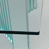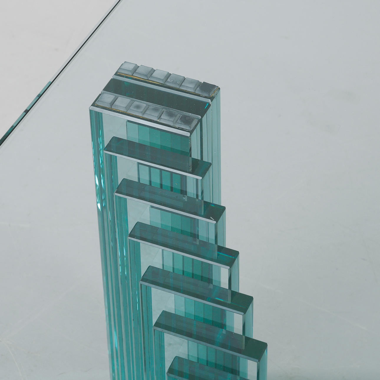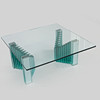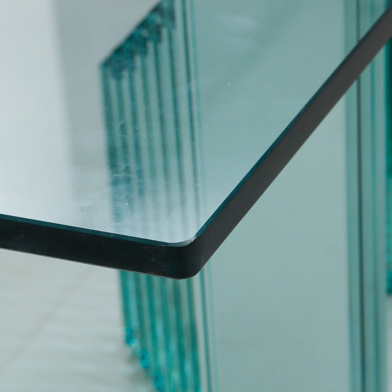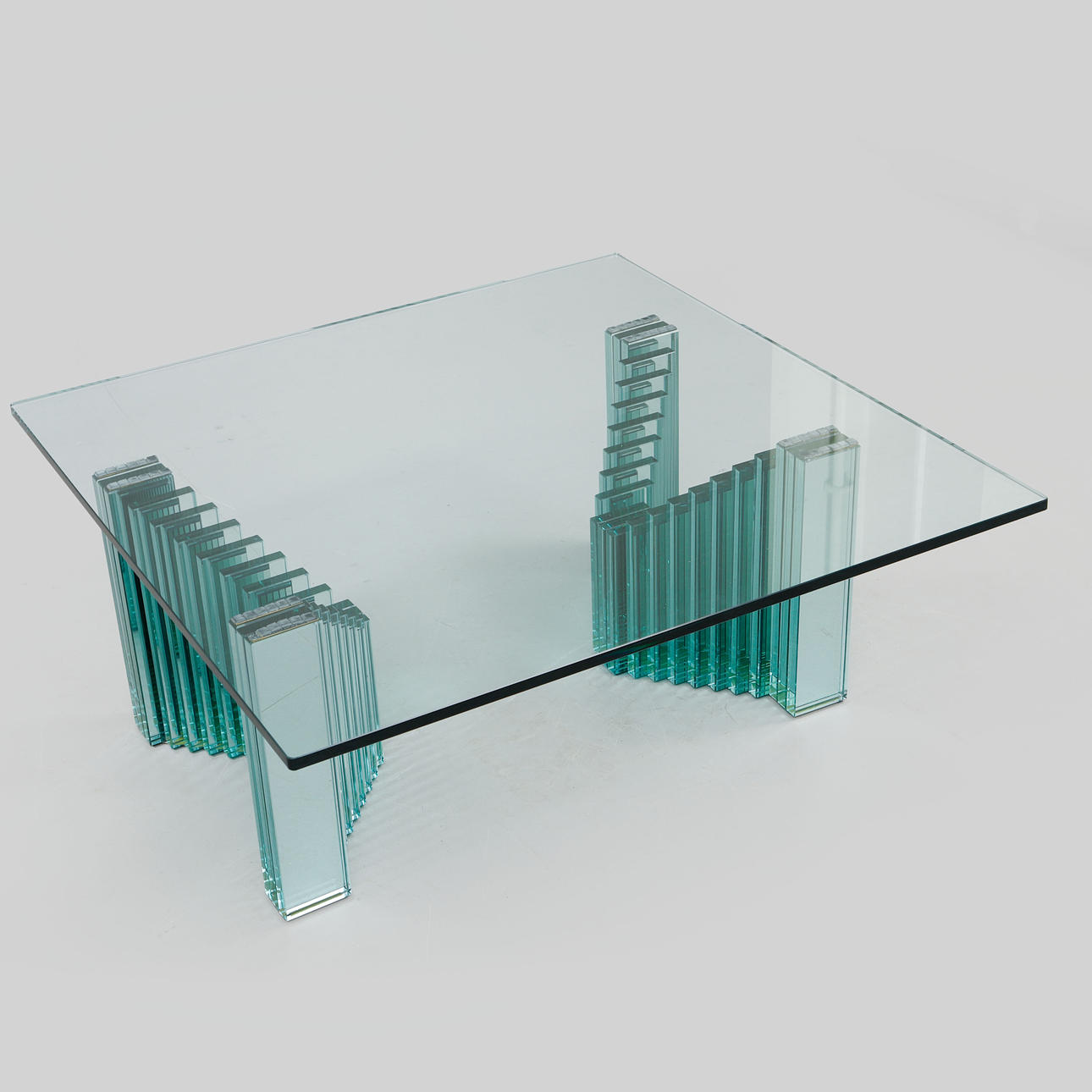 Kvadratisk skiva i klart glas, på ben av glas. Mått ca 90 x 90 x 37 cm.