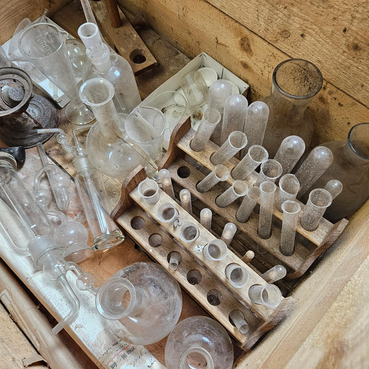 PARTI LABORATORIEUTRUSTNING, i trälåda.