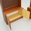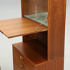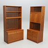 Valnötsfanerade, tvådelade. Överdel med hyllor resp lucka och barskåp. Underdelar med två dörrar, bakomliggande hyllor. Bredd 70 resp 90 cm, djup 44 (nedtill) resp 25 (upptill), höjd 55+116 = 171 cm.
