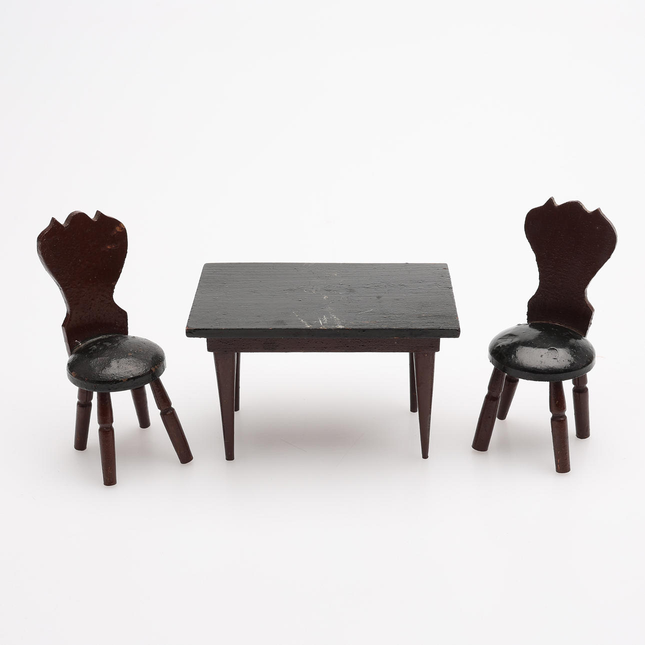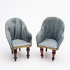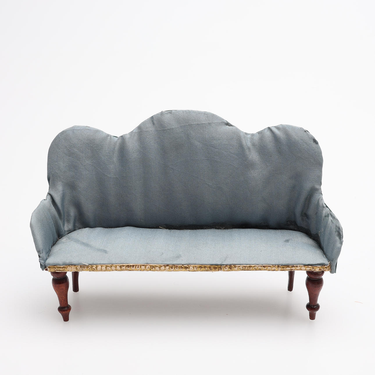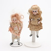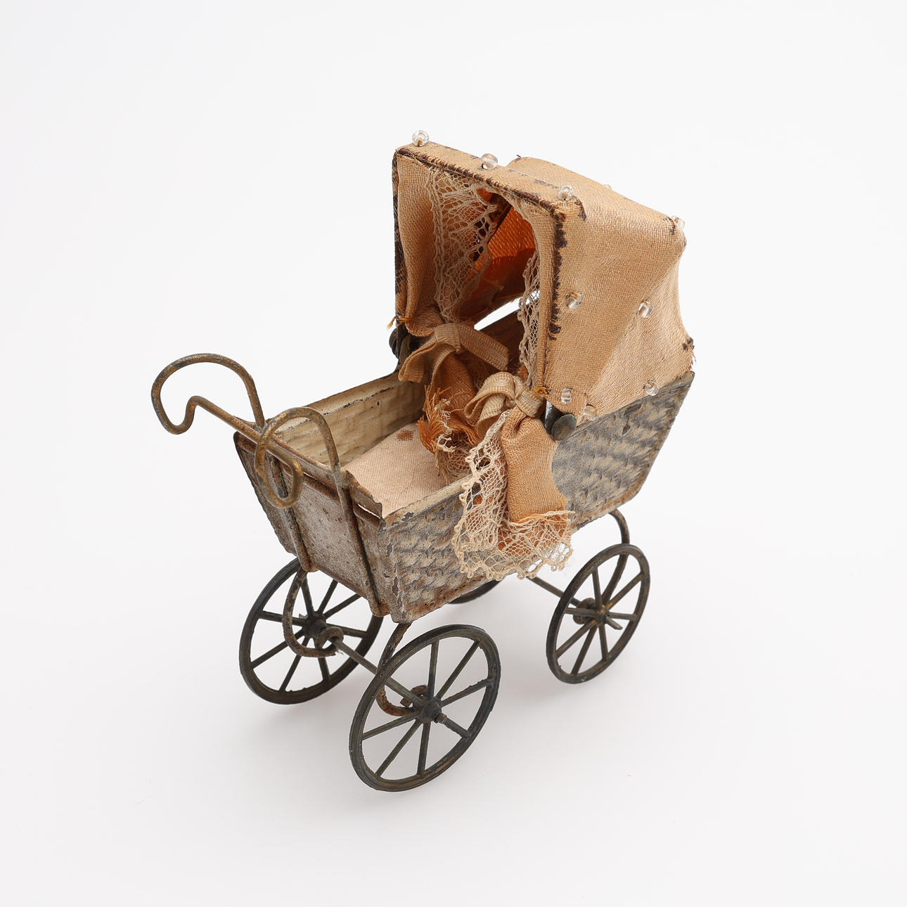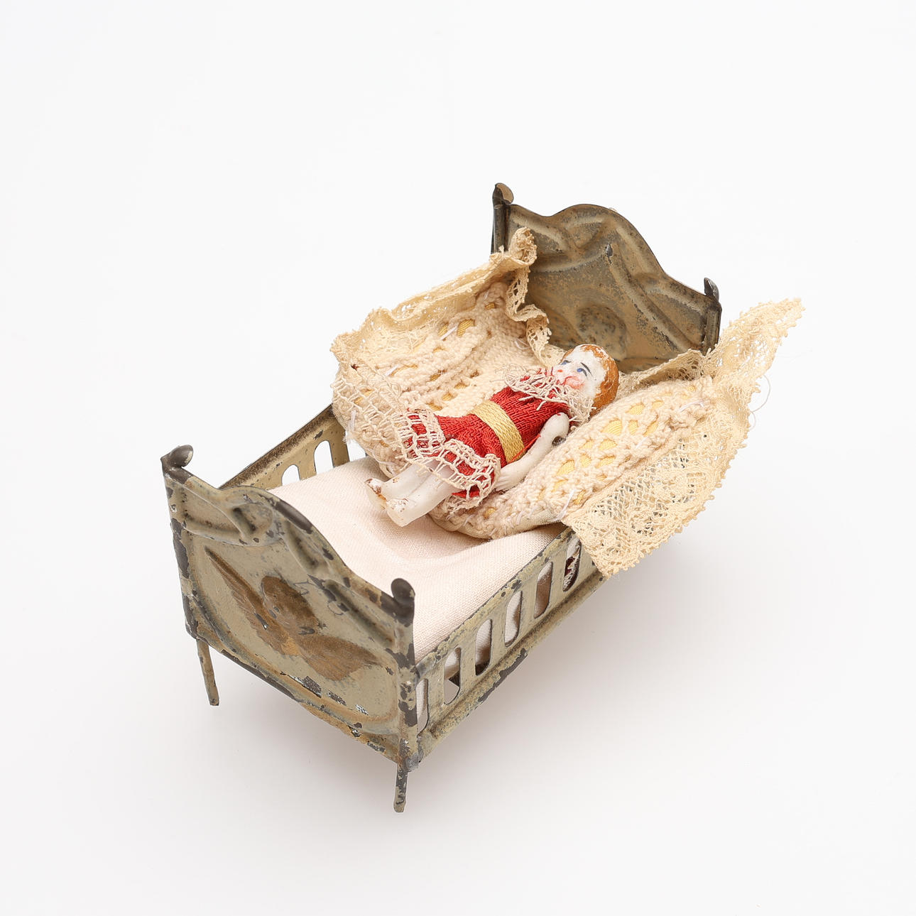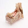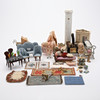 Soffa samt två fåtöljer, två sängar, bord, hylla, klädskåp samt spis med medföljande kannor mm. Spis, höjd ca 15 cm. Dockor, fyra stycken, höjd ca 5,5 - 9 cm, exklusive ställ. Dockvagn, mattor, ljusskrona samt speglar och glas.