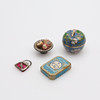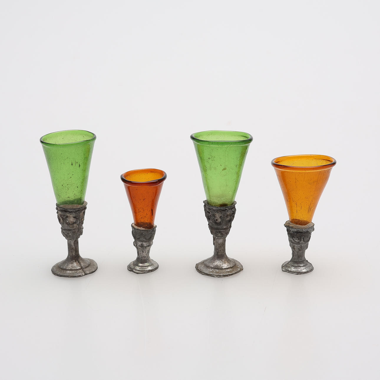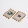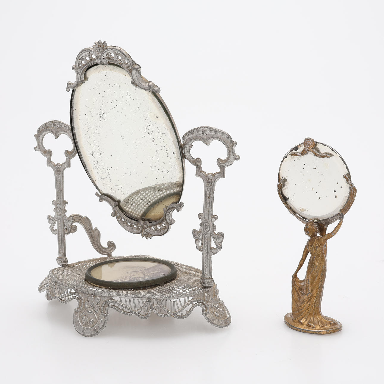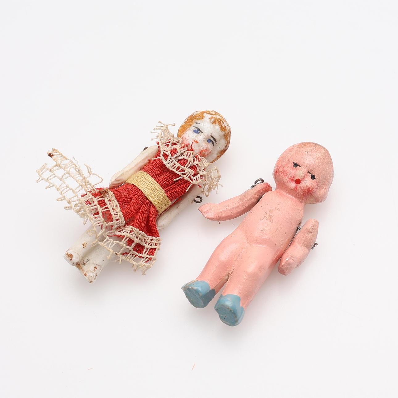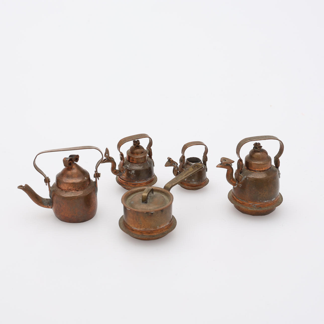 Soffa samt två fåtöljer, två sängar, bord, hylla, klädskåp samt spis med medföljande kannor mm. Spis, höjd ca 15 cm. Dockor, fyra stycken, höjd ca 5,5 - 9 cm, exklusive ställ. Dockvagn, mattor, ljusskrona samt speglar och glas.