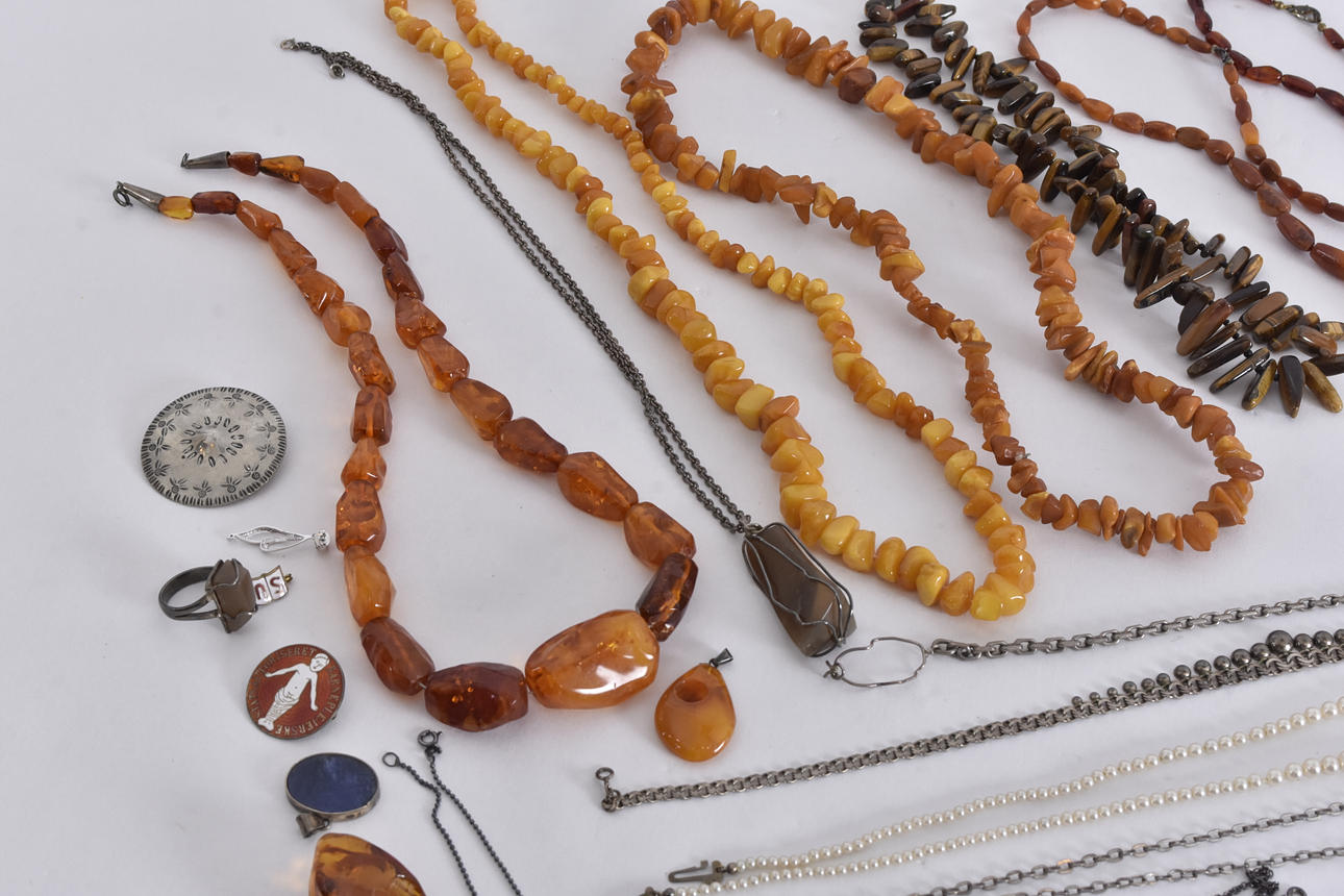 bärnsten, pärlcollier mm.