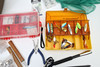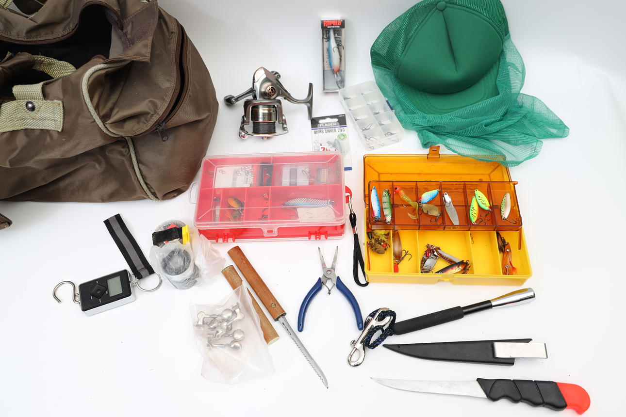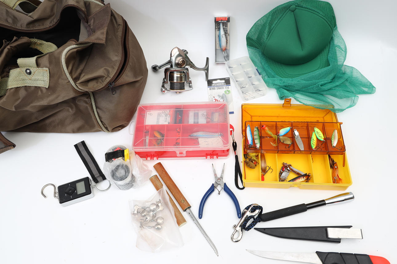 5002789. FISKEDETALJER, drag, väska, med mera.