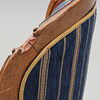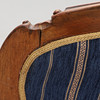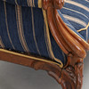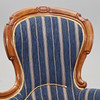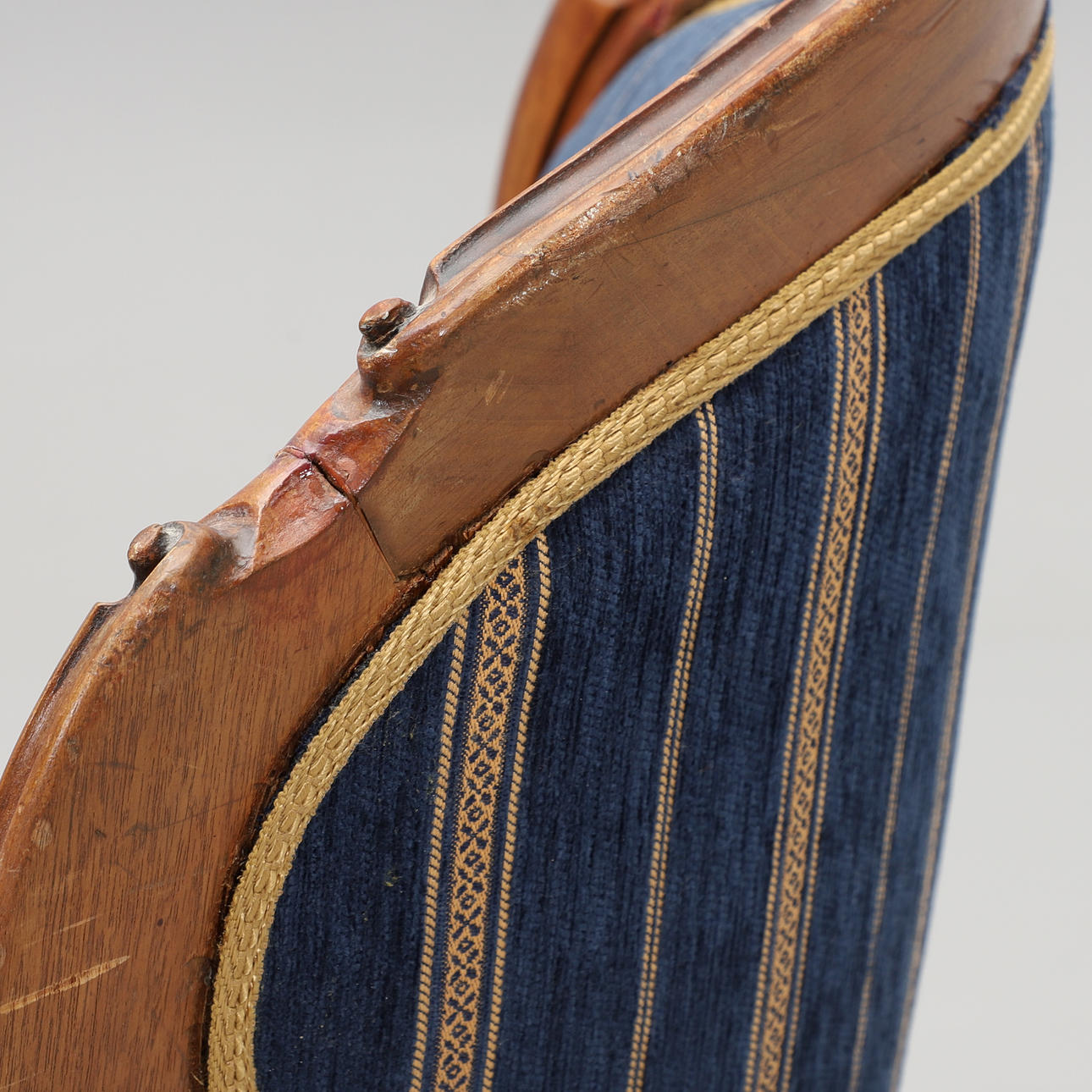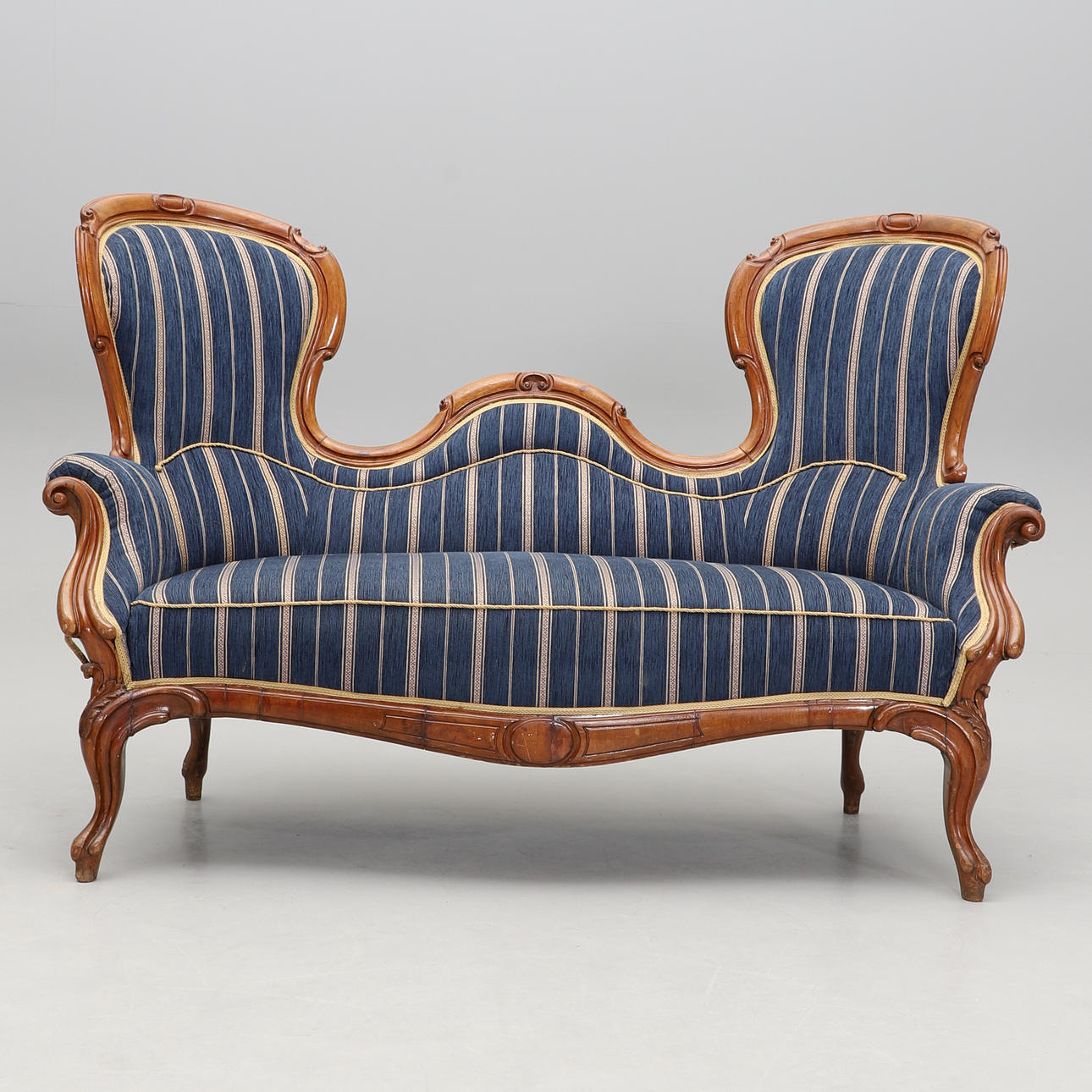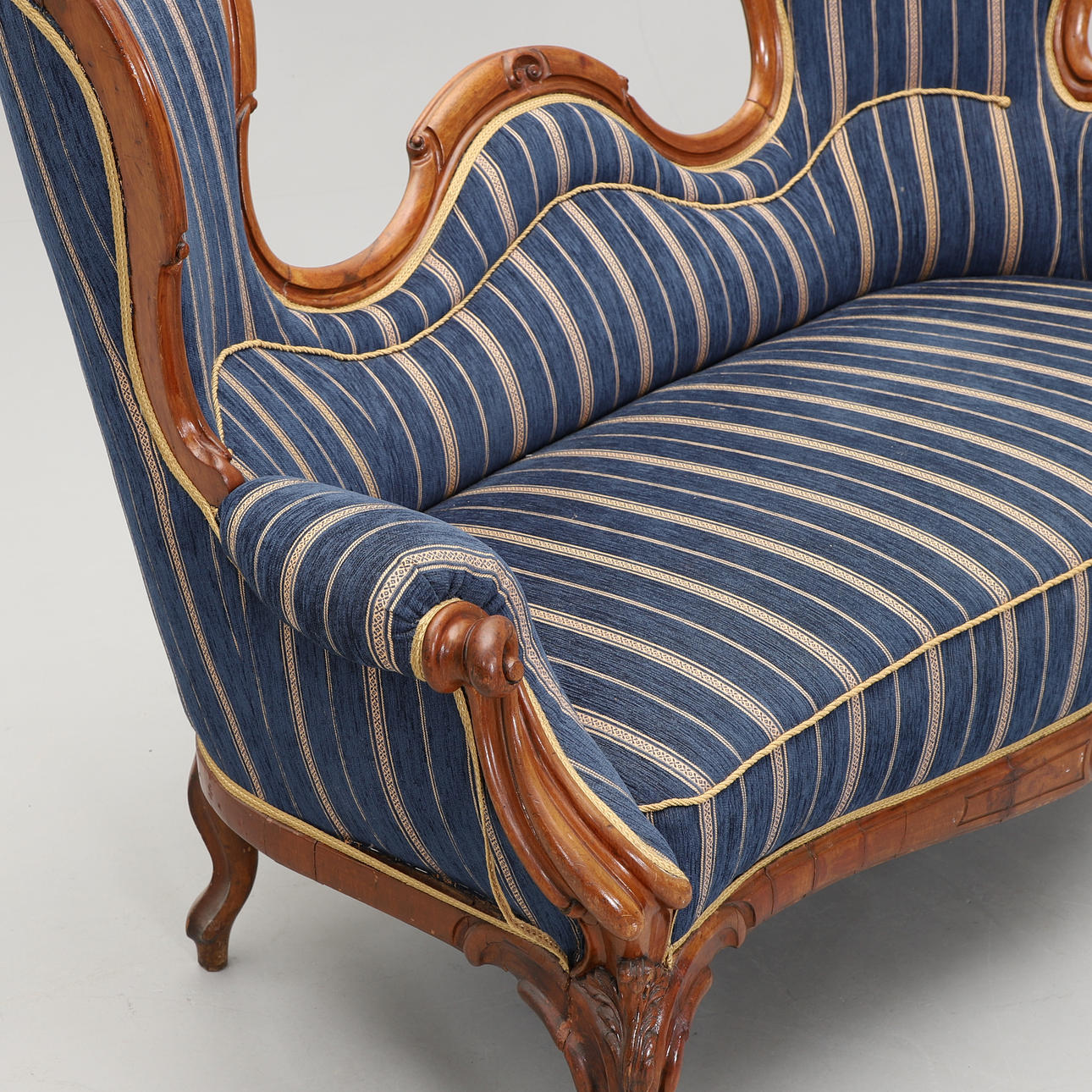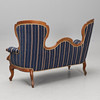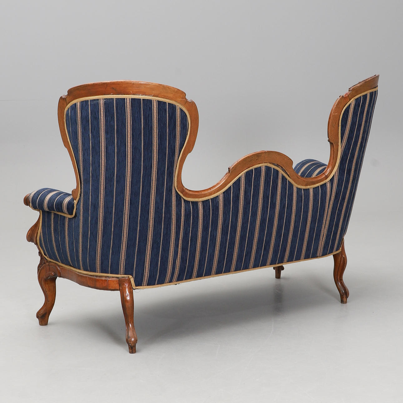 Betsat trä med skuren dekor. Svängd form. Stoppad, klädd i randigt tyg. Längd 182, djup c:a 80, höjd 110 cm.