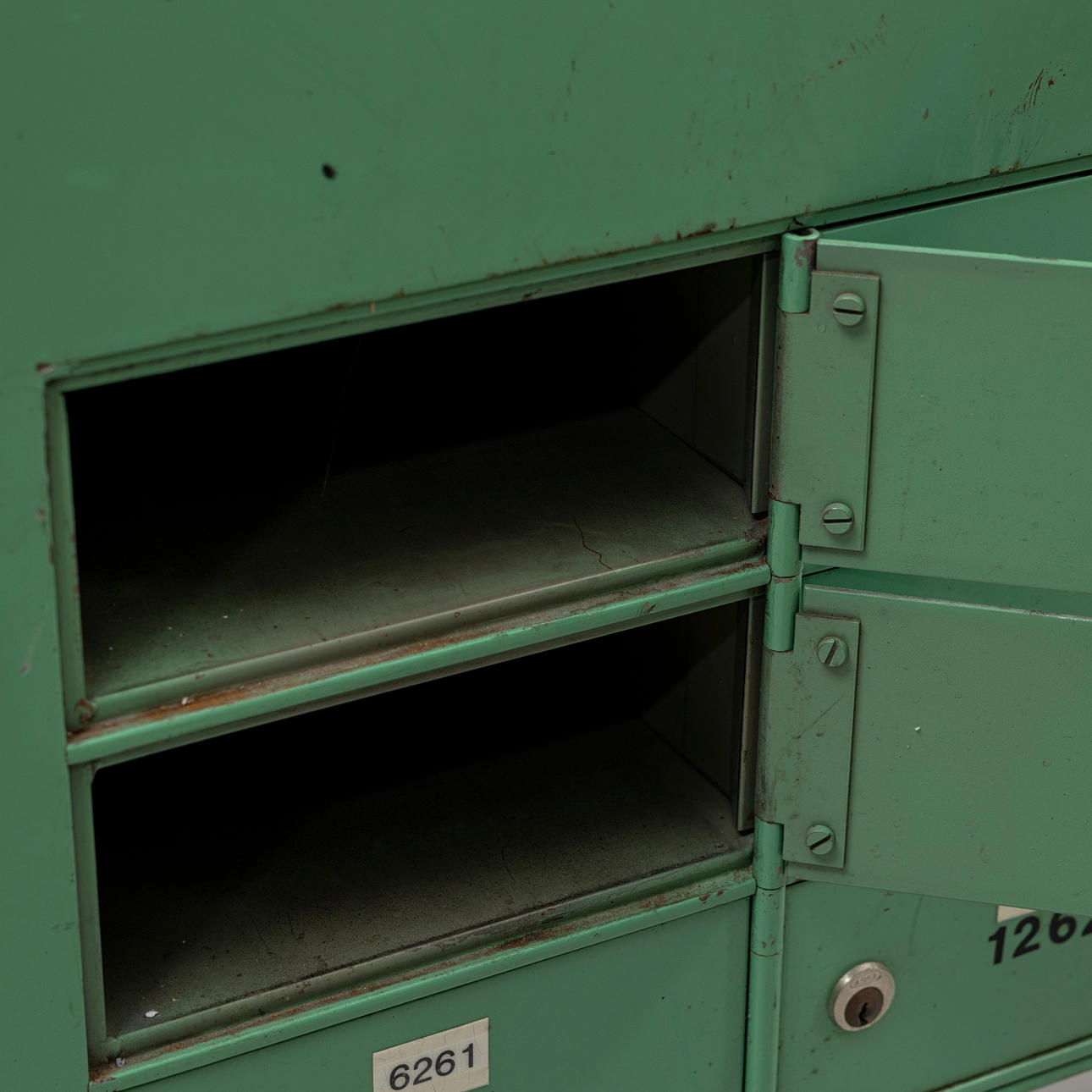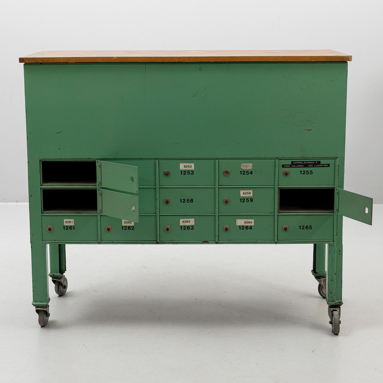 På hjul, jalusi, flertalet fack för brev.