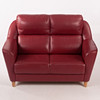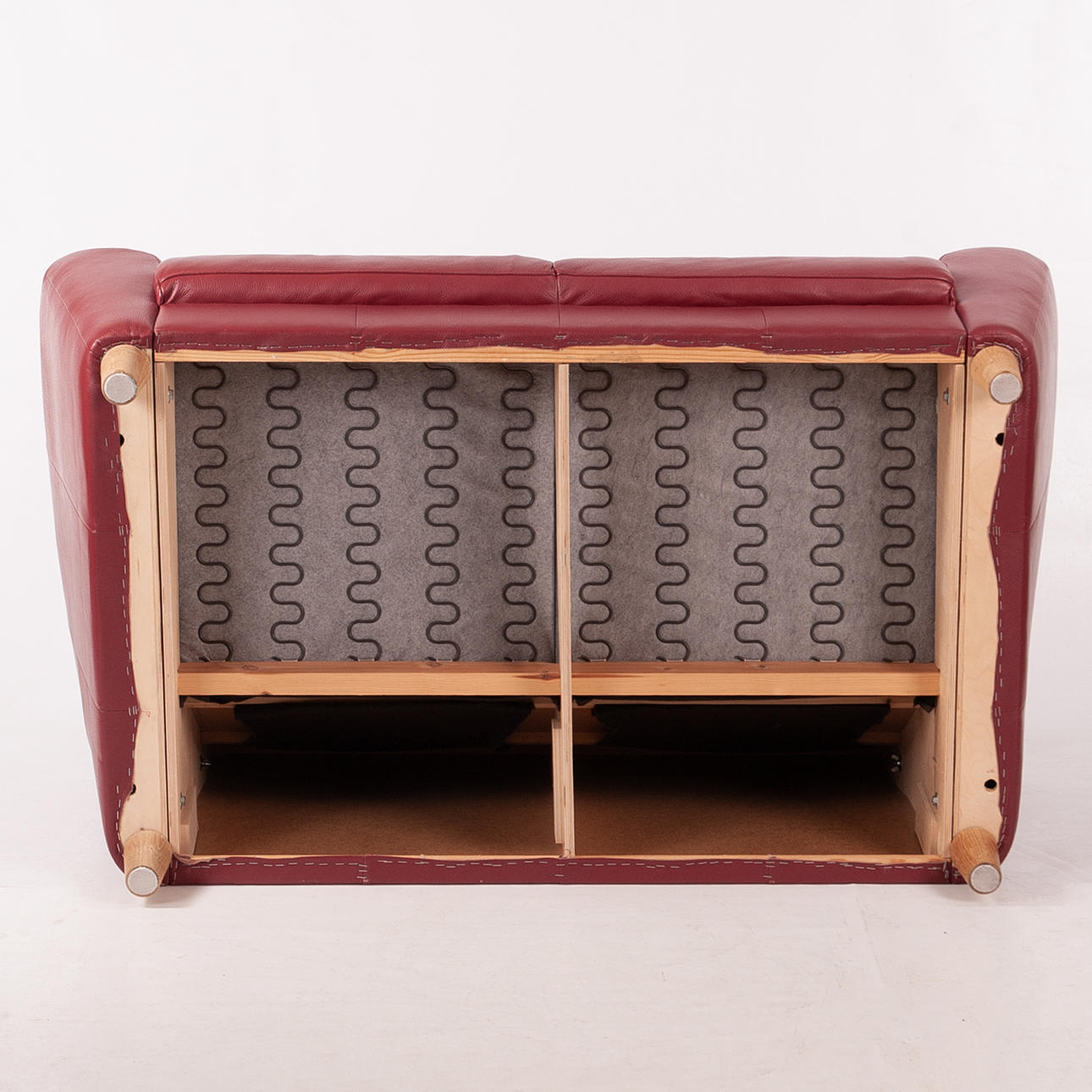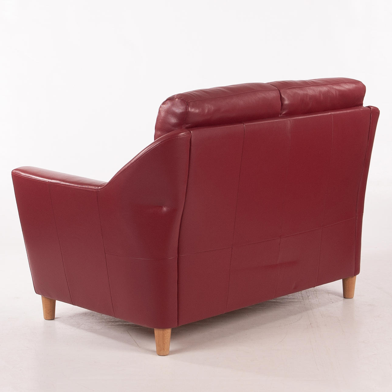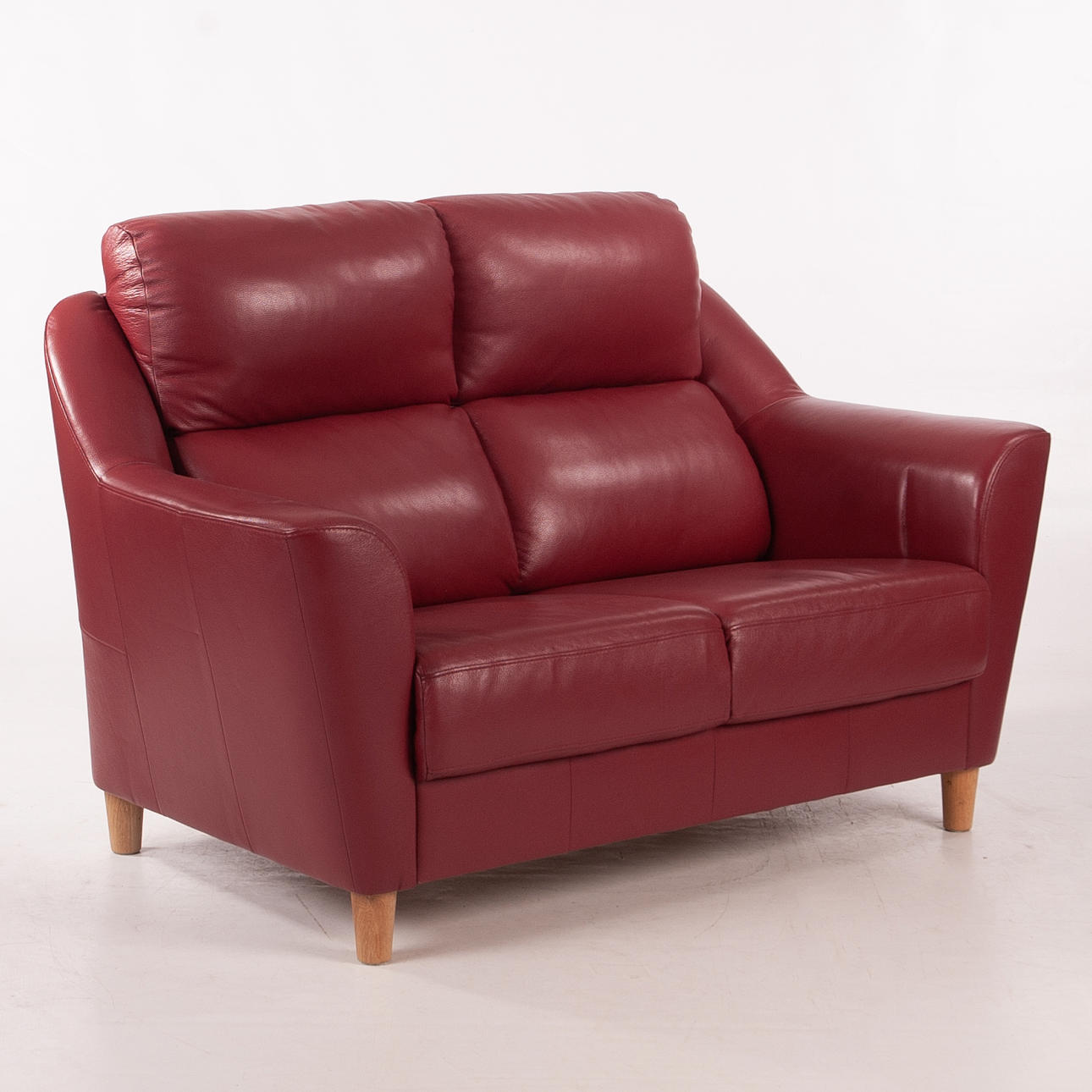 Tvåsitsoffa klädd i rött skinn med lös rygg- och sittplymå. Rundade armstöd och ben i trä.
