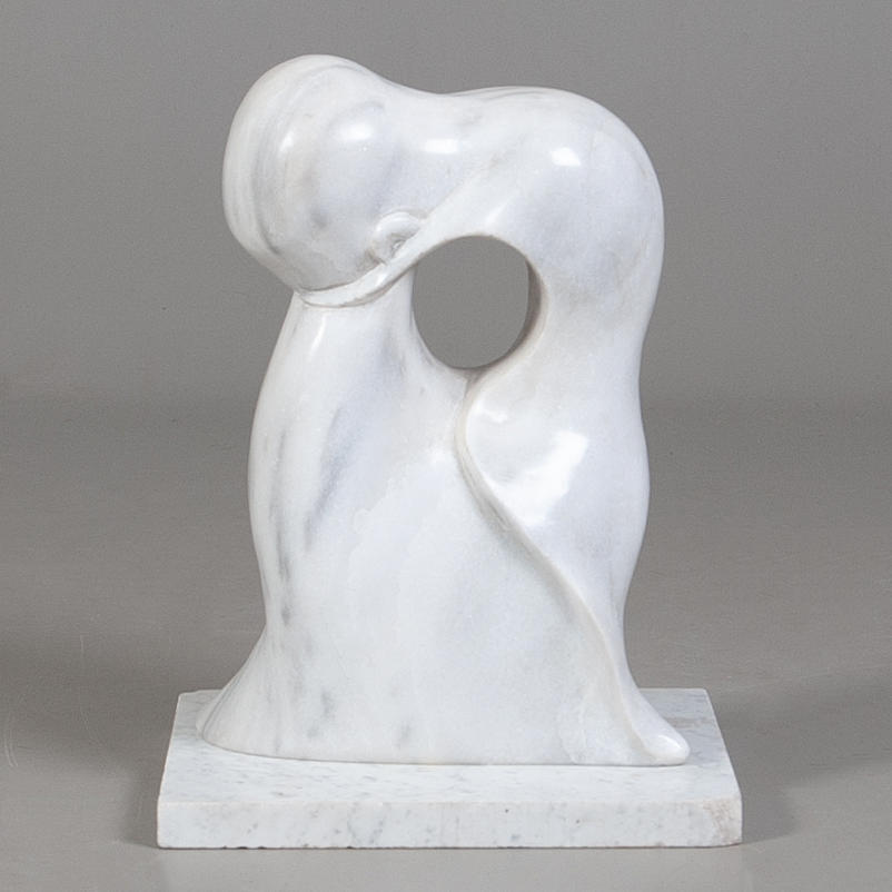 Abstrakt figurkomposition med mjukt modellerade former. Utförd i vit Carraramarmor.