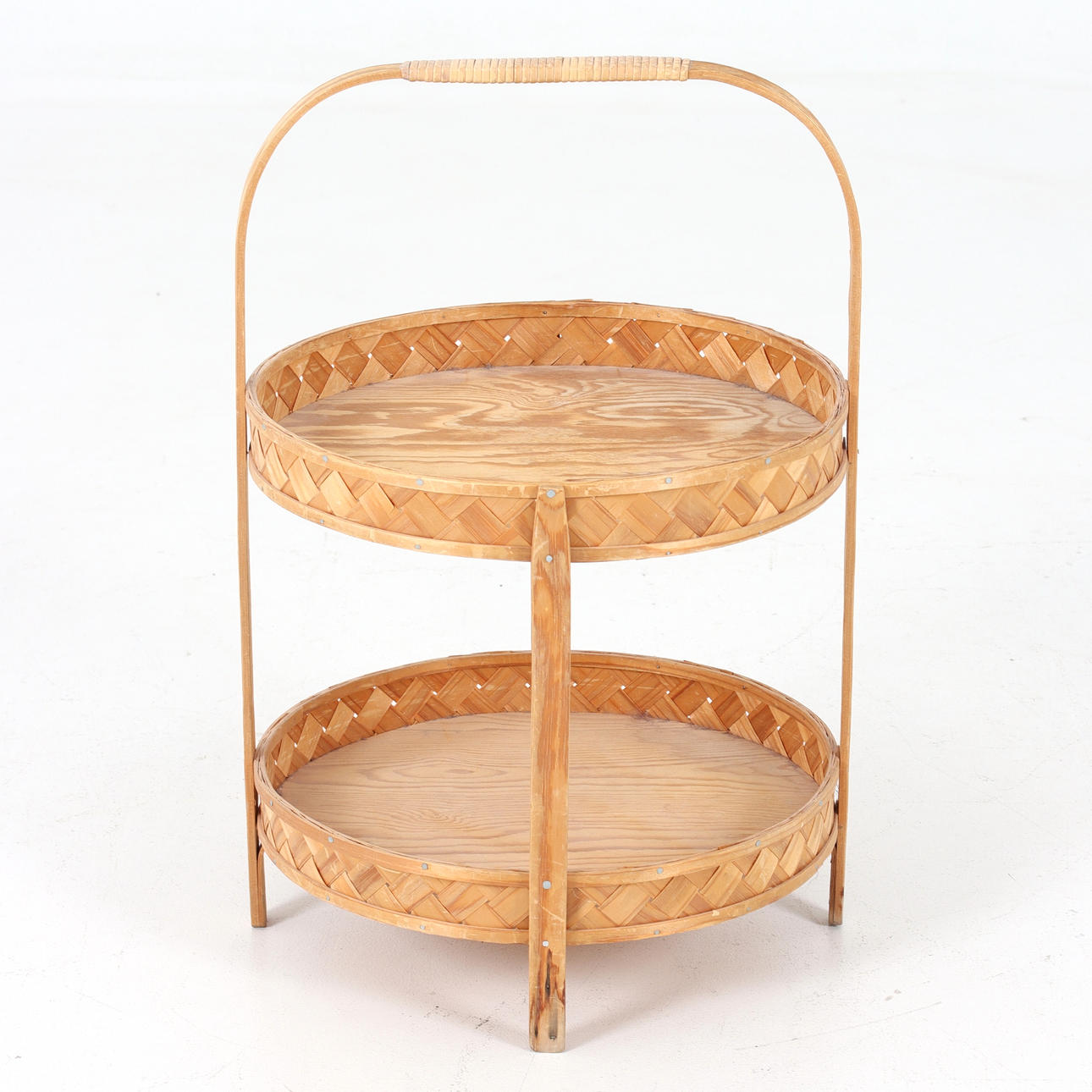 Bärbar, i rund form med två nivåer. Handtag lindad rotting,