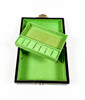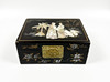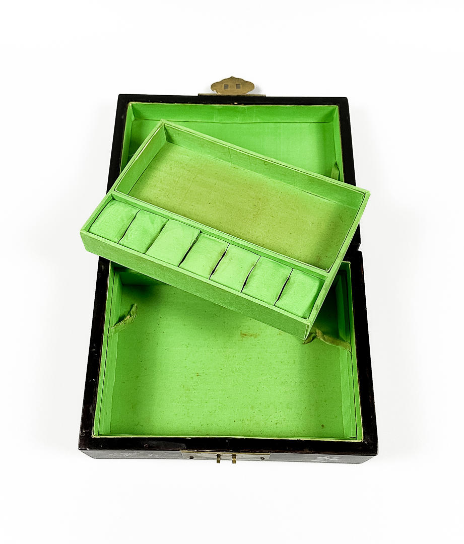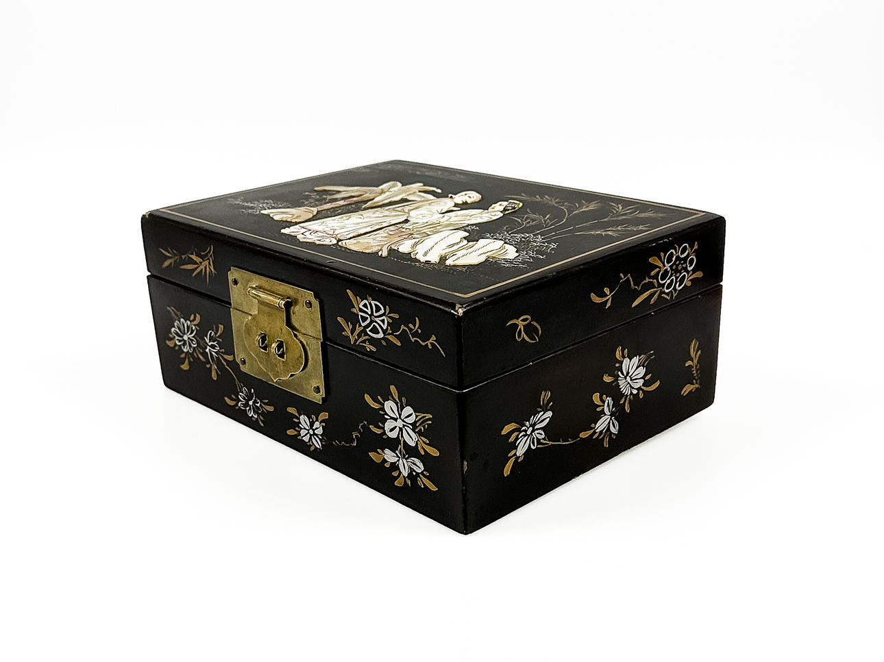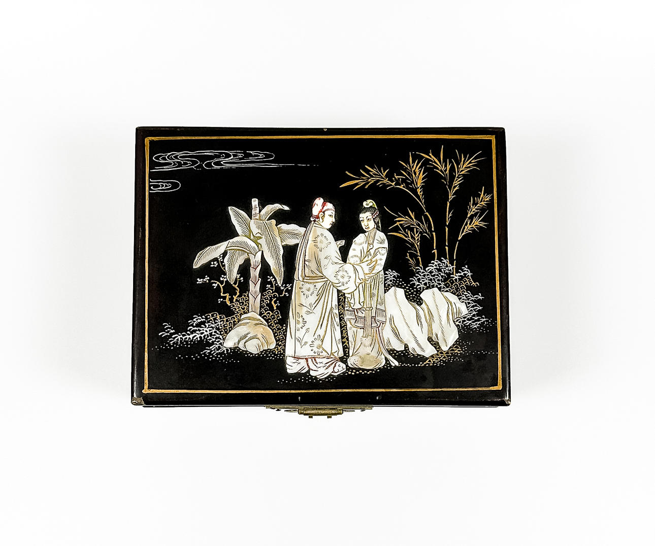 Handmålat trä, skuren pärlemor i relief. Mässingdetaljer